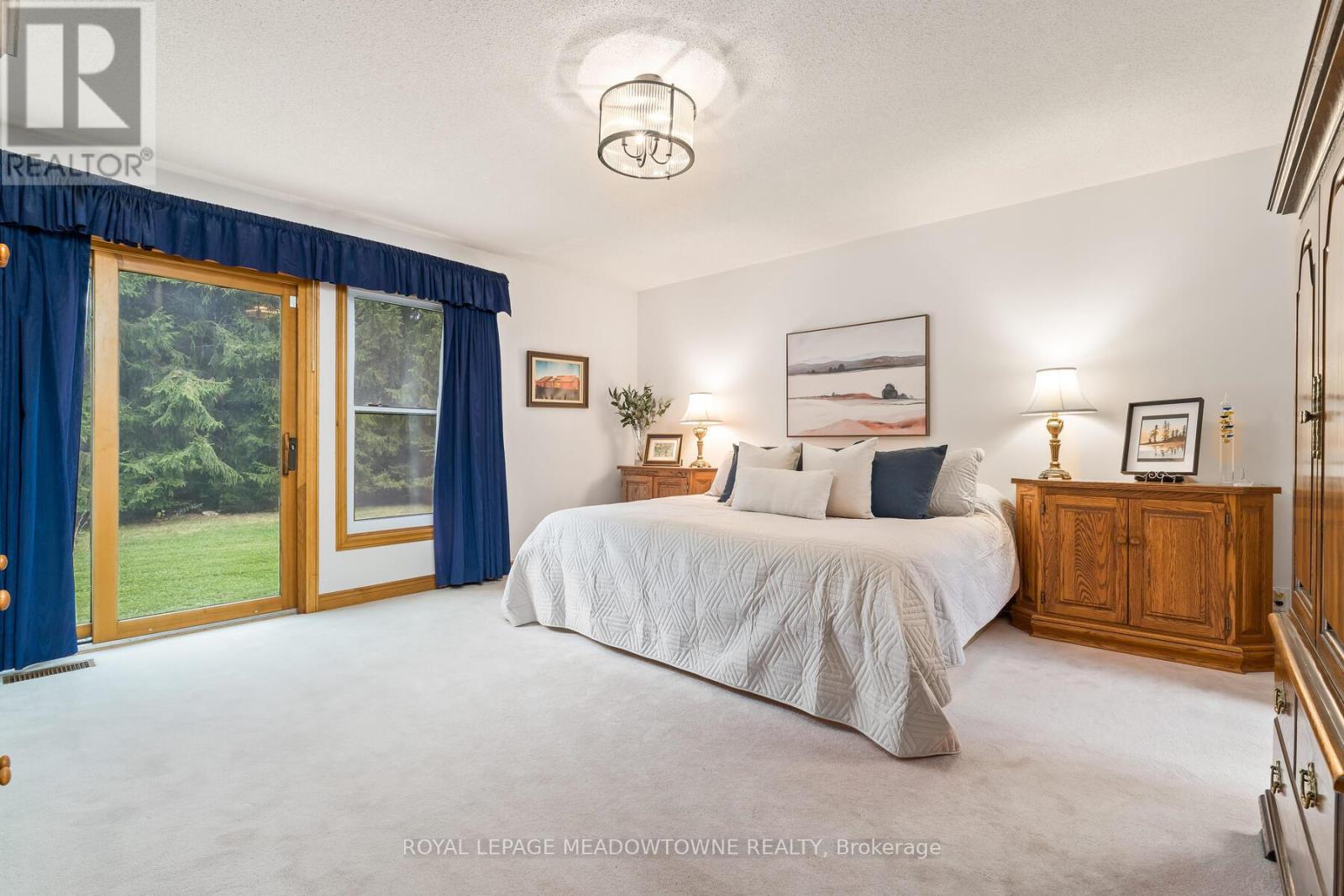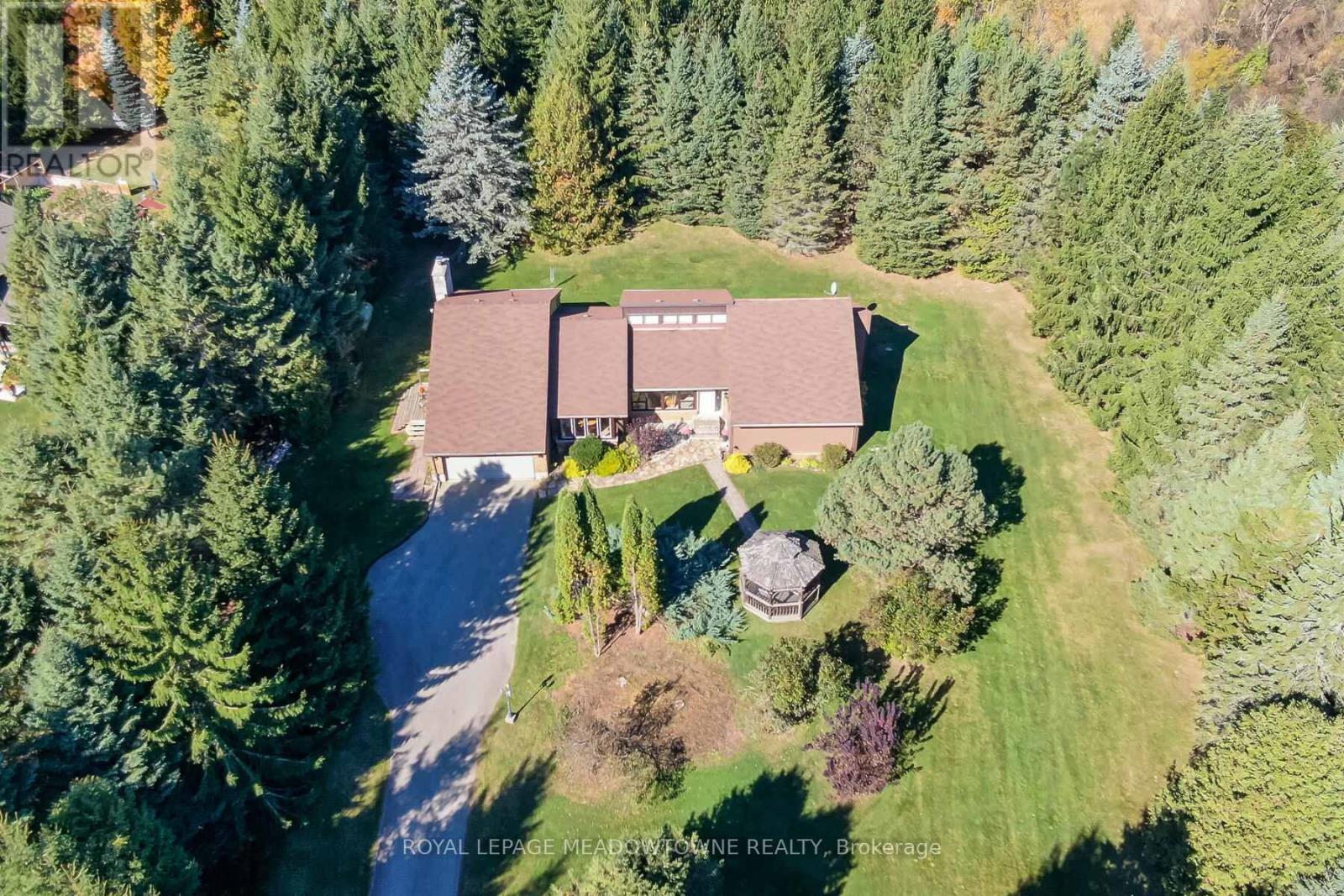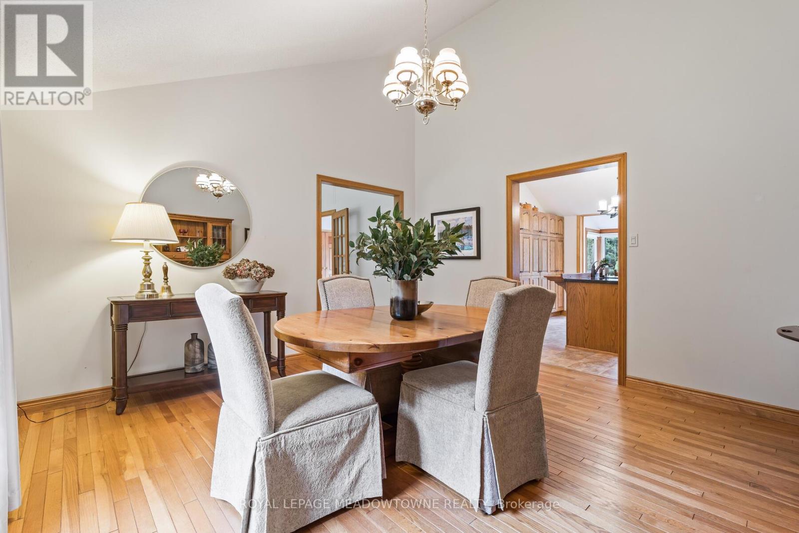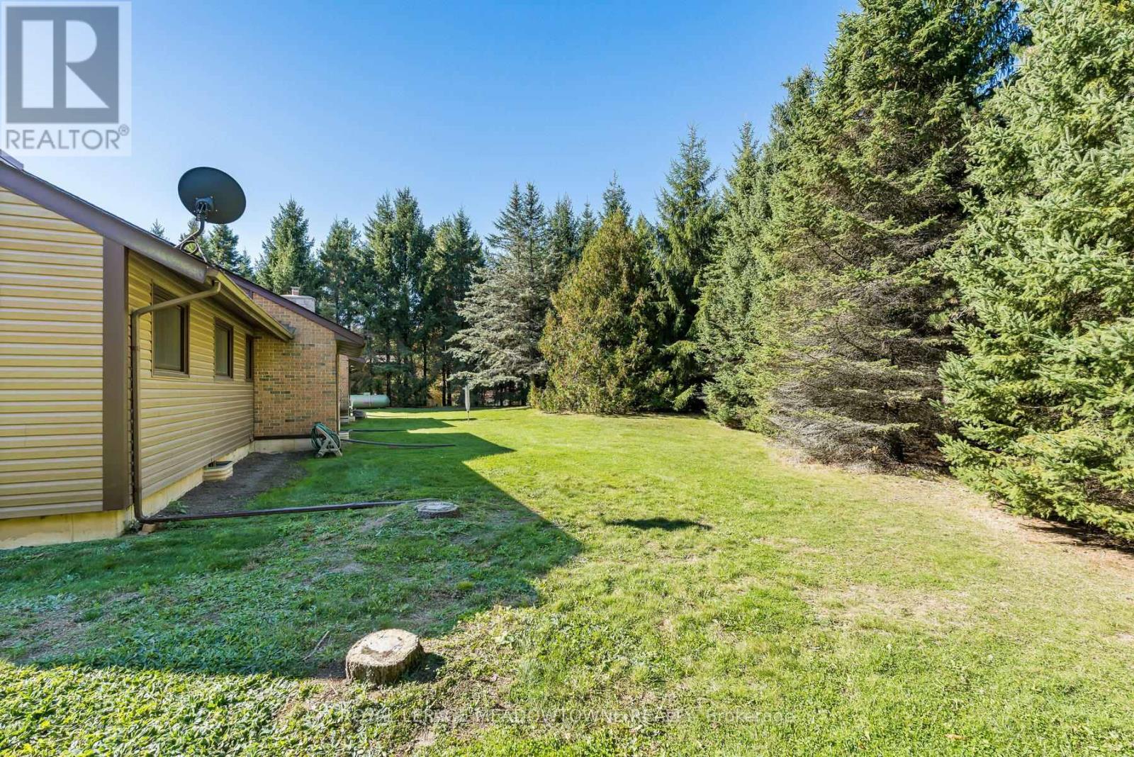 Fabulous bungalow on private 2 acre lot in prime location in Halton Hills. Quiet pocket of custom homes just minutes to Georgetown, Acton, the Limehouse kilns and Bruce trail. Lovingly cared for by original owners. The principal rooms are quite large and all have gorgeous country views. The family room features a wood-burning fireplace and gleaming hardwood floors. Enjoy the sun-filled eat-in kitchen with granite counters and a huge wall-to-wall pantry. The primary suite offers a walkout to the yard plus a 4-pc ensuite and two closets. Main floor laundry with garage and side door entrance. There is a massive lower level that is currently finished as a rec room with loads of room for the large pool table, exercise area and it also features a separate room ideal for a bedroom or storage space. Nature abounds this beautiful property with numerous evergreens and its own little backyard forest with trails. The two-car garage is oversize and there is a super long driveway for all your guests' vehicles and your toys too. Shingles 2018, Furnace rebuilt 2023, many updated windows. Survey available. Enjoy the peace and quiet of the country living just minutes to town. (id:51158)
