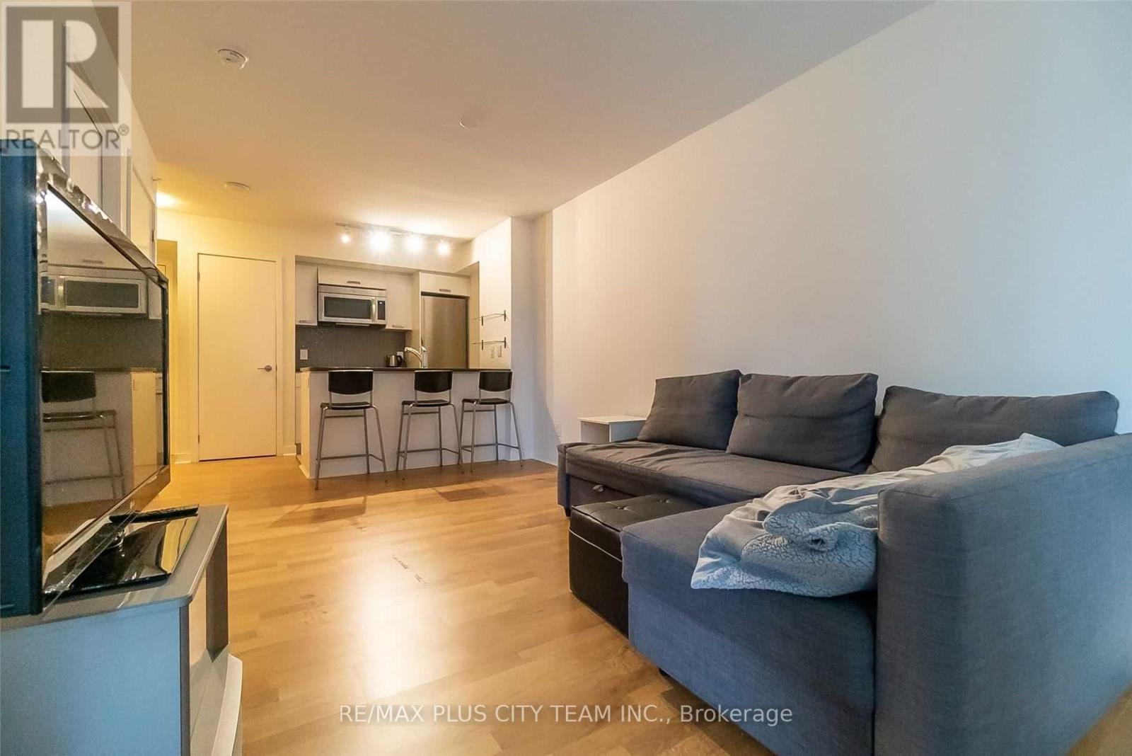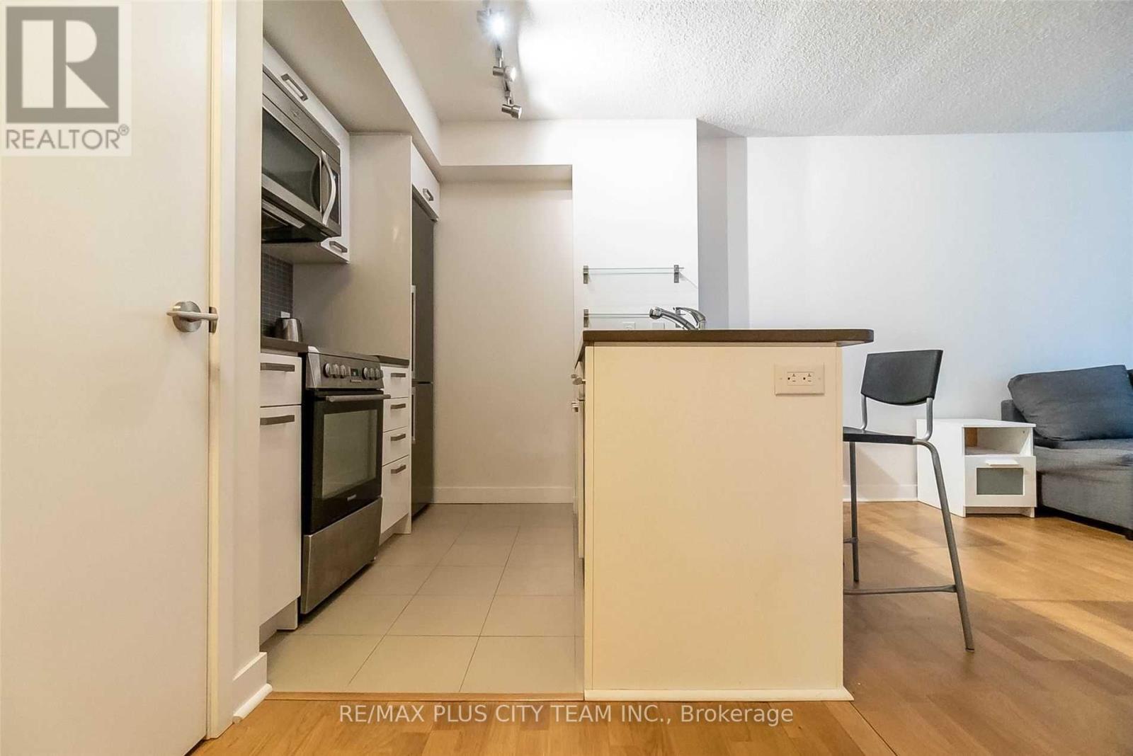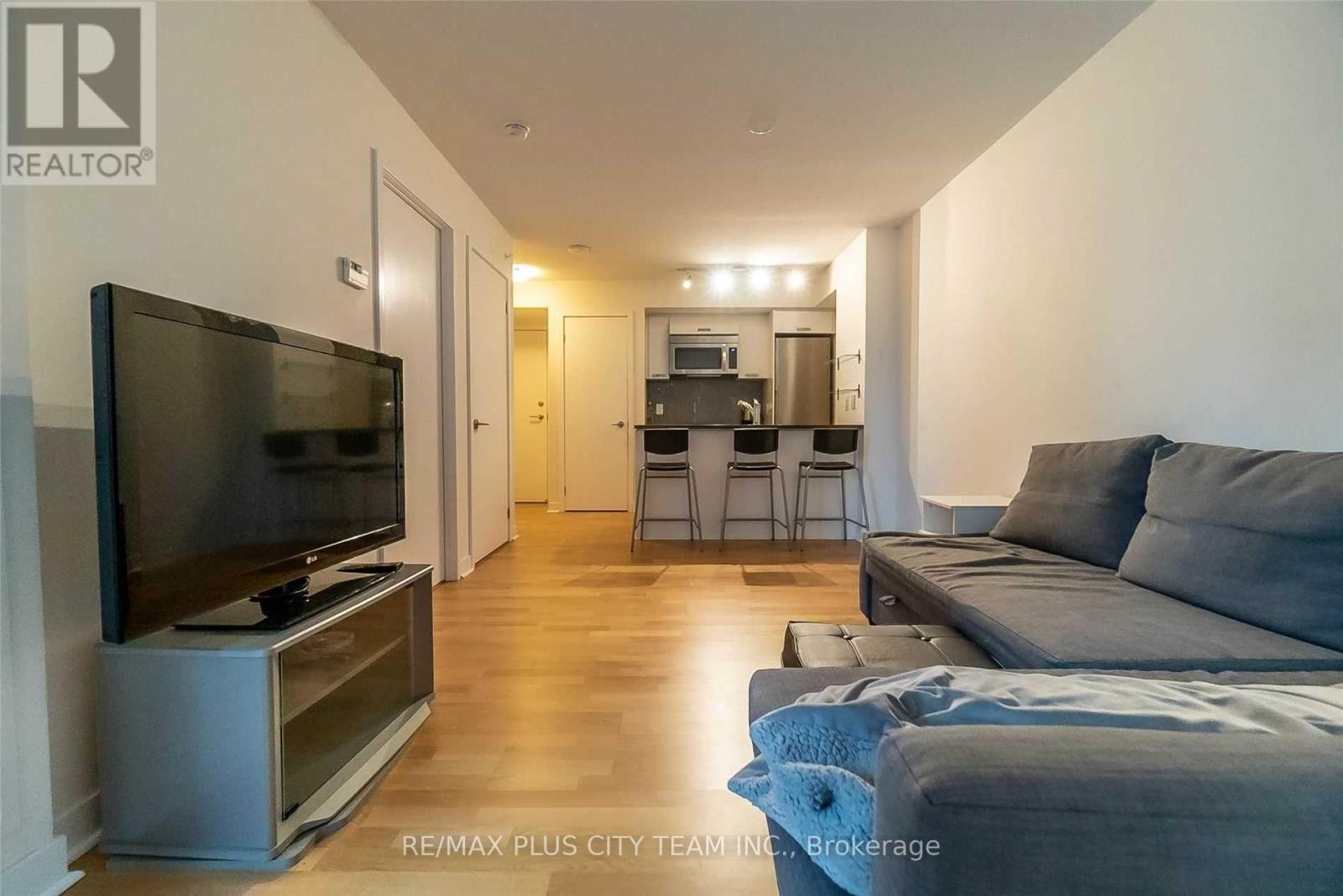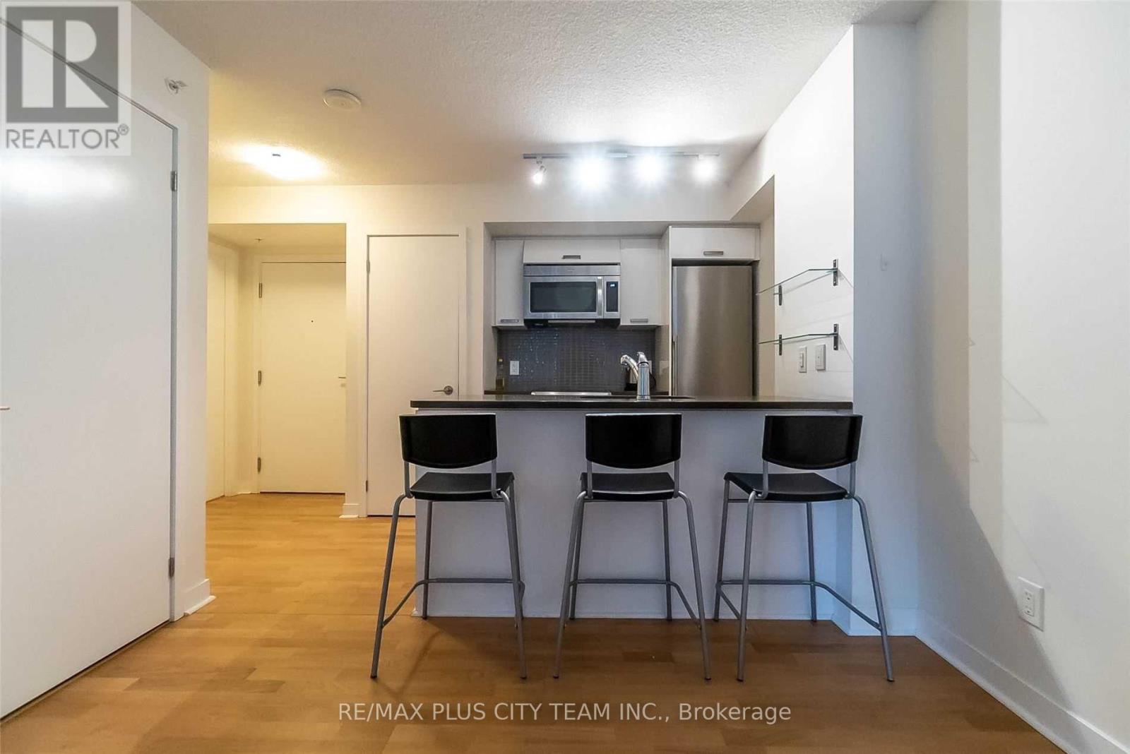 Enjoy open-concept living in this 1-bedroom, 1-bath suite in the heart of the Entertainment District. The bright living and dining area features durable laminate flooring and a large window that fills the space with natural light, plus a walkout from the living room to a 43 sq ft balcony for fresh air and city views. The modern kitchen offers stainless steel appliances, quartz counters, sleek cabinetry, and a convenient breakfast bar for casual meals or work-from-home days. The bedroom is a comfortable retreat with space for a queen bed and storage. In-suite laundry adds everyday convenience. Residents enjoy outstanding building amenities including a fitness centre, party and media rooms, concierge, and inviting lounge spaces. Prime location steps to St. Andrew Station, the 503 streetcar, Rogers Centre, CN Tower, the Financial and Entertainment Districts, world-class dining, shopping, the PATH, and more. Move-in ready and fully furnished for easy downtown living. *Please note that the photos are from a previous listing. (id:51158)