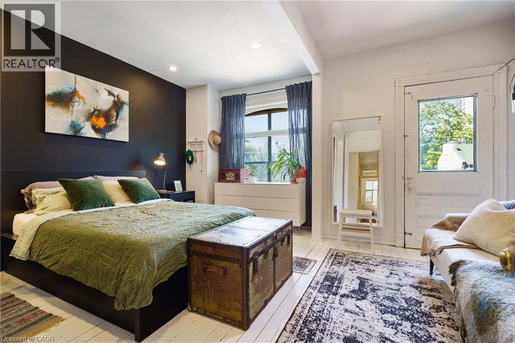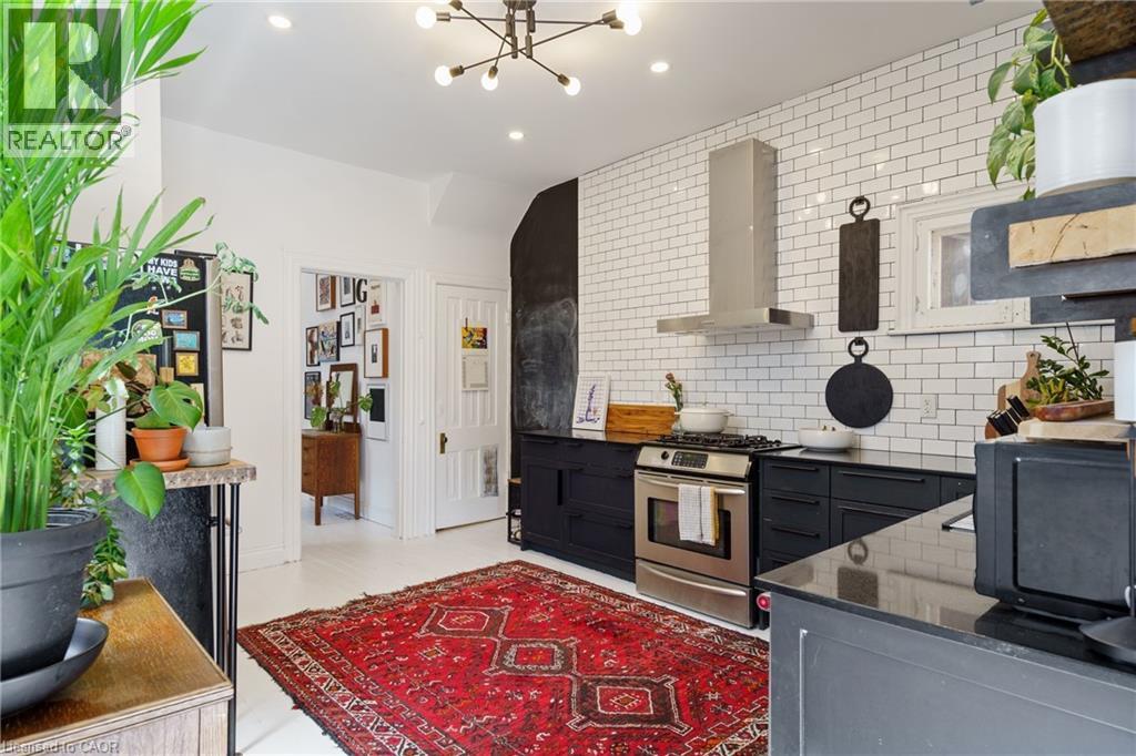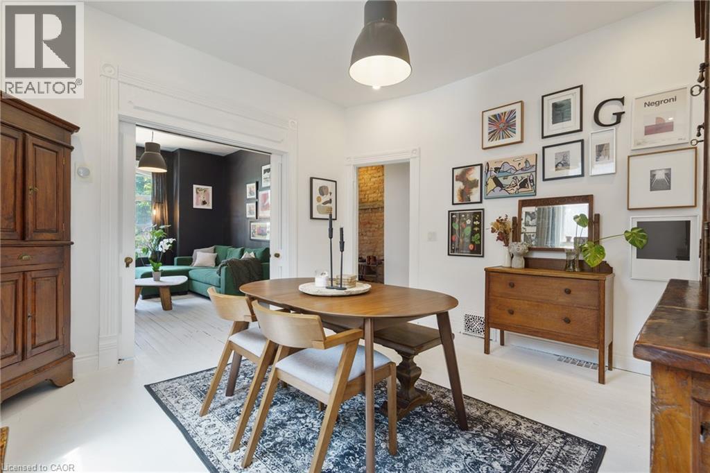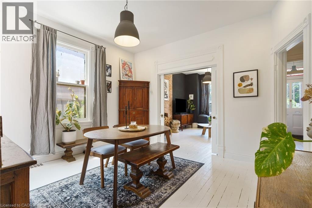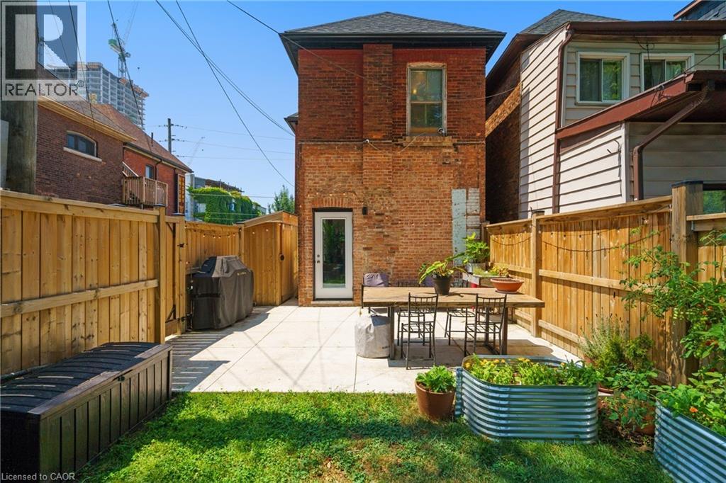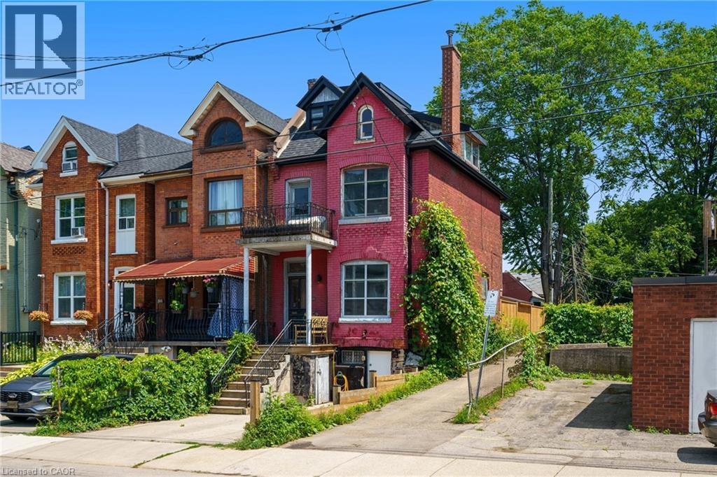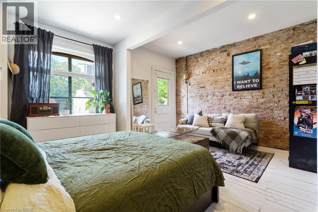 Hard to ignore charm: Exposed brick, original tongue-and-groove pine floors, restored doors and hardware, detailed millwork, soaring ceilings, and industrial-chic finishes. The spacious Dining Room flows into a bright Living Room with a decorative original fireplace. The chef’s Kitchen stuns with floor-to-ceiling subway tile, quartz counters, reclaimed slab shelving, and access to a backyard oasis. Upstairs, the Primary Bedroom with balcony feels grand yet cozy, while the middle Bedroom makes a perfect office with a huge closet. Bedroom-level Laundry leads to a stunning bathroom with marbled walk-in shower and built-in seating; an additional bathroom features a luxurious soaker tub. Every detail blends casual comfort with upscale design. The third level offers a versatile attic-turned-bedroom (with spray foam insulation professionally completed), plus rear unfinished attic space. Below, the walkout Basement includes storage and a roughed-in bathroom. Updates include: Custom shed (2024), eaves/flashing (2022), backyard fence with hidden laneway gate (2021), AC & furnace (2019), and full roof, plumbing & electrical (2017). Bonus: Catharine St N is a one-way toward Cannon, making it quieter than you'd expect. Even better in person—don’t miss this! (id:51158)
