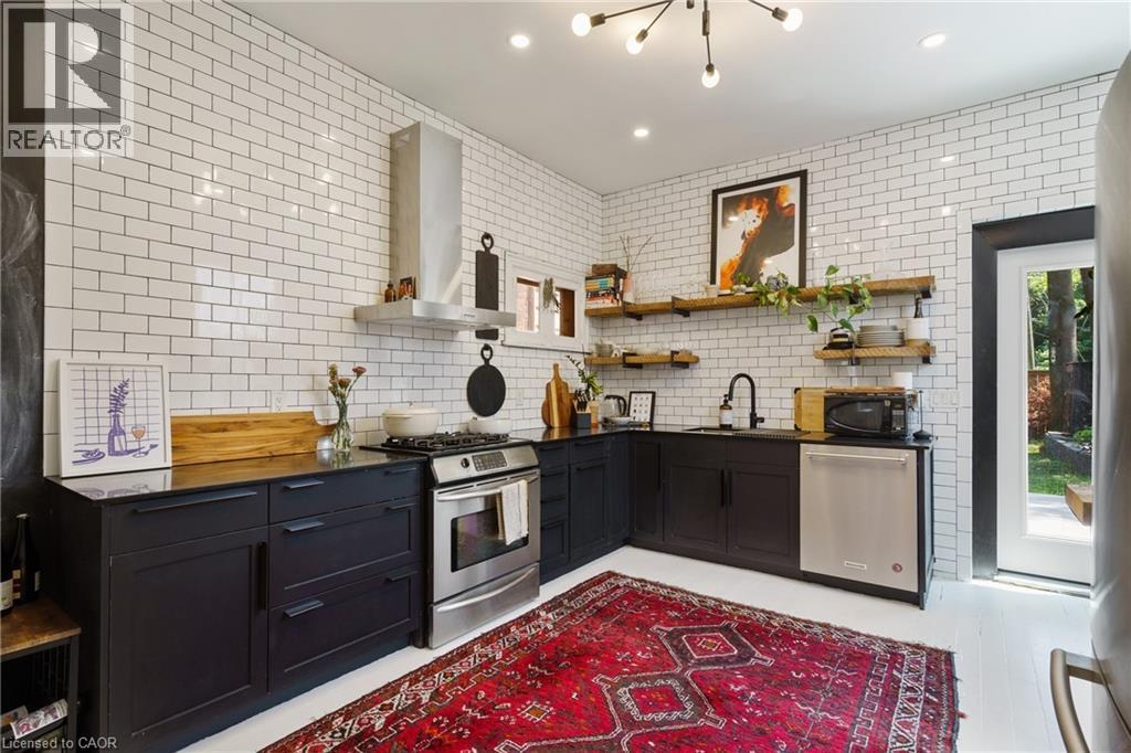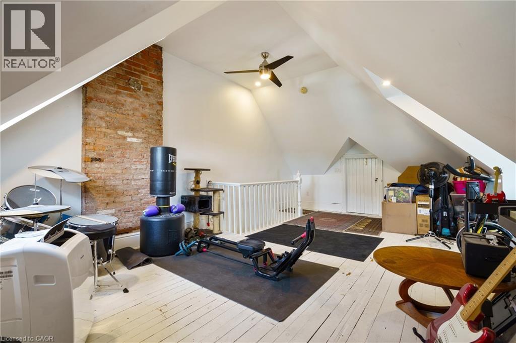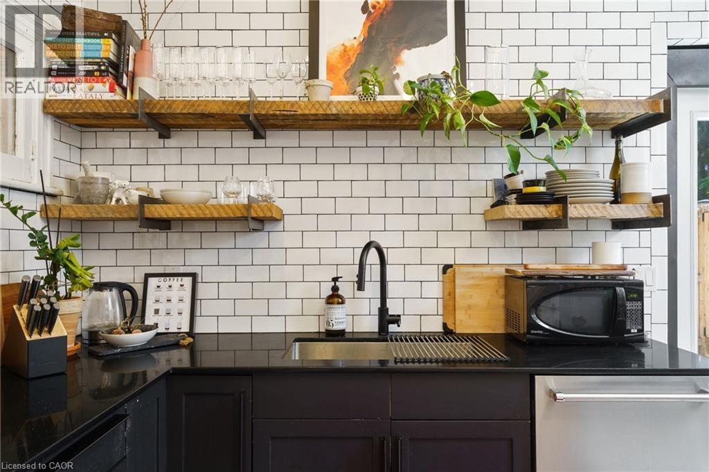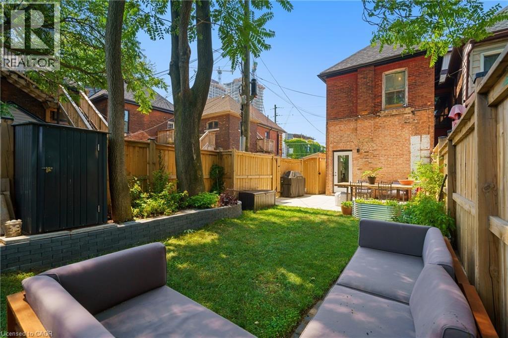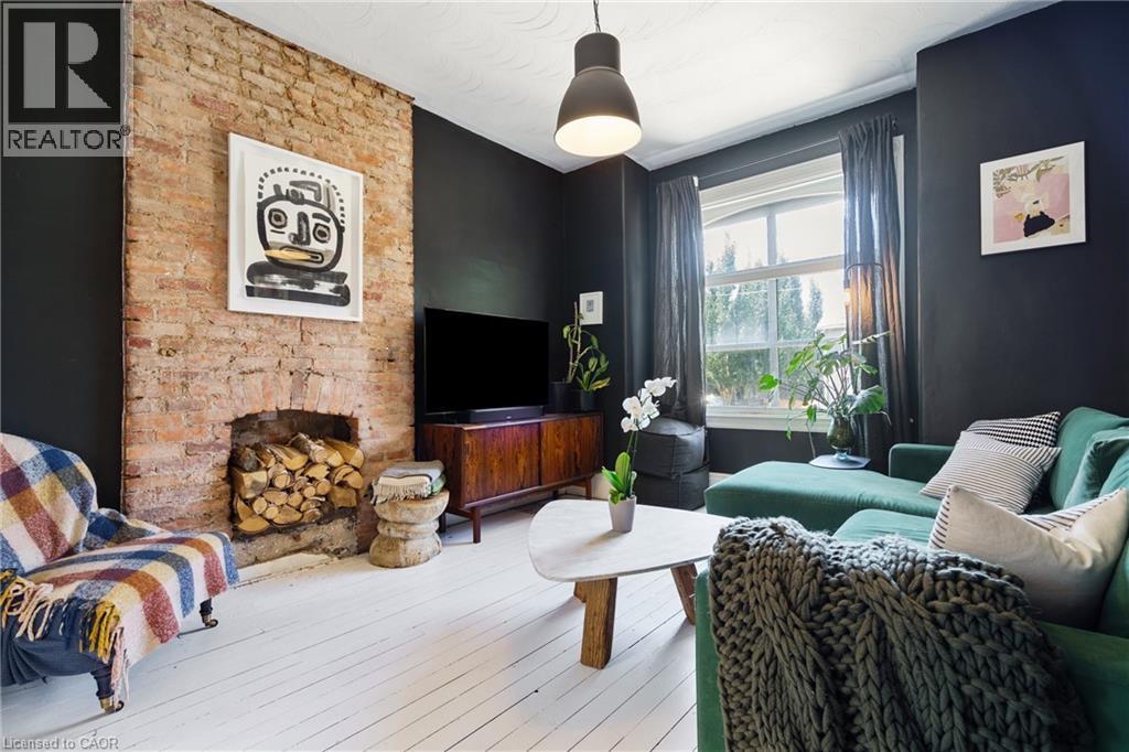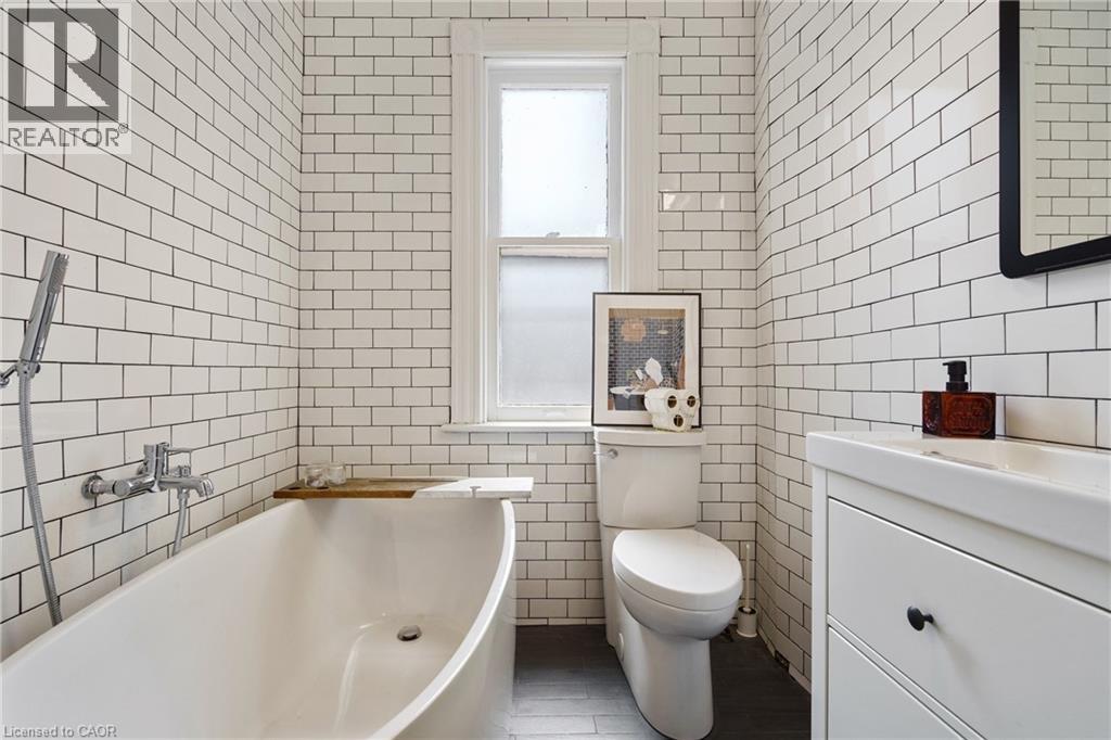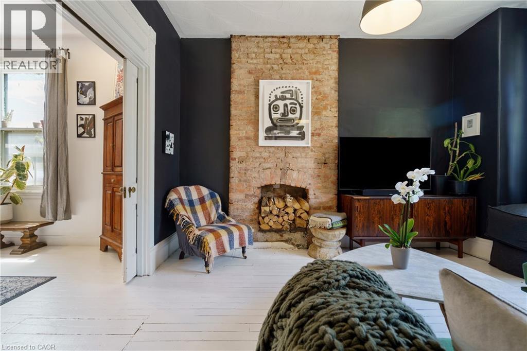 Hard to ignore charm: Exposed brick, original tongue-and-groove pine floors, restored doors and hardware, detailed millwork, soaring ceilings, and industrial-chic finishes. The spacious Dining Room flows into a bright Living Room with a decorative original fireplace. The chef’s Kitchen stuns with floor-to-ceiling subway tile, quartz counters, reclaimed slab shelving, and access to a backyard oasis. Upstairs, the Primary Bedroom with balcony feels grand yet cozy, while the middle Bedroom makes a perfect office with a huge closet. Bedroom-level Laundry leads to a stunning bathroom with marbled walk-in shower and built-in seating; an additional bathroom features a luxurious soaker tub. Every detail blends casual comfort with upscale design. The third level offers a versatile attic-turned-bedroom (with spray foam insulation professionally completed), plus rear unfinished attic space. Below, the walkout Basement includes storage and a roughed-in bathroom. Updates include: Custom shed (2024), eaves/flashing (2022), backyard fence with hidden laneway gate (2021), AC & furnace (2019), and full roof, plumbing & electrical (2017). Bonus: Catharine St N is a one-way toward Cannon, making it quieter than you'd expect. Even better in person—don’t miss this! (id:51158)