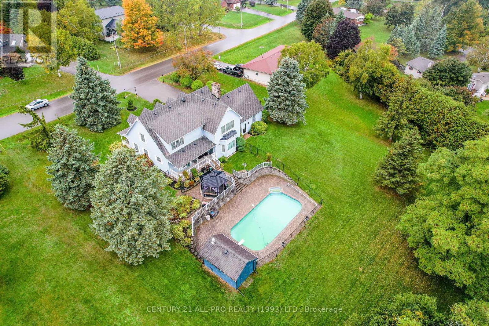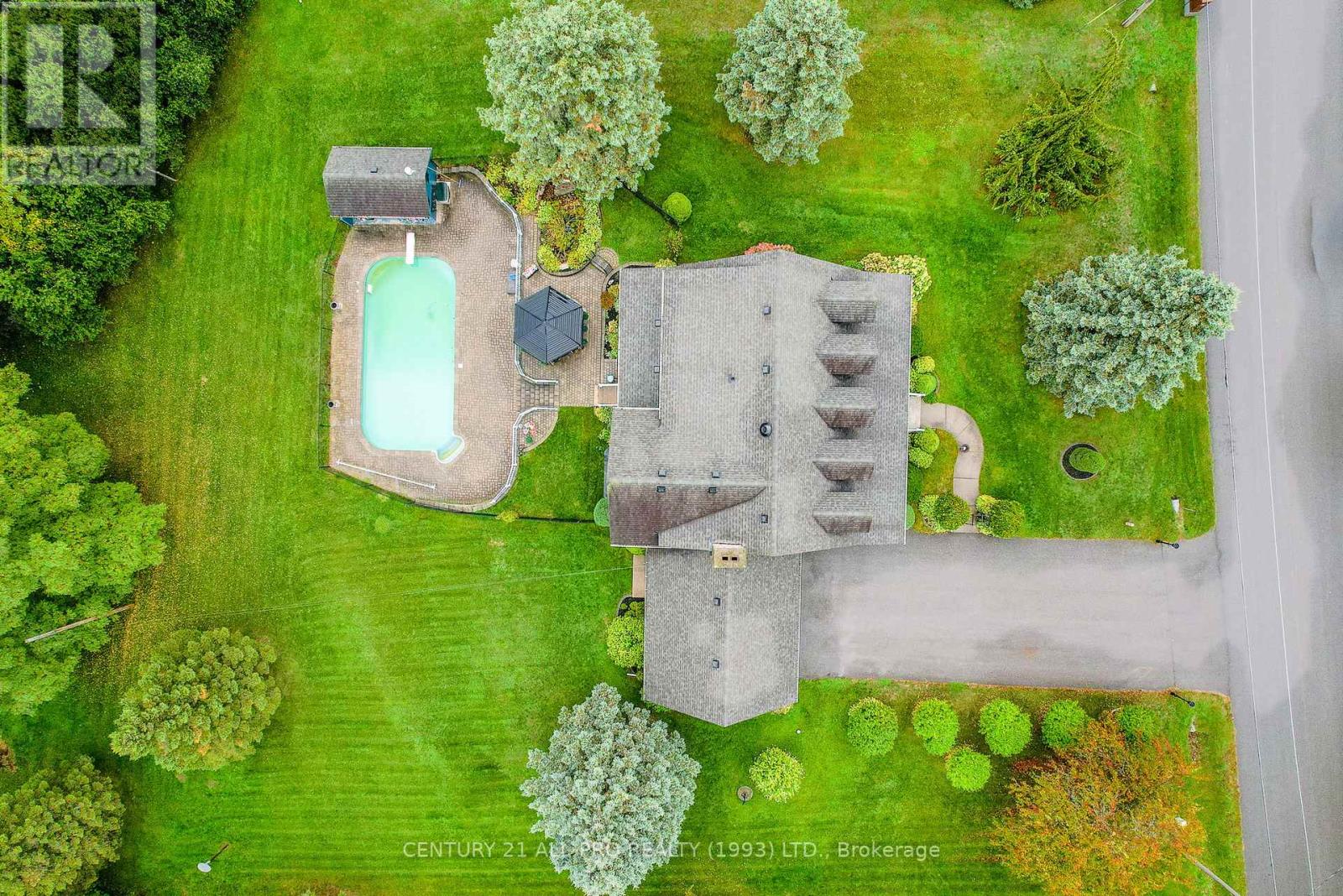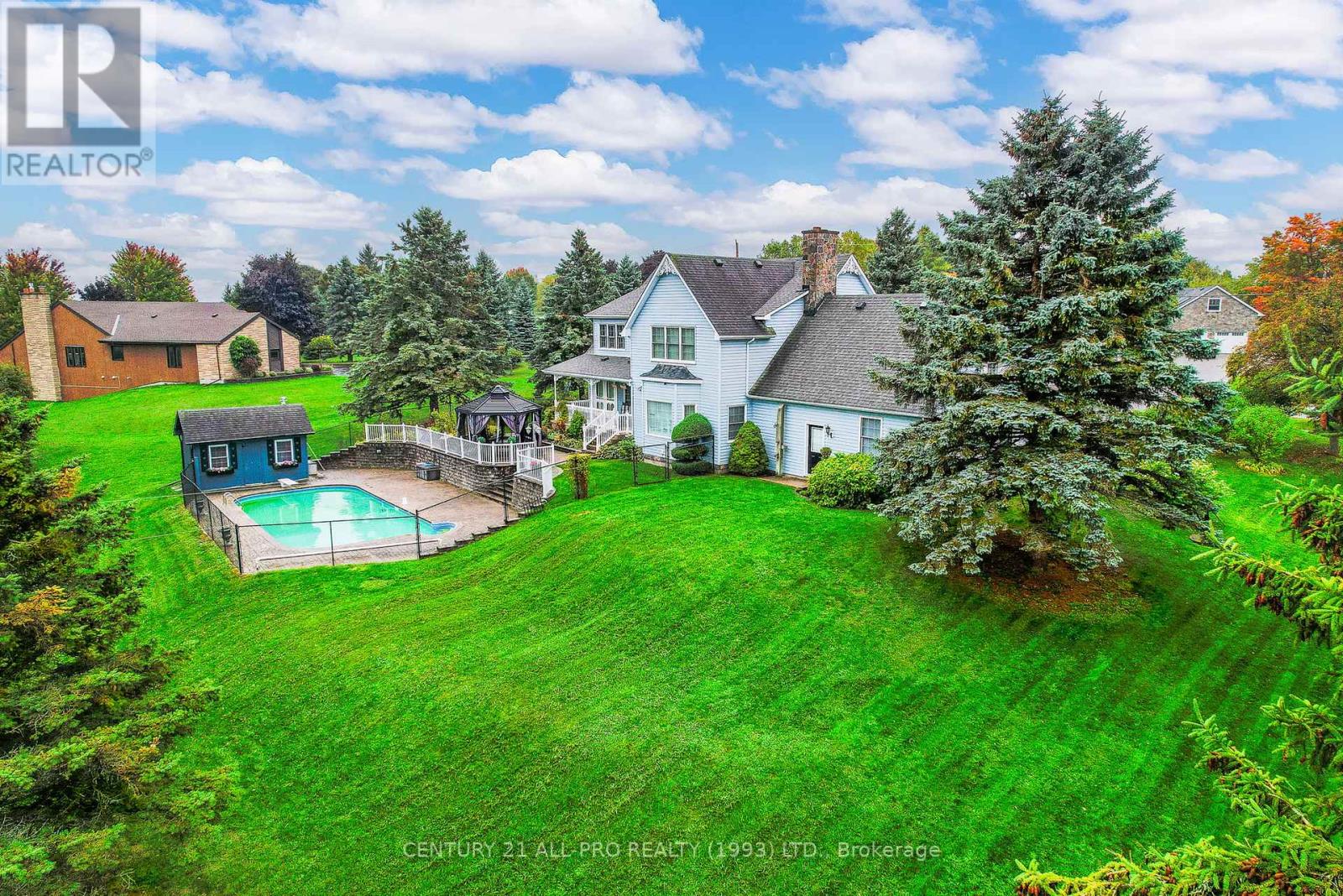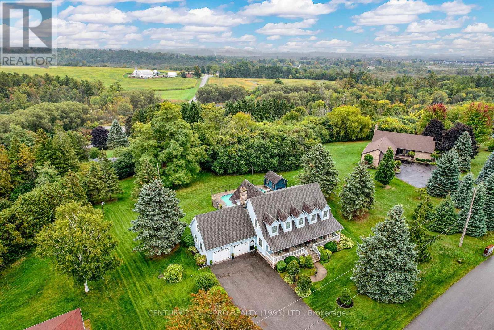 Are you looking for an executive home that offers quality with loads of space on 3 floors? Beautiful kitchen with granite counters with stainless steel appliances with adjoins walkout to backyard with Inground saltwater heated pool. Enjoy sitting on a covered front porch 8x42. This home has a grand entrance with spiral staircase. Other main floor features include laundry area, sunken family room with stone fireplace, separate living room and dining room with an extra space for home office. Quality flooring. Second level has a huge primary suite 14.4x19.2 with a walk through with closets leading to a 5 pc ensuite. 2 more bedrooms, laundry shoot, and 4 pc bath complete the upstairs. Lower level basement has a rec room, 2pc bath, games room, cold room, furnace room, and walk up to garage. Bonus out building has a 2 pc bath, change room area and storage for all the pool equipment. Driveway is oversized with the ability to hold 9 vehicles . Located Amongst many quality built homes. Views of the country side! Can also offer a quick closing! (id:51158)