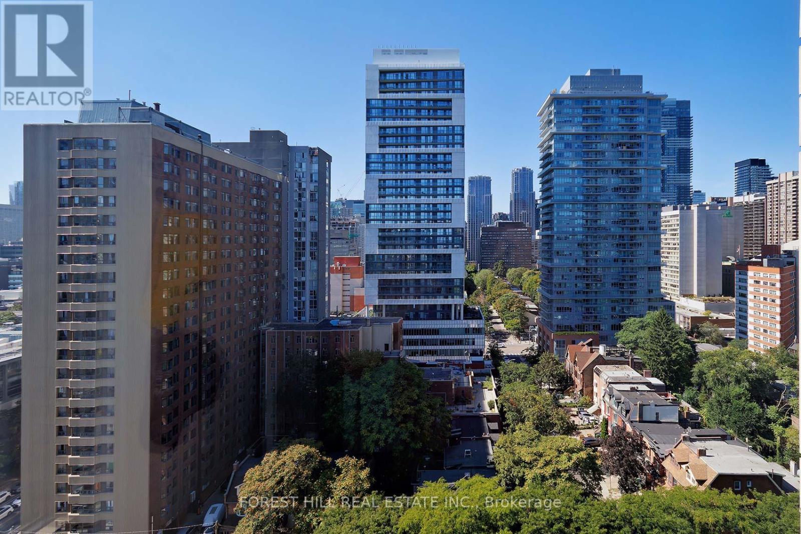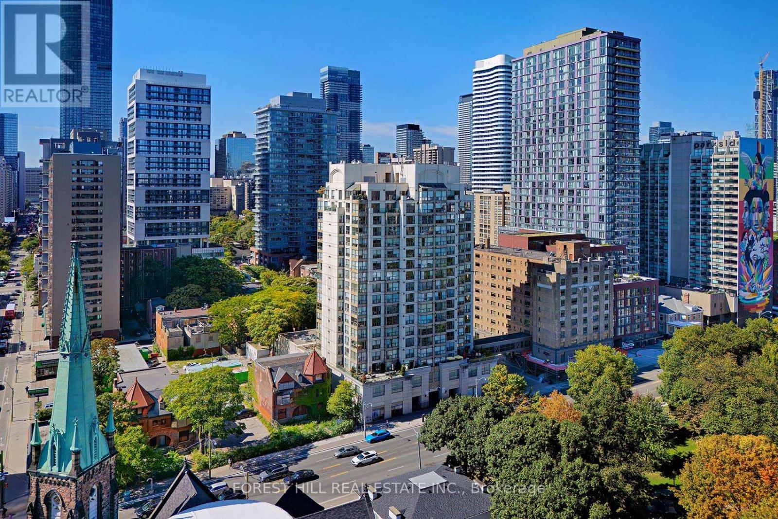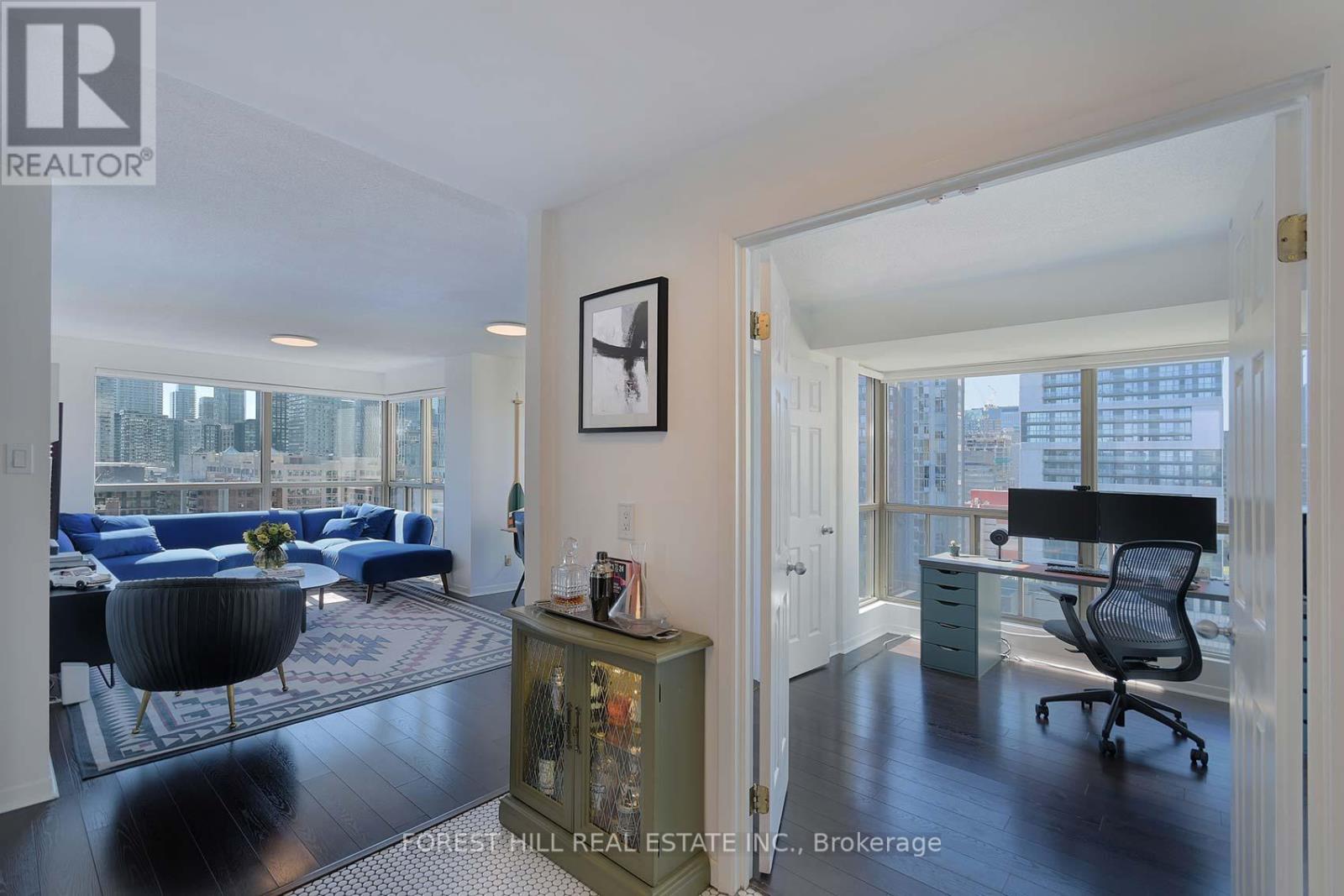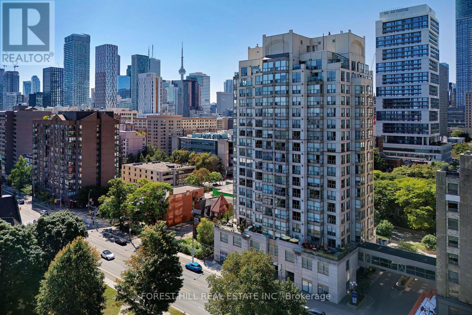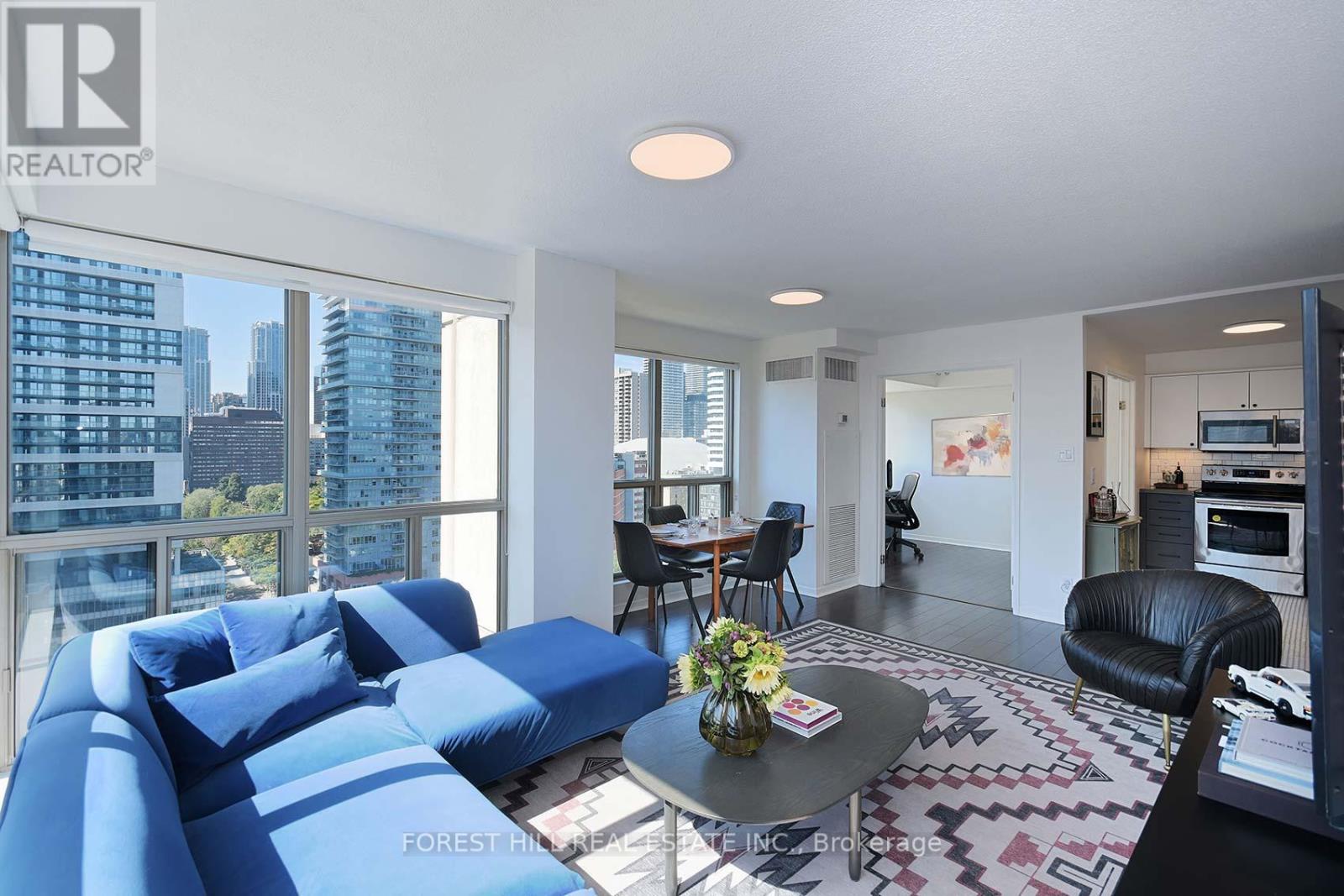 Welcome to your new lifestyle at the Metropolitan Essex, a condominium nestled in a prime Toronto location steps to all urban conveniences. Meticulously maintained, this wonderfully bright and spacious 1170 square foot corner suite with a south west exposure and expansive windows offers an abundance of natural light and tremendous city views. A contemporary aesthetic that is equally stylish and functional. A well designed layout with an open concept living and dining room, 2 bedrooms, a den, and 2 bathrooms lending itself seamlessly to comfortable family living and easy entertaining. The generously sized primary bedroom provides a lovely retreat. Two double closets with mirror panel sliding doors bridge the space between the bedroom and the 4 piece ensuite. The second bedroom is also generously sized with ample closet space. Enjoy the designer details in the tastefully renovated kitchen with full size stainless steel appliances and quartz countertop. The den serves as a wonderful work from home space or can be used as a third bedroom. Indulge in the ultimate convenience of ensuite laundry, a well located underground parking spot next to the entrance door to the elevator, and an underground storage locker. Amenities include 24hour concierge, an indoor pool, sauna, squash court, and an exercise room. Located in an established building with maintenance fees that include hydro, water, heat, parking, locker, common elements, and building insurance. Excellent proximity to transit, groceries, cafes, restaurants, green space, Toronto Metropolitan University, and U of T. What are you waiting for? Truly a special opportunity! (id:51158)