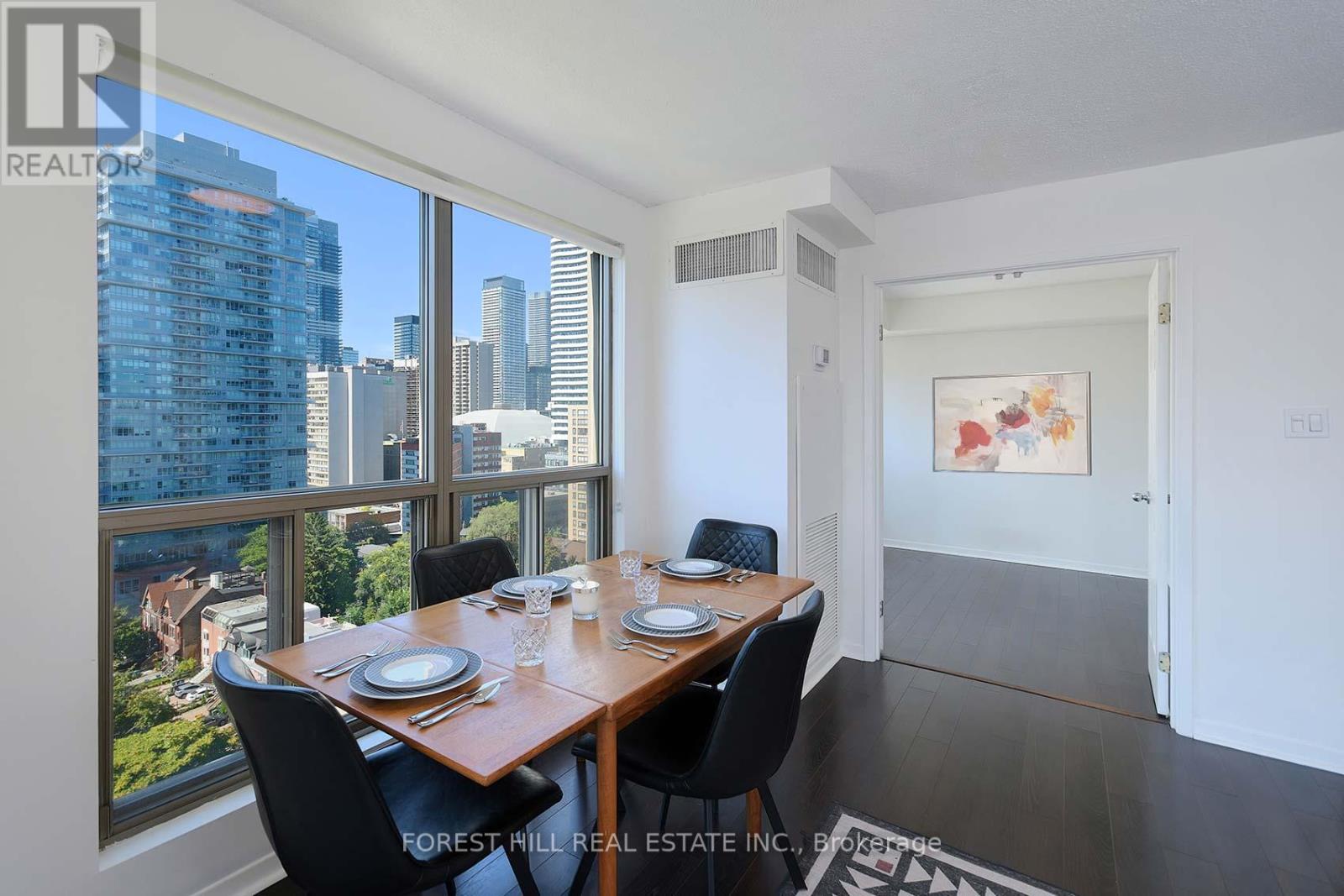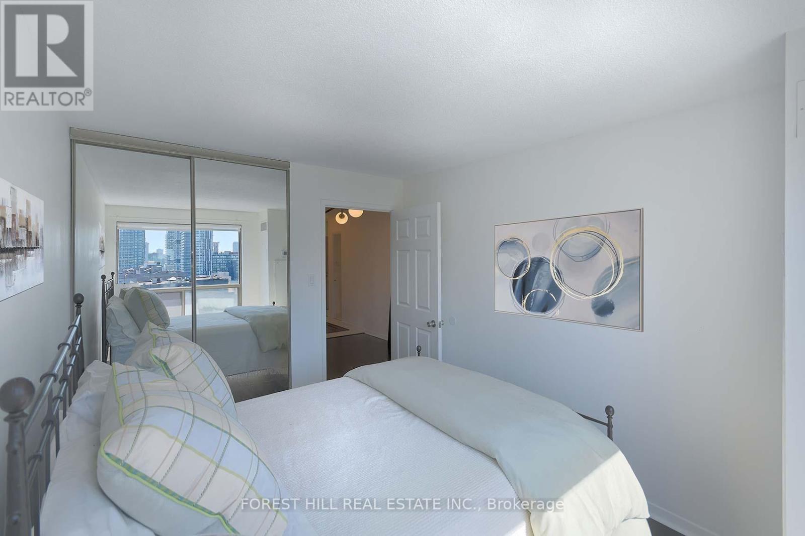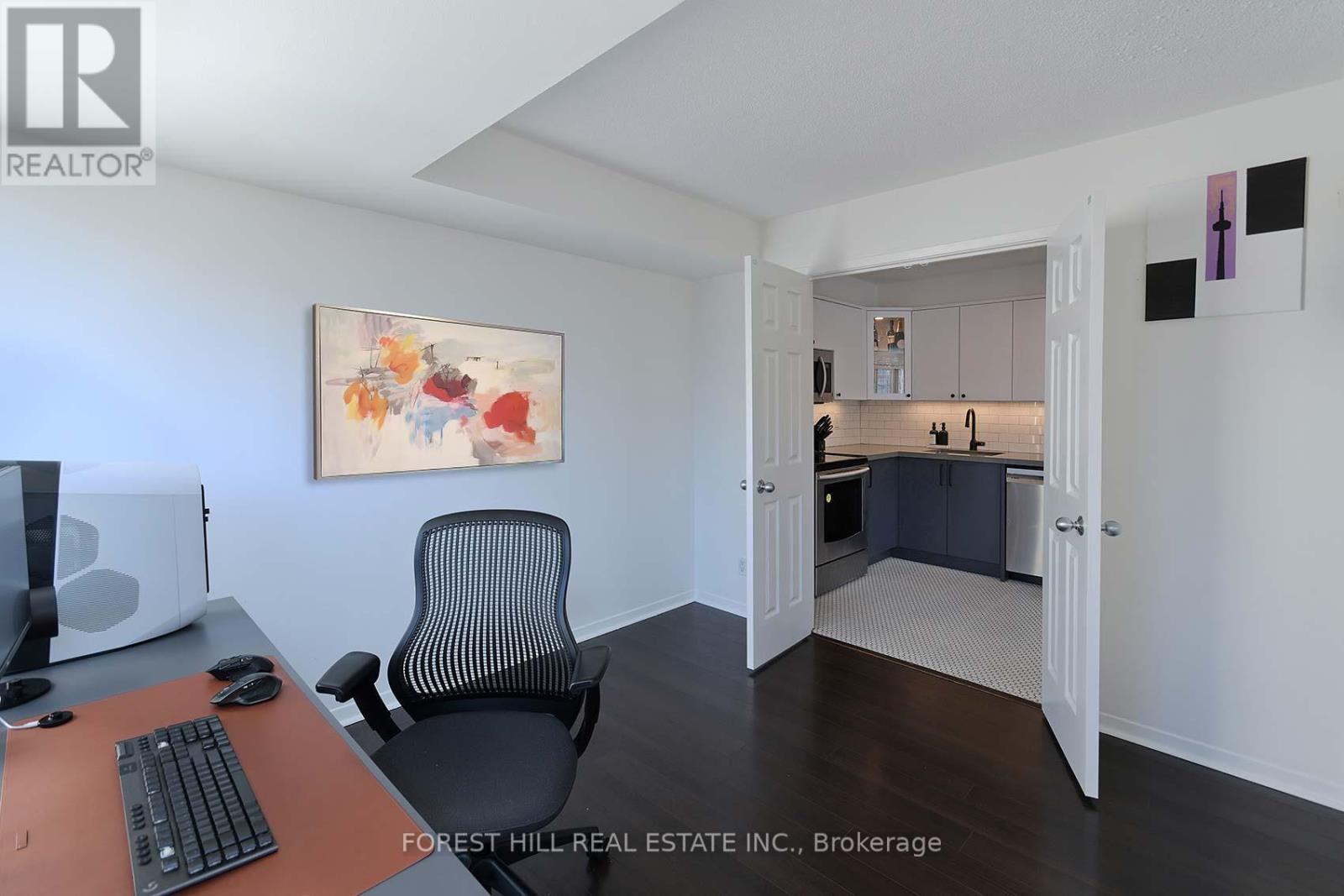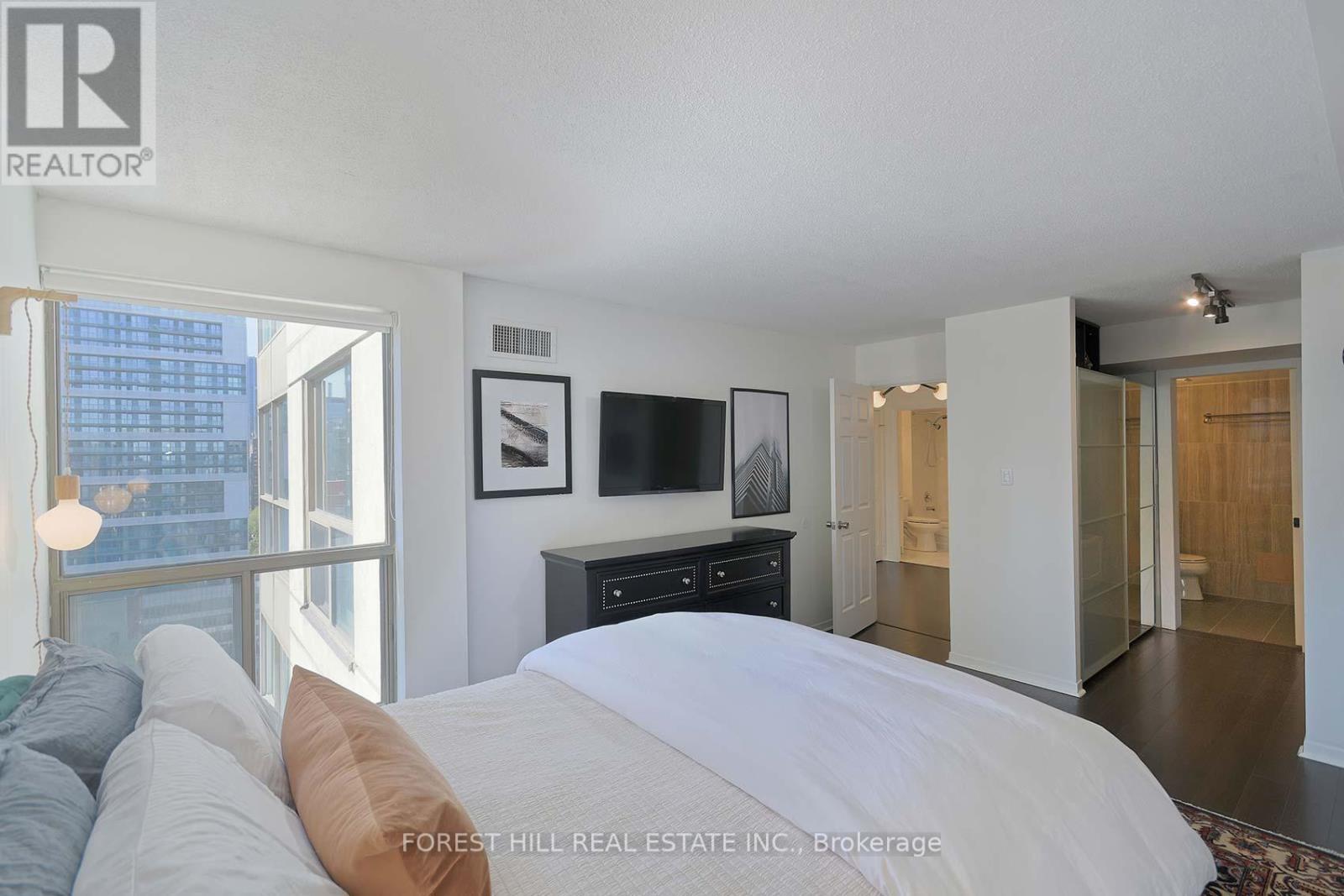 Welcome to your new lifestyle at the Metropolitan Essex, a condominium nestled in a prime Toronto location steps to all urban conveniences. Meticulously maintained, this wonderfully bright and spacious 1170 square foot corner suite with a south west exposure and expansive windows offers an abundance of natural light and tremendous city views. A contemporary aesthetic that is equally stylish and functional. A well designed layout with an open concept living and dining room, 2 bedrooms, a den, and 2 bathrooms lending itself seamlessly to comfortable family living and easy entertaining. The generously sized primary bedroom provides a lovely retreat. Two double closets with mirror panel sliding doors bridge the space between the bedroom and the 4 piece ensuite. The second bedroom is also generously sized with ample closet space. Enjoy the designer details in the tastefully renovated kitchen with full size stainless steel appliances and quartz countertop. The den serves as a wonderful work from home space or can be used as a third bedroom. Indulge in the ultimate convenience of ensuite laundry, a well located underground parking spot next to the entrance door to the elevator, and an underground storage locker. Amenities include 24hour concierge, an indoor pool, sauna, squash court, and an exercise room. Located in an established building with maintenance fees that include hydro, water, heat, parking, locker, common elements, and building insurance. Excellent proximity to transit, groceries, cafes, restaurants, green space, Toronto Metropolitan University, and U of T. What are you waiting for? Truly a special opportunity! (id:51158)