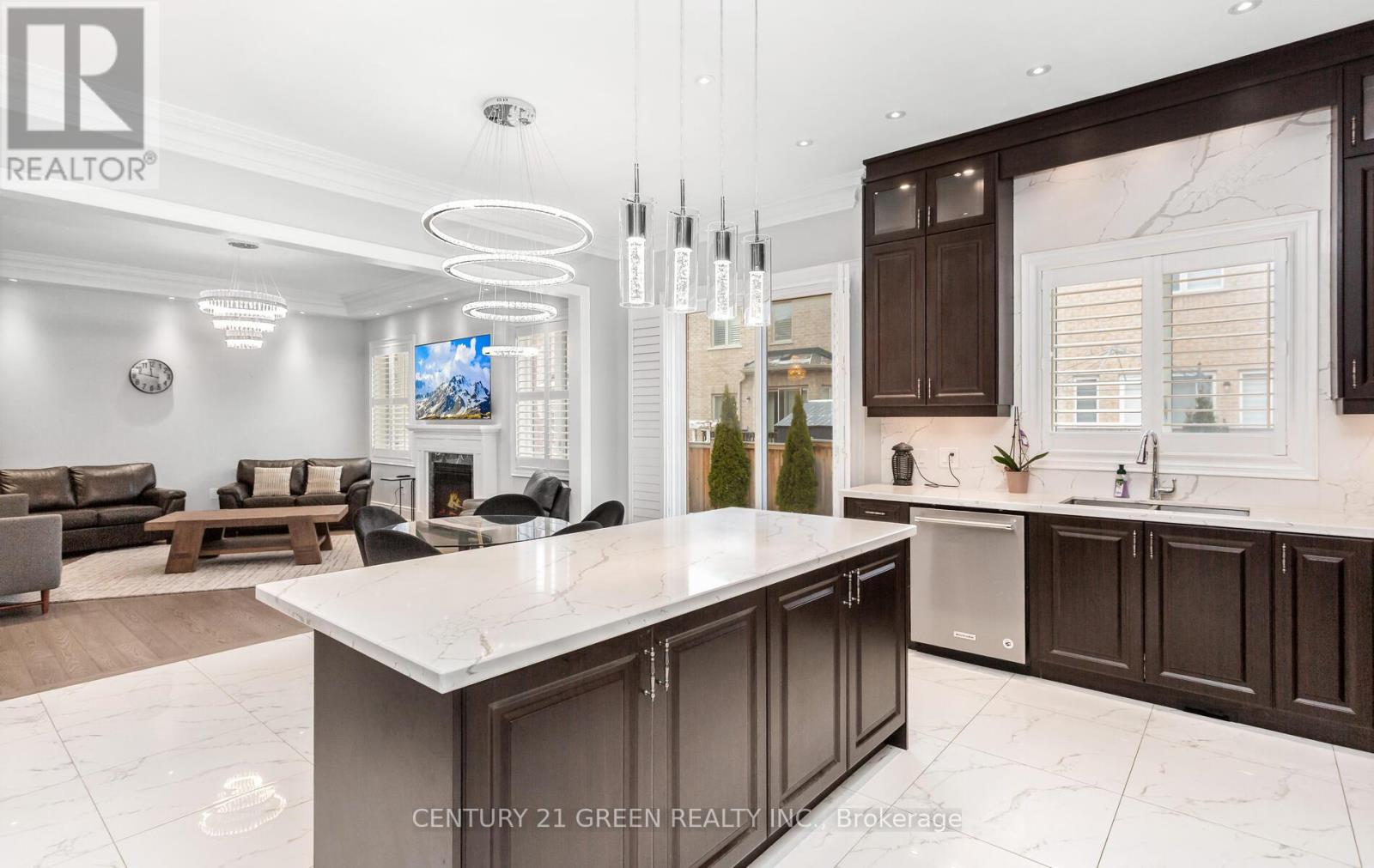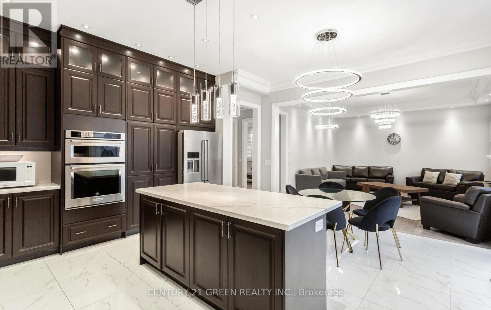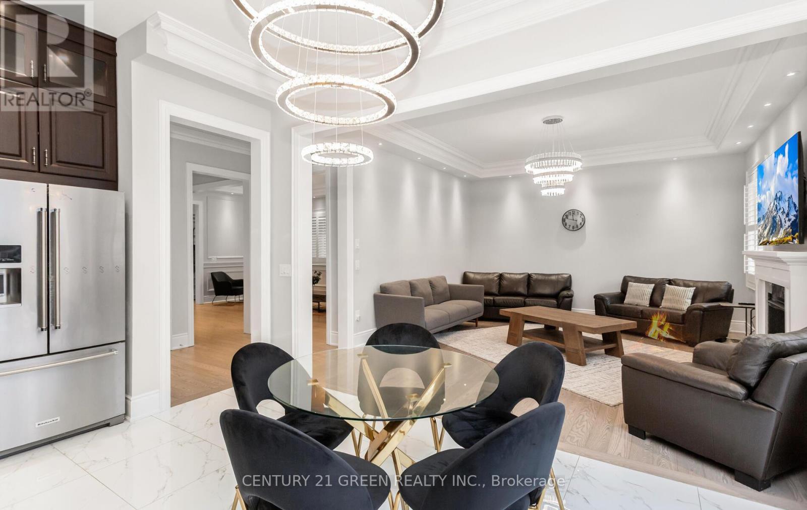 Exquisite gem in the highly sought-after Ford community. Offering approx. 5,000 sq. ft. of living space with 5+3 bedrooms and 5+1 baths. Elegant main level features wide-plank hardwood floors, wainscoting, 10' ceilings with crown Moulding and custom LED chandeliers with pot lights throughout. Eat-in gourmet kitchen with premium KitchenAid appliances, quartz countertops, oversized centre island, and extended cabinetry. Second level boasts five spacious ensuite bedrooms, including a primary retreat with spa-inspired 5-pc bath. Legal 2-bedroom + den basement apartment with separate entrance, full kitchen, quartz counters, and high-end stainless steel appliances-ideal for in-laws or rental income. Meticulously landscaped with full stone interlock and private cedar-lined backyard. A must-see family home (id:51158)