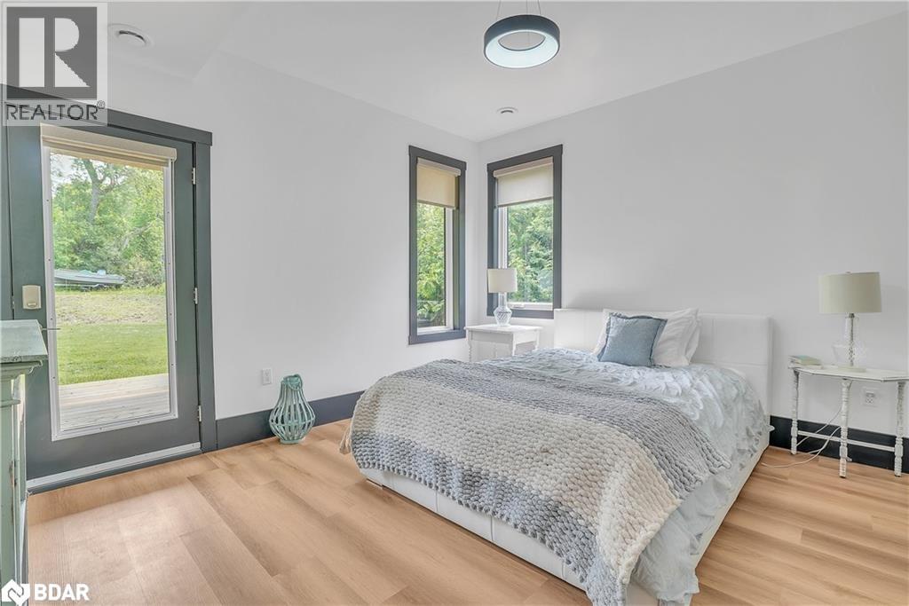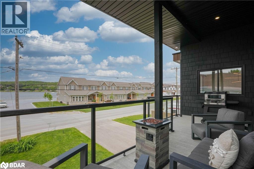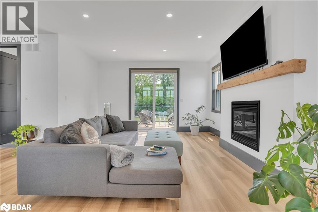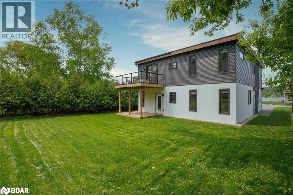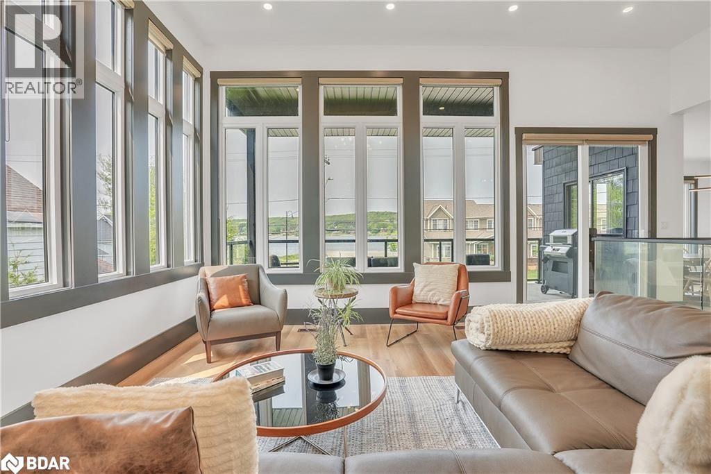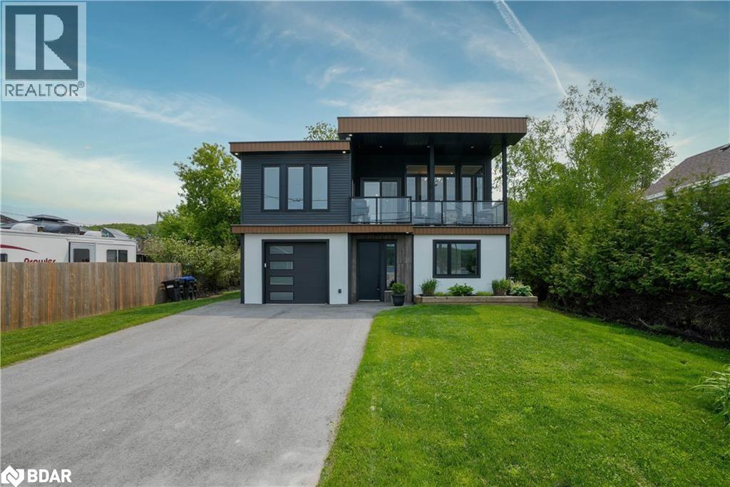 Modern Luxury with Scenic Harbour Views. Just Steps from the Beach. Experience refined coastal living in this exceptional 2,400 sq. ft. modern residence, ideally located just a 3-minute stroll from the beach and showcasing captivating southwest views of Penetang Harbour. Thoughtfully designed with 4 spacious bedrooms ( 3 on the main floor and 1 on the second floor, now being used as a gym, but could be home office or flex space )and 2.5 elegant bathrooms, this home features an airy open-concept layout highlighted by soaring 12-foot ceilings in the great room, 9-foot ceilings throughout, and premium finishes at every turn. The heart of the home a gourmet kitchen with stainless steel appliances flows seamlessly into the dining and living areas, complete with a cozy fireplace and walkout to a covered balcony perfect for sunset views. Retreat to the serene primary suite featuring a spa-inspired ensuite with a walk-in glass shower. Additional features include radiant in-floor heating on the ground level, modern lighting with designer Kusco fixtures, $10,000 in custom window coverings, 8-foot doors, and custom baseboards throughout. Practicality meets style with inside access to a single-car garage, a well-appointed mudroom/laundry space, and multiple outdoor living areas including three decks and a generous backyard. This is coastal elegance at its finest where every detail has been carefully curated for modern comfort and relaxed sophistication. (id:51158)