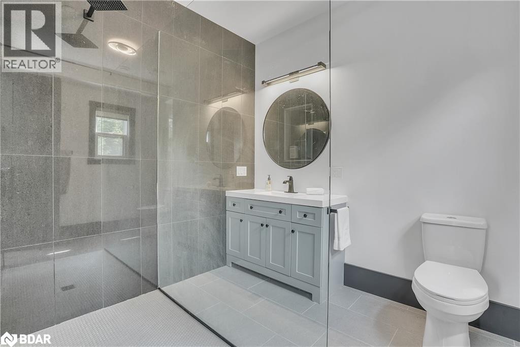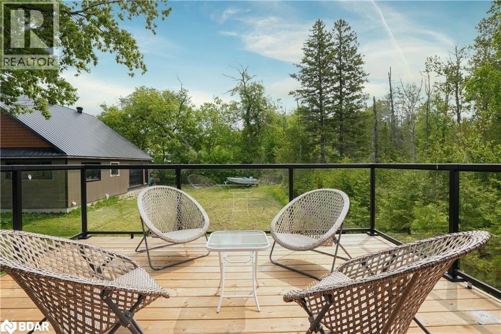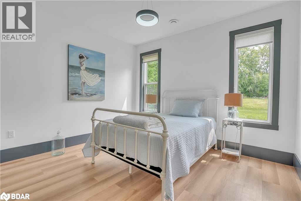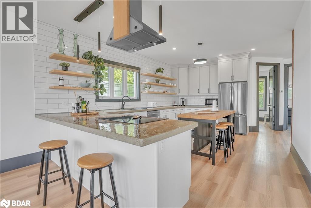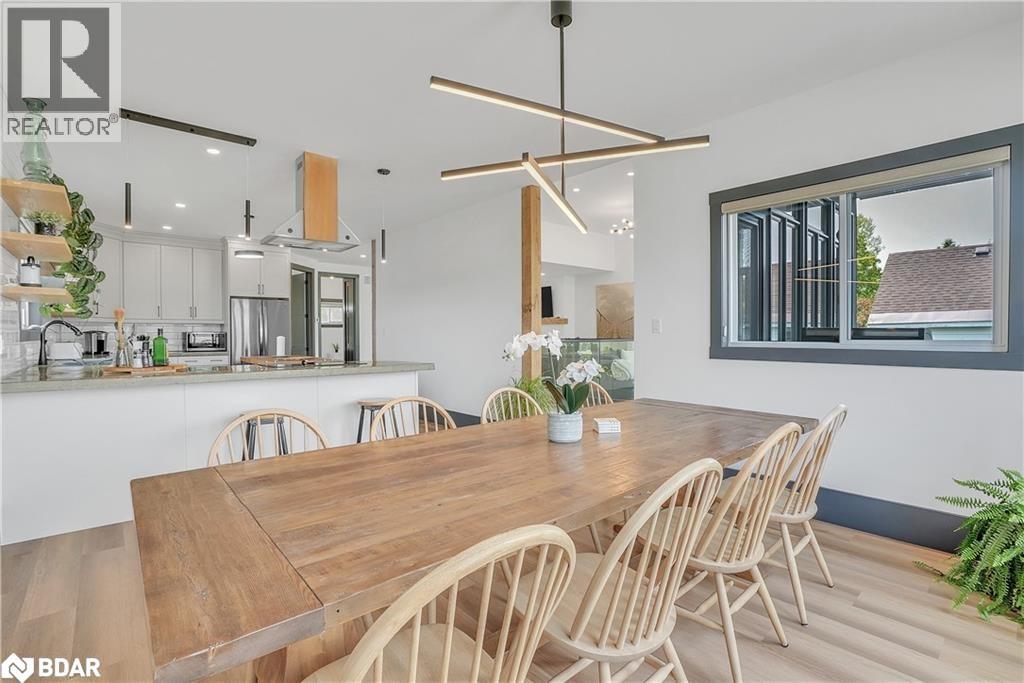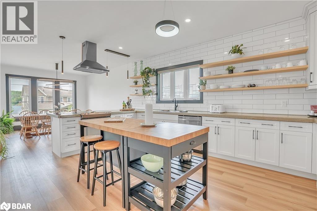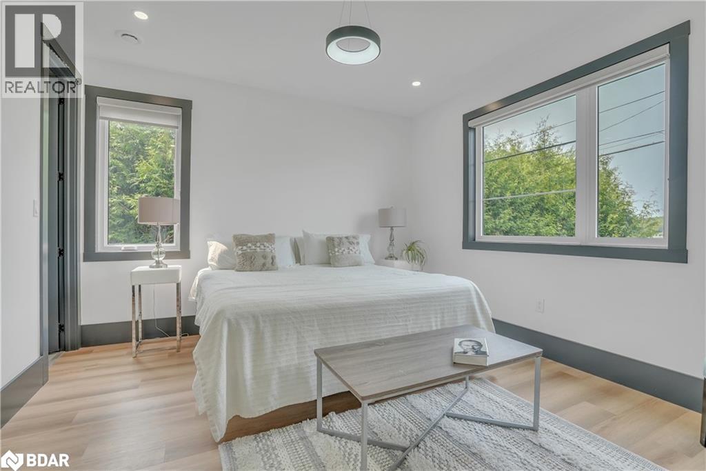 Modern Luxury with Scenic Harbour Views. Just Steps from the Beach. Experience refined coastal living in this exceptional 2,400 sq. ft. modern residence, ideally located just a 3-minute stroll from the beach and showcasing captivating southwest views of Penetang Harbour. Thoughtfully designed with 4 spacious bedrooms ( 3 on the main floor and 1 on the second floor, now being used as a gym, but could be home office or flex space )and 2.5 elegant bathrooms, this home features an airy open-concept layout highlighted by soaring 12-foot ceilings in the great room, 9-foot ceilings throughout, and premium finishes at every turn. The heart of the home a gourmet kitchen with stainless steel appliances flows seamlessly into the dining and living areas, complete with a cozy fireplace and walkout to a covered balcony perfect for sunset views. Retreat to the serene primary suite featuring a spa-inspired ensuite with a walk-in glass shower. Additional features include radiant in-floor heating on the ground level, modern lighting with designer Kusco fixtures, $10,000 in custom window coverings, 8-foot doors, and custom baseboards throughout. Practicality meets style with inside access to a single-car garage, a well-appointed mudroom/laundry space, and multiple outdoor living areas including three decks and a generous backyard. This is coastal elegance at its finest where every detail has been carefully curated for modern comfort and relaxed sophistication. (id:51158)
