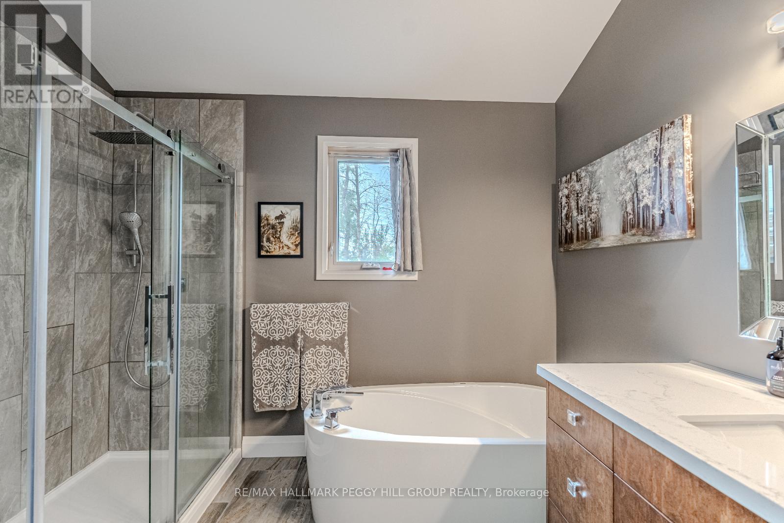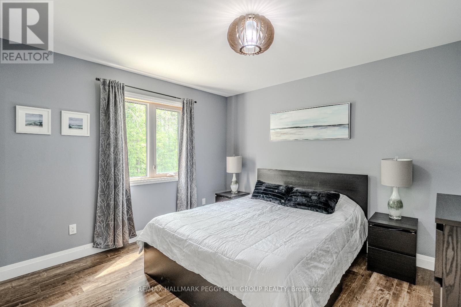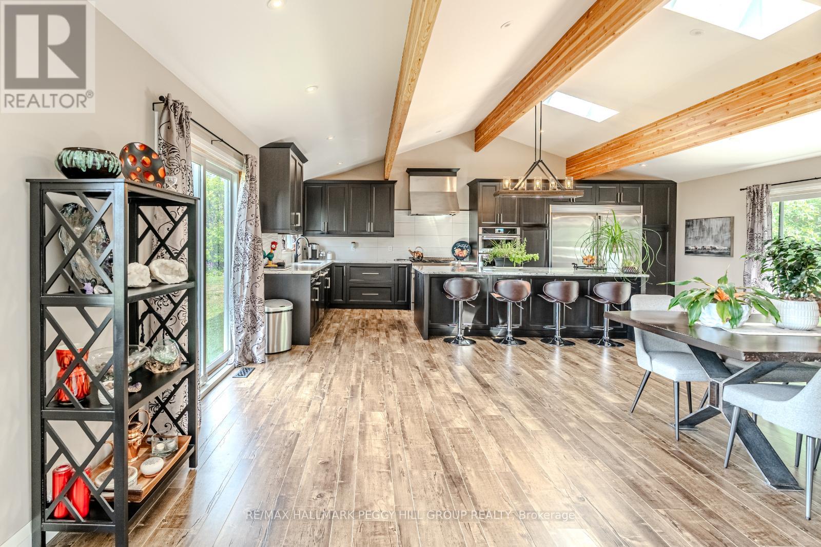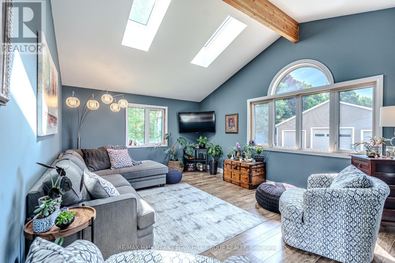 BOLD ARCHITECTURE, LUXURY UPGRADES, A HEATED 3-BAY SHOP, & SEPARATE 200 AMP SERVICE TO BOTH THE HOUSE & THE SHOP ON OVER HALF AN ACRE OF COUNTRY LIVING! Step into this 2019 Linwood home offering over 3,300 sq ft of finished living space on a beautifully landscaped half-acre lot, just minutes from downtown Elmvale. Enjoy an unmatched lifestyle close to Wasaga Beach, the Elmvale Jungle Zoo, Tiny Marsh, parks, schools, a library, an arena, and beloved community events like the Maple Syrup Festival and Fall Fair. This property is designed to impress, with a striking A-frame roofline, oversized triple-pane windows, double-door entry, manicured gardens, a stone patio, gazebo, and full landscape lighting with built-in irrigation. The heated and insulated detached shop with 3 garage doors, a commercial-grade Liftmaster opener, and dedicated 200 amp service is a dream for hobbyists and professionals alike. Inside, vaulted ceilings with exposed Douglas Fir beams, floor-to-ceiling windows, skylights, and designer LED lighting create an unforgettable interior. The modern kitchen boasts quartz counters, dark shaker cabinets, tile backsplash, an under-mount sink, island seating, and premium Jennair appliances, opening to a stylish dining space with wide patio doors, and a breathtaking living room. A skylit family room and two main floor bedrooms served by a 4-piece bath elevate everyday comfort, while a custom maple staircase with an engineered steel mono stringer leads to a loft-style primary suite with a custom walk-in closet and an ensuite with an air jet tub and imported Italian glass shower. The partially finished basement adds a rec room, bedroom, full bath, and a utility room with a tankless water heater, softener, UV system, and 4-filter water treatment. With a Generac and blown-in insulation for added efficiency, every detail is thoughtfully crafted to create an extraordinary lifestyle, and a truly rare opportunity to live and entertain in style! (id:51158)