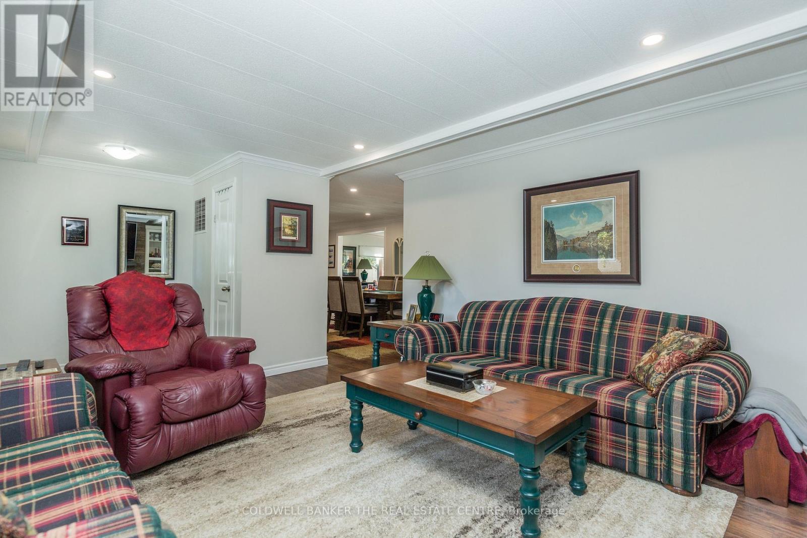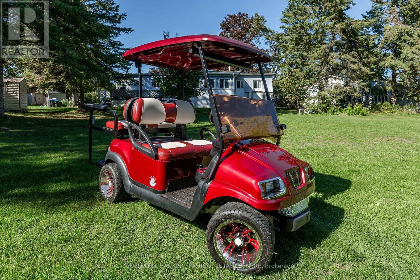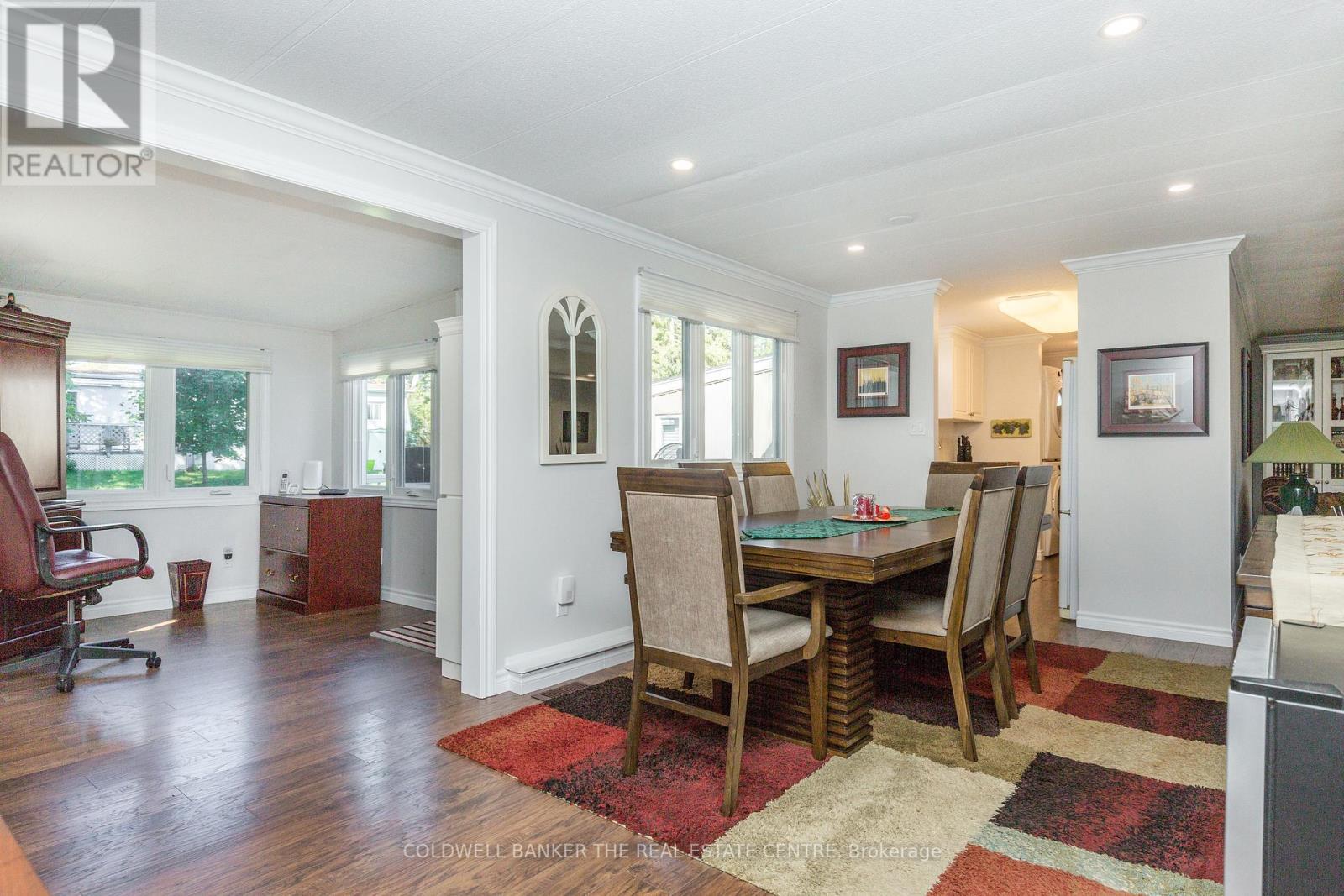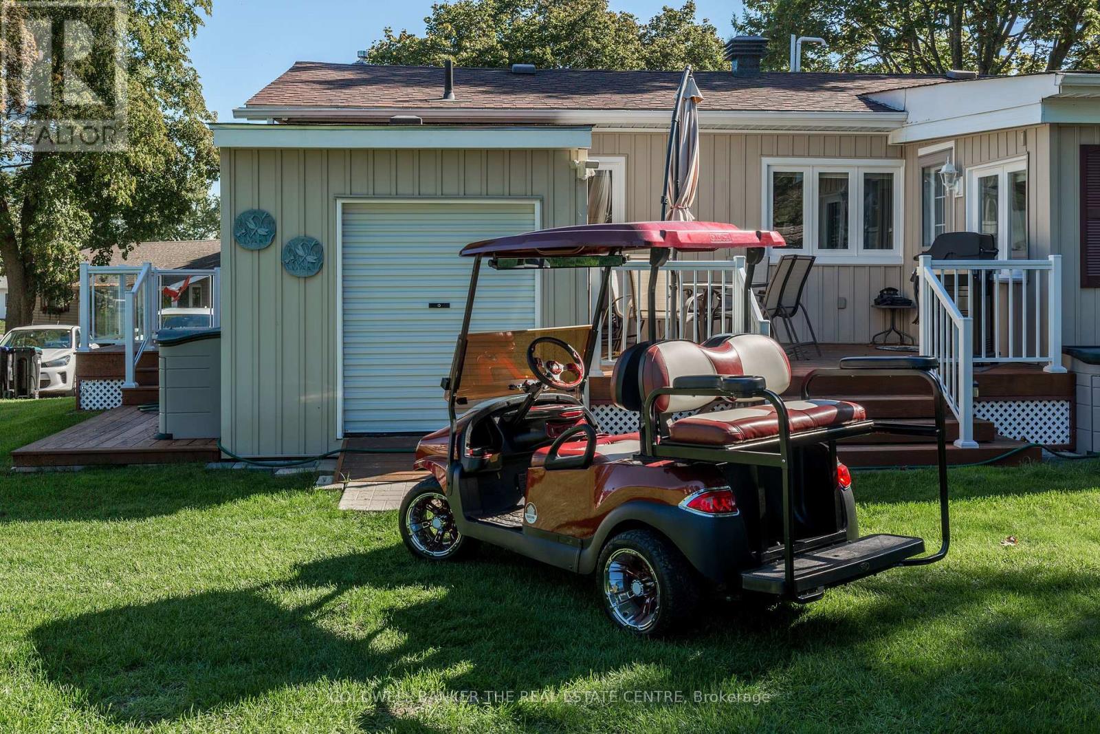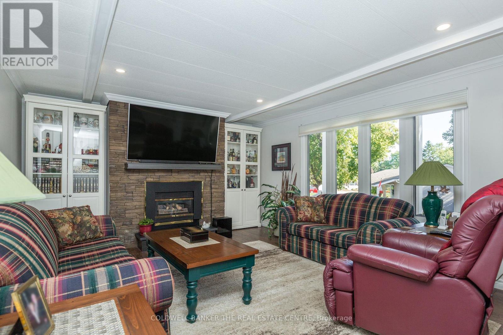 Remarkable bungalow on the North Side in Sandycove Acres! Fully renovated and landscaped inside and out, nothing to do but move in and enjoy! This beautiful 2 bedroom, 2 bathroom home has been updated inside with drywall, wide plank laminate flooring throughout (carpet free!), pot lights, crown moulding, stone fireplace plus updated kitchen (including new appliances) and bathrooms! Large principal rooms with loads of natural light flood the house. Primary bedroom with walk in closet and 2 piece ensuite bath. Additional den or office with walk/out to deck. Outside has been lovingly landscaped with large covered front porch with pot lights and glass railings and 13 x11 back deck with lots of privacy & greenspace. The numerous updates include: spray foam insulated crawl space, windows 2019, gas furnace 2016, A/C 2017, shingles 2017, freshly painted 2023, updated screens & exterior doors, leaf filters 2023. Not to be missed! Included with the sale a fully customized 2017 Precedent Club Car Golf Cart with its own 'garage'. 2 garden sheds: garden tractor storage and 9x11 shed with power and steel roll door for extra storage and golf cart parking! Don't wait! Sandycove is a vibrant active community with lost of activities & clubs. 2 salt water pools, 3 rec centres, NEW pickleball courts, gym and woodworking shop. Easy access to amenities, South Barrie GO and beautiful Lake Simcoe! *New asphalt driveway being installed* Assumable lease to 2037 $579.86. (id:51158)