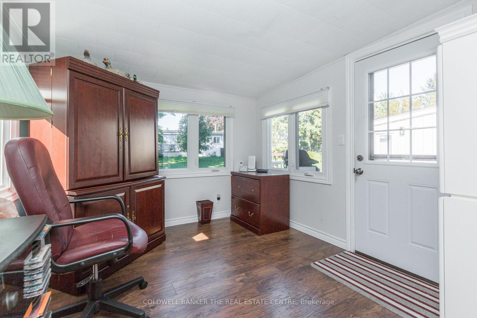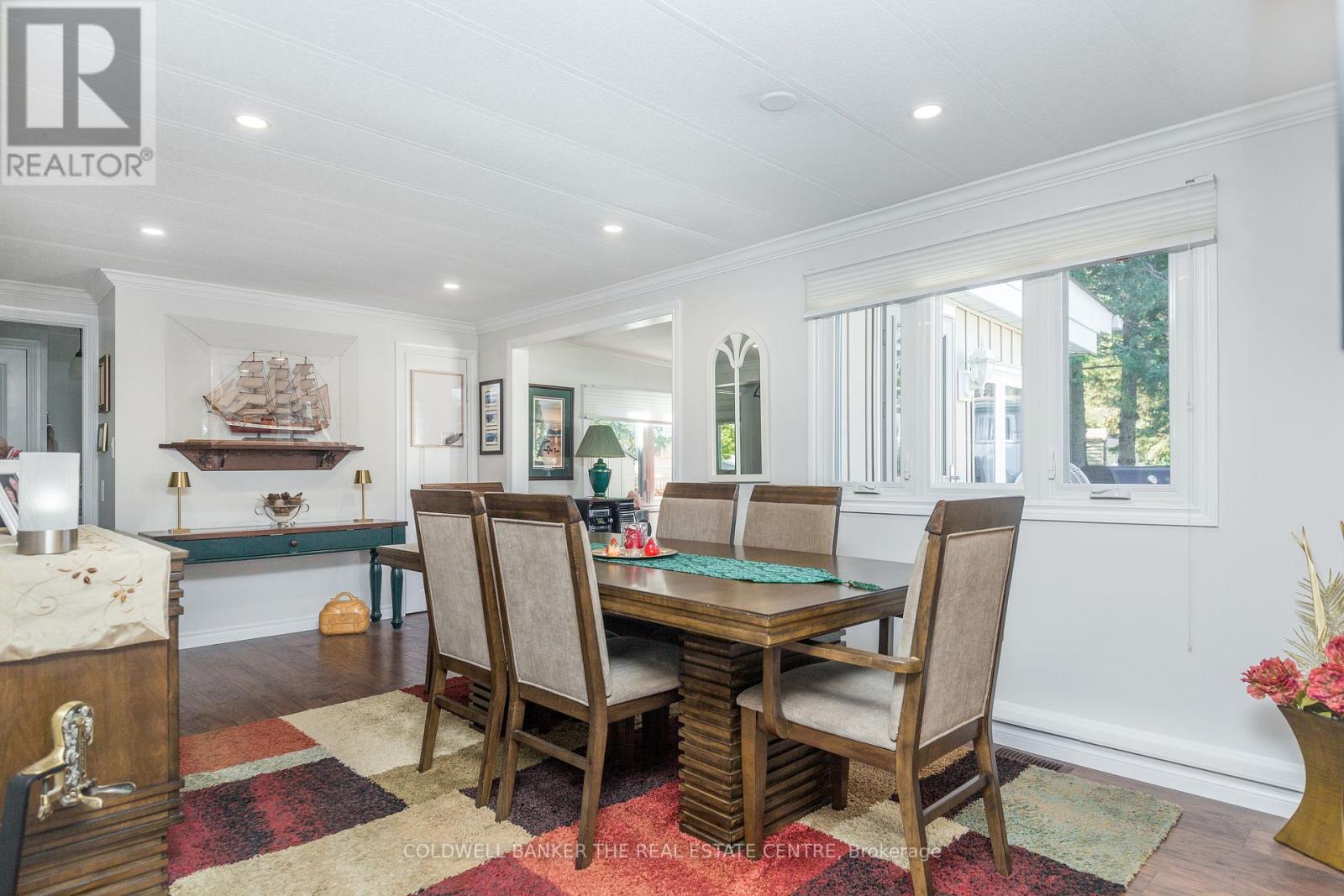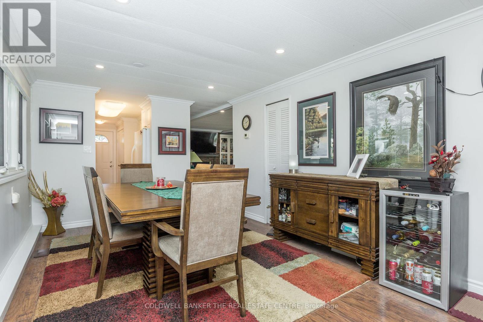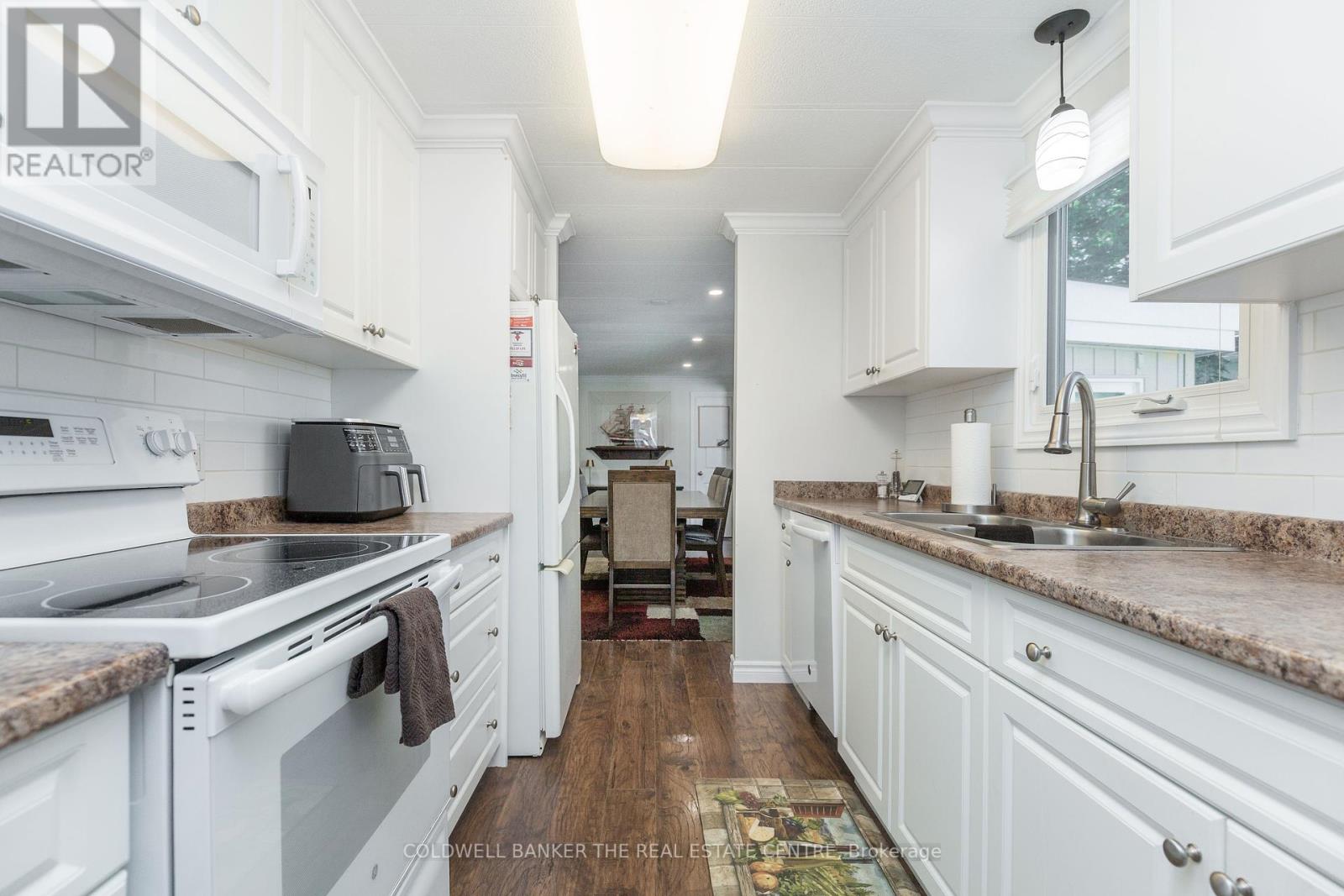 Remarkable bungalow on the North Side in Sandycove Acres! Fully renovated and landscaped inside and out, nothing to do but move in and enjoy! This beautiful 2 bedroom, 2 bathroom home has been updated inside with drywall, wide plank laminate flooring throughout (carpet free!), pot lights, crown moulding, stone fireplace plus updated kitchen (including new appliances) and bathrooms! Large principal rooms with loads of natural light flood the house. Primary bedroom with walk in closet and 2 piece ensuite bath. Additional den or office with walk/out to deck. Outside has been lovingly landscaped with large covered front porch with pot lights and glass railings and 13 x11 back deck with lots of privacy & greenspace. The numerous updates include: spray foam insulated crawl space, windows 2019, gas furnace 2016, A/C 2017, shingles 2017, freshly painted 2023, updated screens & exterior doors, leaf filters 2023. Not to be missed! Included with the sale a fully customized 2017 Precedent Club Car Golf Cart with its own 'garage'. 2 garden sheds: garden tractor storage and 9x11 shed with power and steel roll door for extra storage and golf cart parking! Don't wait! Sandycove is a vibrant active community with lost of activities & clubs. 2 salt water pools, 3 rec centres, NEW pickleball courts, gym and woodworking shop. Easy access to amenities, South Barrie GO and beautiful Lake Simcoe! *New asphalt driveway being installed* Assumable lease to 2037 $579.86. (id:51158)