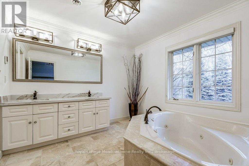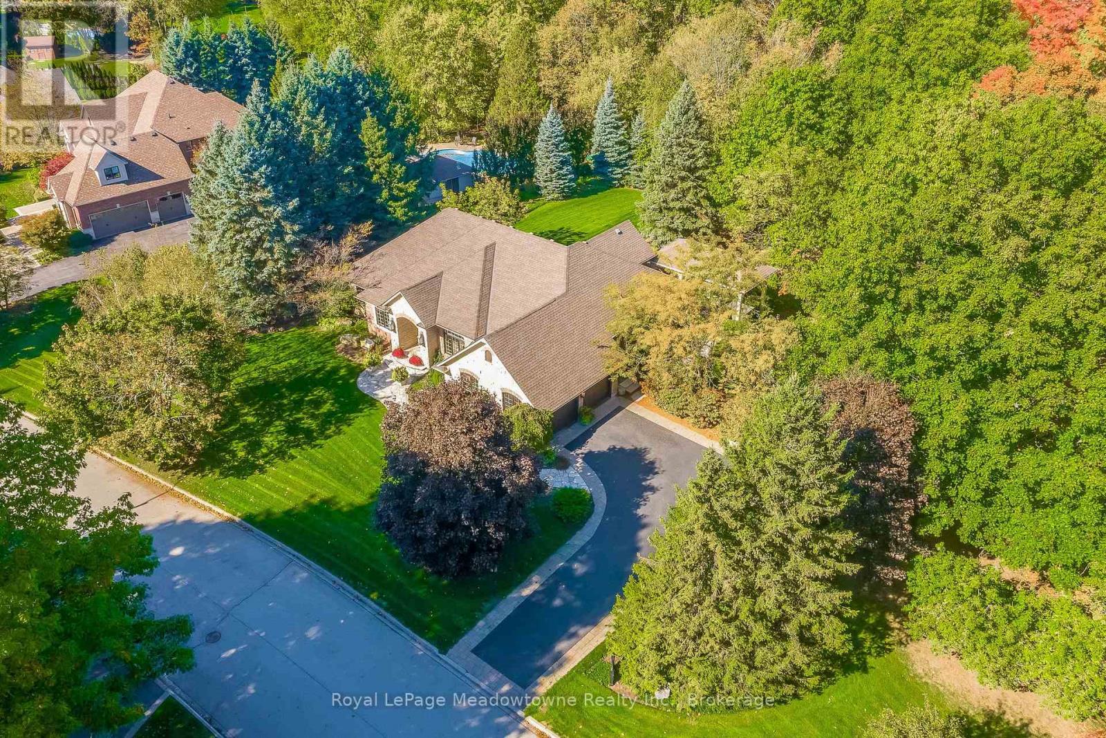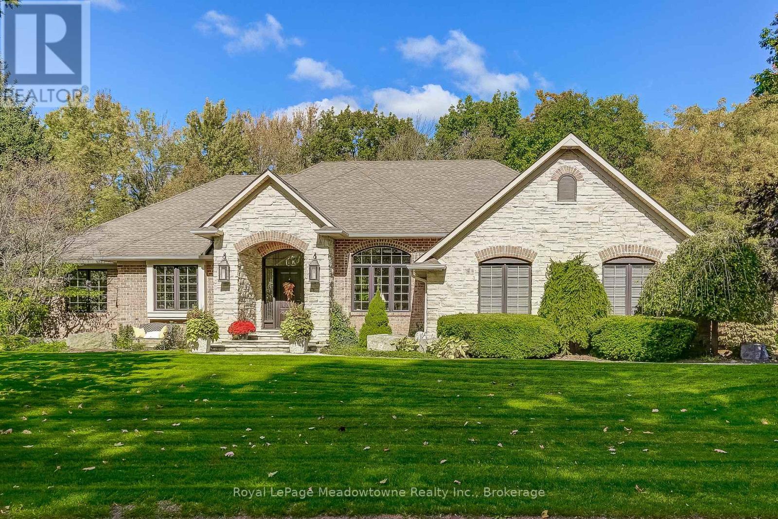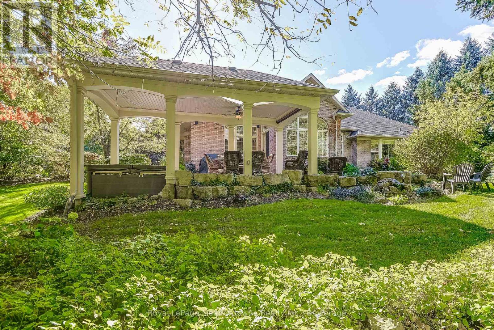 This well maintained executive 4 (3+1) bedroom custom BUNGALOW with approximately 4470sf of beautifully finished living space combines rural serenity with urban conveniences: a perfect blend of country living and luxury. It is situated on a much sought-after cul-de-sac nestled in the quaint village of Carlisle. The manicured half-acre+ lot backs and sides on to beautifully treed conservation lands. The semi-open concept main floor has been freshly painted throughout, and features an integrated living area consisting of a well-appointed and fully updated eat-in kitchen with 2 magnificent islands accommodating seating for 10 with high-end appliances (Miele oven/speed oven combo and dishwasher +Jen-Air fridge), and a family room with a stone façade gas fireplace framed by complementary book shelving and cabinetry. The elegant custom cabinetry offers an abundance of storage. This level also includes an inviting living room and an oversized dining room accented by a beautiful coffered ceiling. The generously sized primary room retreat has a 5-pc. ensuite and walk-in closet. There is also a 5-pc. main bath, 2 bedrooms, a laundry room and a 2-pc. bath. Enjoy the luxurious heated limestone flooring that runs throughout the main level. The professionally finished basement, accessible also from the oversized double-car garage, is completed to the same high level of craftsmanship, with high ceilings and large windows. A 27'X37'rec room, a 4thbedroom, a 4-pc. bath, a utility room and 4 additional rooms can serve a variety of purposes. Updated light fixtures have been installed throughout. The extremely private back yard oasis has been beautifully landscaped to include a firepit, water feature, and multiple conversation areas well suited for large gatherings. A stunning custom outdoor room with an integrated large Masters type hot tub complements the private park-like setting. A sprinkler system assists in maintaining the grounds and extensive perennial gardens. (id:51158)