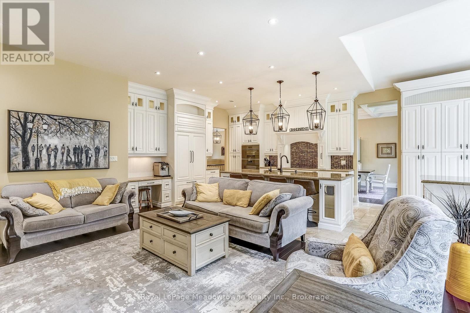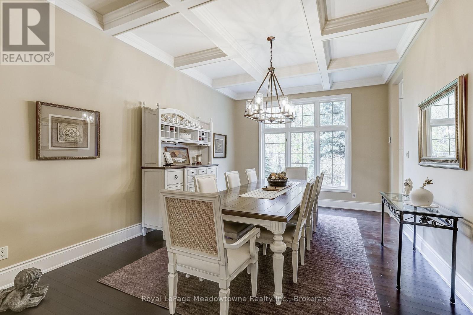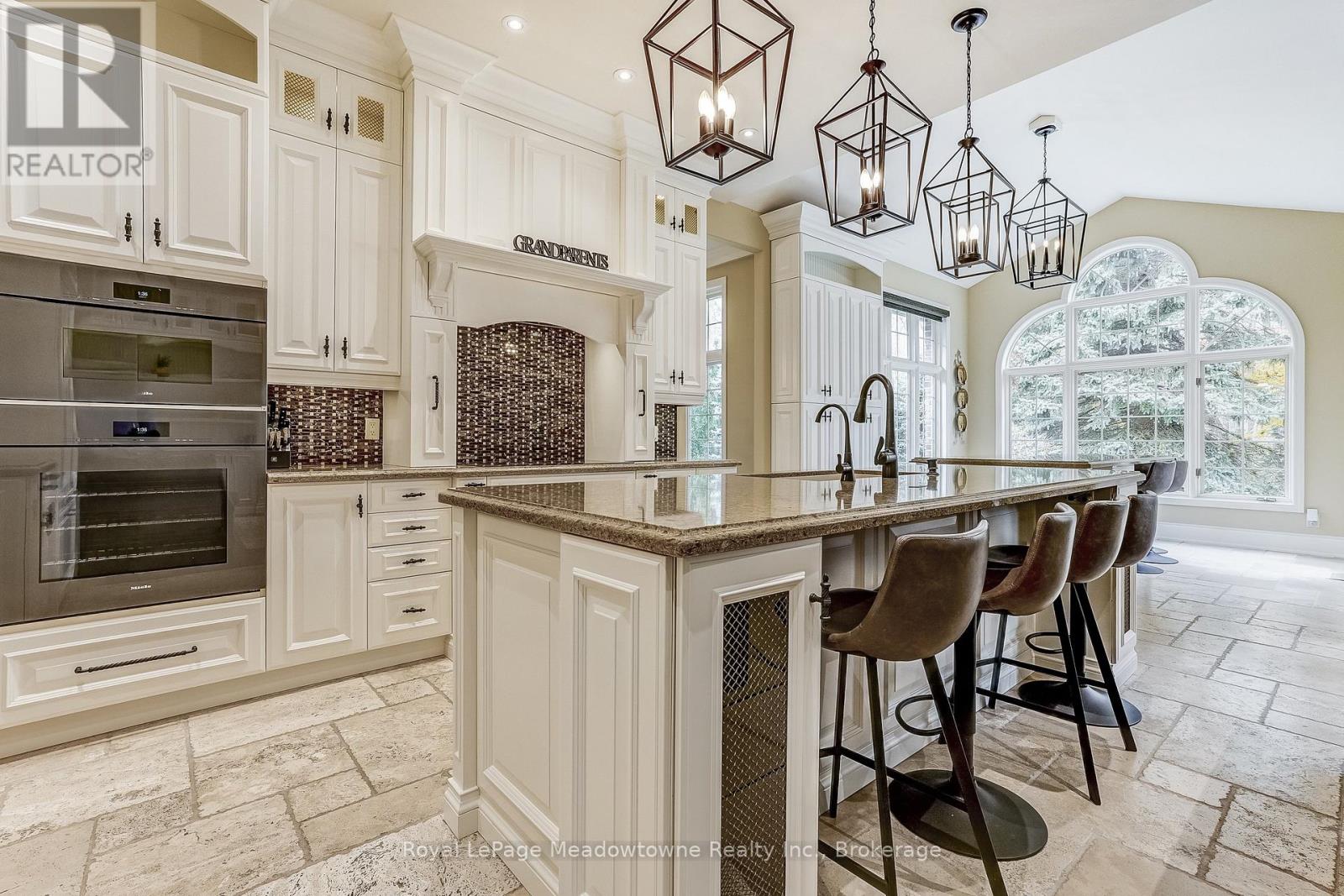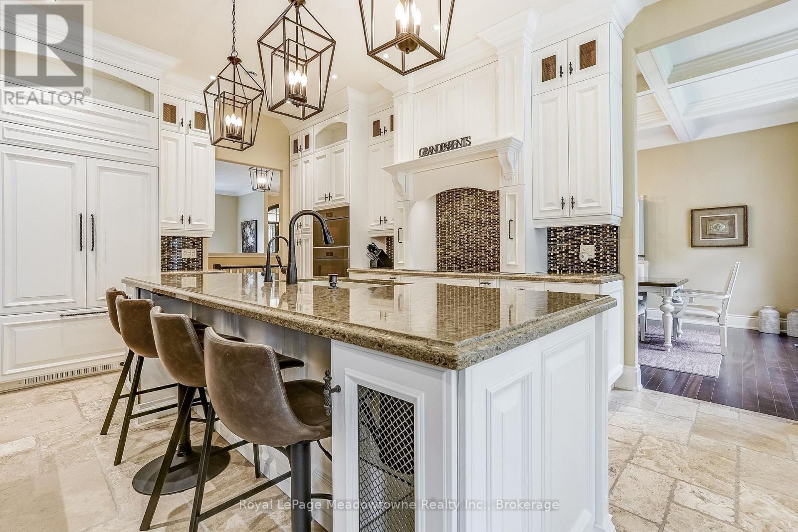 This well maintained executive 4 (3+1) bedroom custom BUNGALOW with approximately 4470sf of beautifully finished living space combines rural serenity with urban conveniences: a perfect blend of country living and luxury. It is situated on a much sought-after cul-de-sac nestled in the quaint village of Carlisle. The manicured half-acre+ lot backs and sides on to beautifully treed conservation lands. The semi-open concept main floor has been freshly painted throughout, and features an integrated living area consisting of a well-appointed and fully updated eat-in kitchen with 2 magnificent islands accommodating seating for 10 with high-end appliances (Miele oven/speed oven combo and dishwasher +Jen-Air fridge), and a family room with a stone façade gas fireplace framed by complementary book shelving and cabinetry. The elegant custom cabinetry offers an abundance of storage. This level also includes an inviting living room and an oversized dining room accented by a beautiful coffered ceiling. The generously sized primary room retreat has a 5-pc. ensuite and walk-in closet. There is also a 5-pc. main bath, 2 bedrooms, a laundry room and a 2-pc. bath. Enjoy the luxurious heated limestone flooring that runs throughout the main level. The professionally finished basement, accessible also from the oversized double-car garage, is completed to the same high level of craftsmanship, with high ceilings and large windows. A 27'X37'rec room, a 4thbedroom, a 4-pc. bath, a utility room and 4 additional rooms can serve a variety of purposes. Updated light fixtures have been installed throughout. The extremely private back yard oasis has been beautifully landscaped to include a firepit, water feature, and multiple conversation areas well suited for large gatherings. A stunning custom outdoor room with an integrated large Masters type hot tub complements the private park-like setting. A sprinkler system assists in maintaining the grounds and extensive perennial gardens. (id:51158)
