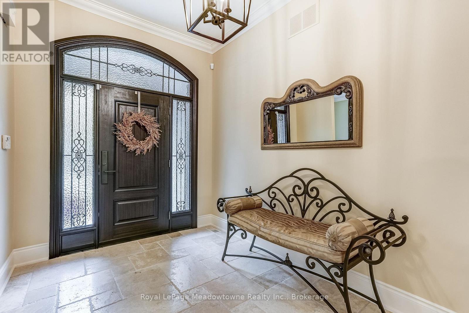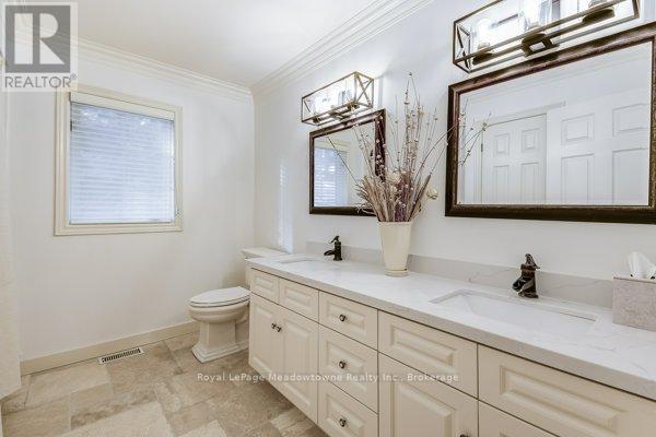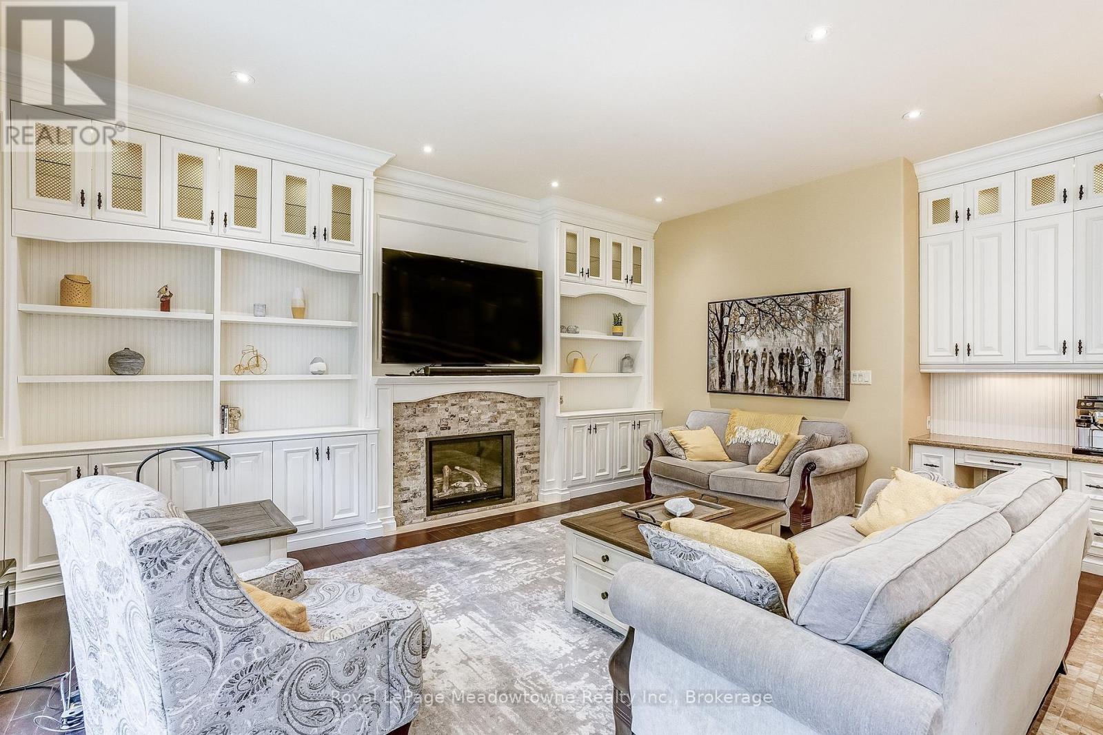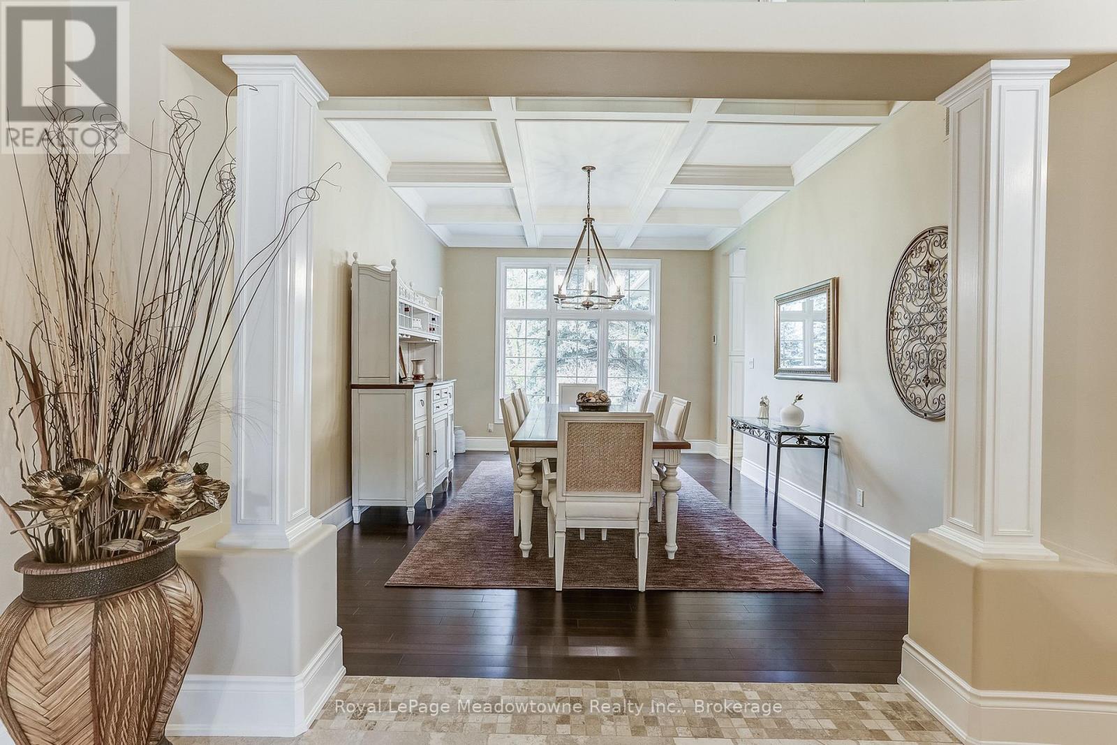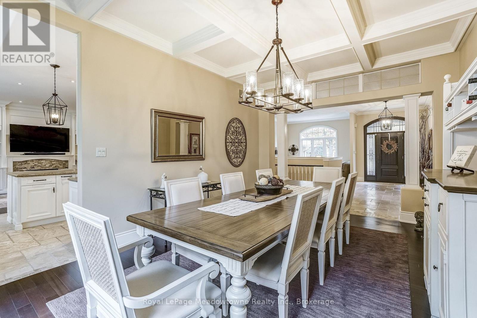 This well maintained executive 4 (3+1) bedroom custom BUNGALOW with approximately 4470sf of beautifully finished living space combines rural serenity with urban conveniences: a perfect blend of country living and luxury. It is situated on a much sought-after cul-de-sac nestled in the quaint village of Carlisle. The manicured half-acre+ lot backs and sides on to beautifully treed conservation lands. The semi-open concept main floor has been freshly painted throughout, and features an integrated living area consisting of a well-appointed and fully updated eat-in kitchen with 2 magnificent islands accommodating seating for 10 with high-end appliances (Miele oven/speed oven combo and dishwasher +Jen-Air fridge), and a family room with a stone façade gas fireplace framed by complementary book shelving and cabinetry. The elegant custom cabinetry offers an abundance of storage. This level also includes an inviting living room and an oversized dining room accented by a beautiful coffered ceiling. The generously sized primary room retreat has a 5-pc. ensuite and walk-in closet. There is also a 5-pc. main bath, 2 bedrooms, a laundry room and a 2-pc. bath. Enjoy the luxurious heated limestone flooring that runs throughout the main level. The professionally finished basement, accessible also from the oversized double-car garage, is completed to the same high level of craftsmanship, with high ceilings and large windows. A 27'X37'rec room, a 4thbedroom, a 4-pc. bath, a utility room and 4 additional rooms can serve a variety of purposes. Updated light fixtures have been installed throughout. The extremely private back yard oasis has been beautifully landscaped to include a firepit, water feature, and multiple conversation areas well suited for large gatherings. A stunning custom outdoor room with an integrated large Masters type hot tub complements the private park-like setting. A sprinkler system assists in maintaining the grounds and extensive perennial gardens. (id:51158)
