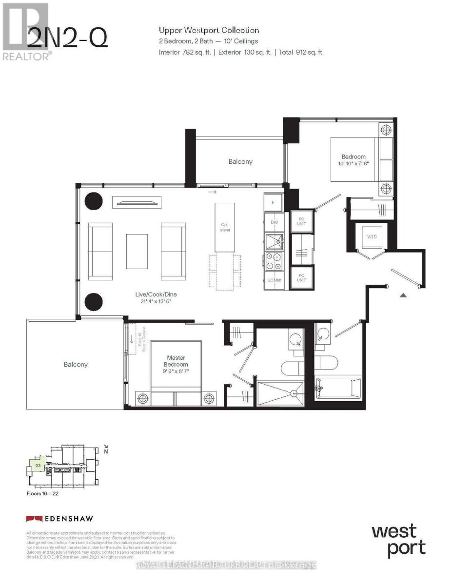 $682.27 MonthlyPort Credit's Westport Condos: A 2-bedroom, 2-bathroom corner suite on the 18th floor offering stunning, clear south-west views of Port Credit and the lake. This 771 sq ft unit features a desirable split bedroom layout for enhanced privacy, 10-foot ceilings, and floor-to-ceiling windows outfitted with roller blinds. The suite has an oversized terrace with south views and 2nd balcony facing west. Building amenities include a fitness area, co-working space, a rooftop deck, and gym. The location is ideal for commuters, situated next to the Port Credit GO Station (a 30-minute trip to Union Station), and is a short walk to local shops, restaurants, and waterfront parks. A storage locker and parking are included in the sale. (id:51158)
