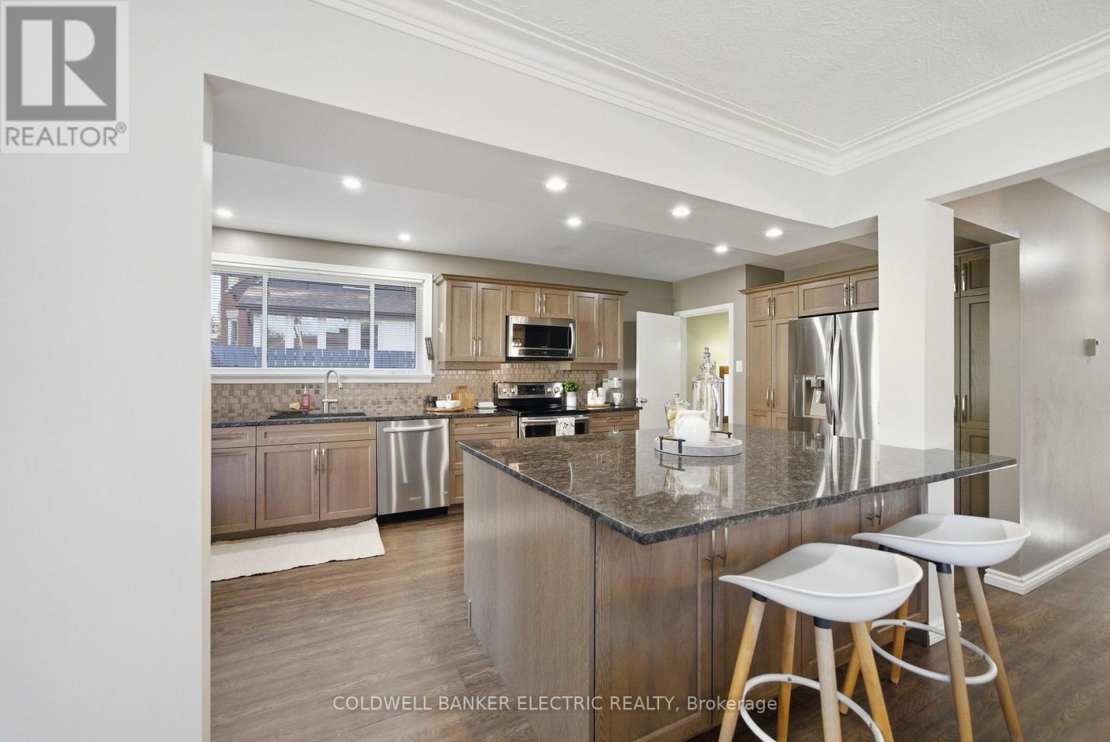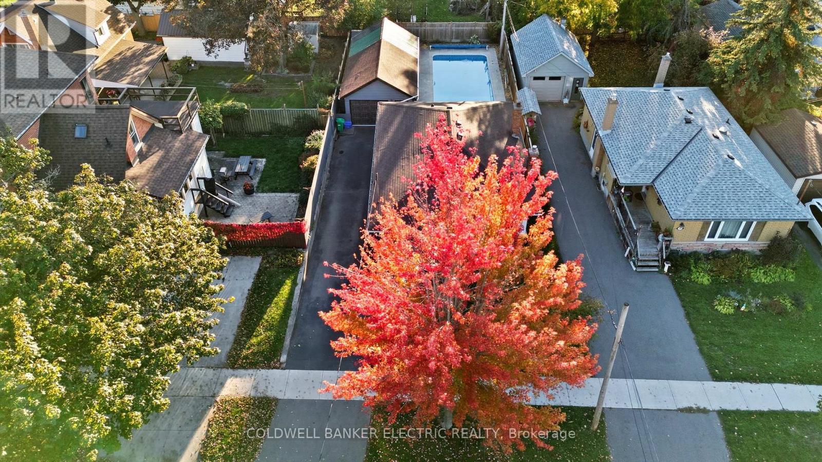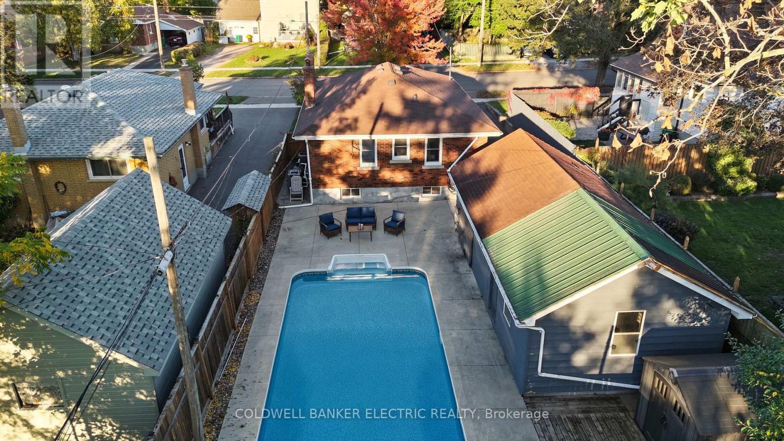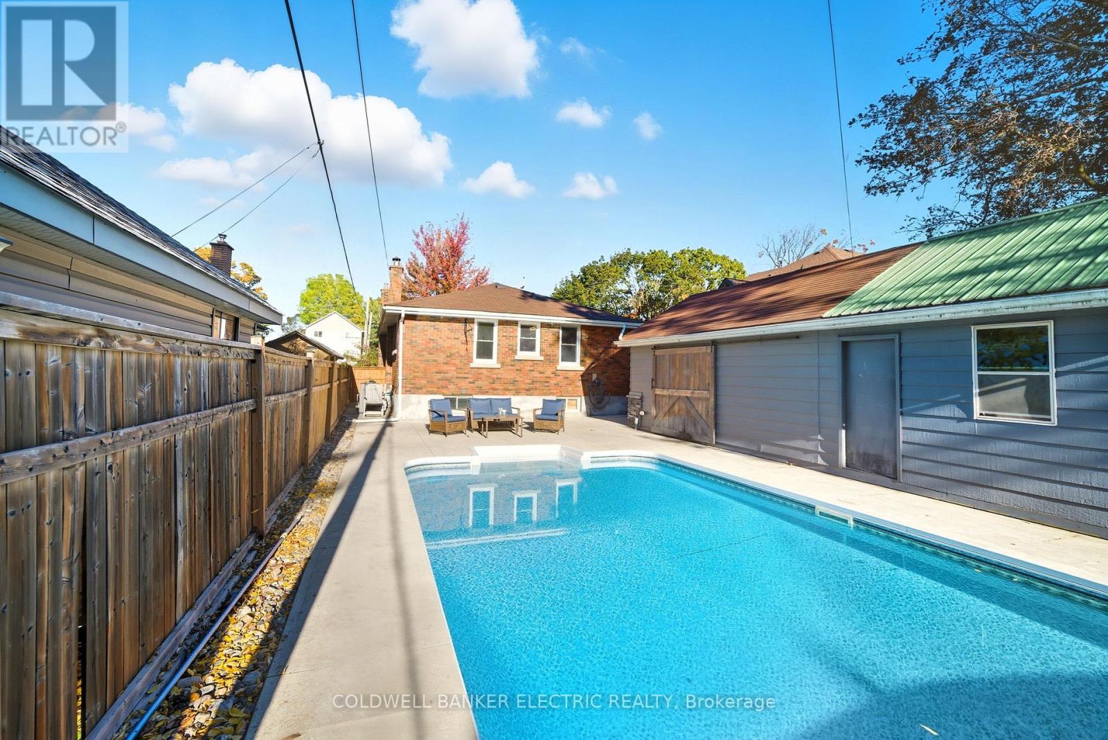 Step inside and be greeted by a stunning renovated kitchen featuring a massive island with breakfast bar, granite countertops, modern light fixtures, and an abundance of cabinetry-- good luck filling them all! The open-concept layout seamlessly connects the bright dining area and cozy living room, complete with custom-built bookshelves that add both charm and character.The main floor bathroom has been tastefully updated with a sleek modern vanity and fixtures. You'll love the updated flooring and beautiful neutral paint palette that carries throughout the main floor and into both bedrooms, creating a warm and cohesive flow.Downstairs, the finished lower level offers even more space featuring a generously sized additional bedroom, a 3-piece bathroom, a large rec room, laundry room, cold cellar, and plenty of storage. With its separate entrance, this level offers excellent in-law potential for the future.Step outside to your own backyard retreat a 33' x 15' detached garage with a large barn-style door opening to a covered porch area, perfect for a poolside bar or change room. Overlooking the 32' x 15' heated inground pool with stamped concrete surround, this backyard is designed for entertaining and relaxation. The back of the garage includes a workshop space that every hobbyist will appreciate.Situated on a quiet, tree-lined street within walking distance to schools, parks, and amenities, this home truly has it all. With its modern upgrades, functional layout, and inviting outdoor space, you can't help but want to call this your next home. EXTRAS: Inground Pool (2017) Pool Heater (2022) Central Air (2019) Furnace (2025) Hot Water Tank (2025) Custom Built-Ins (2024) (id:51158)