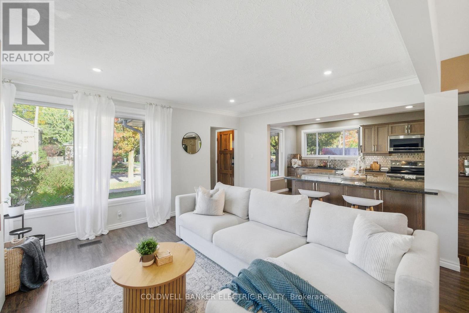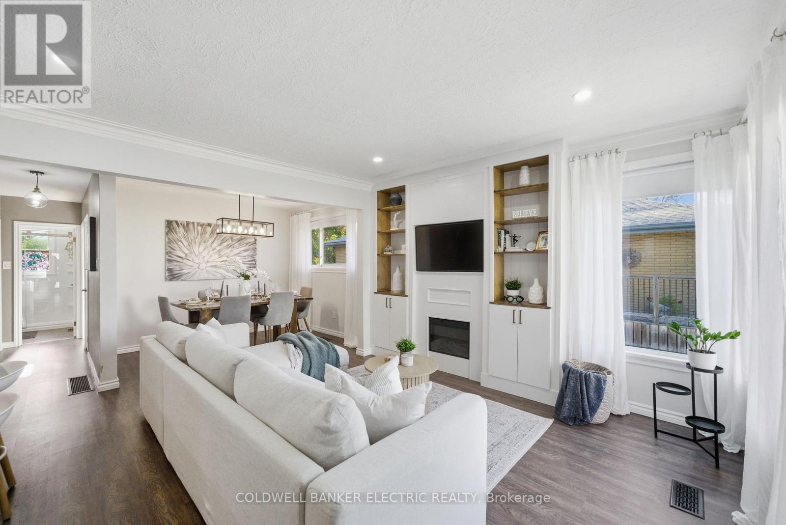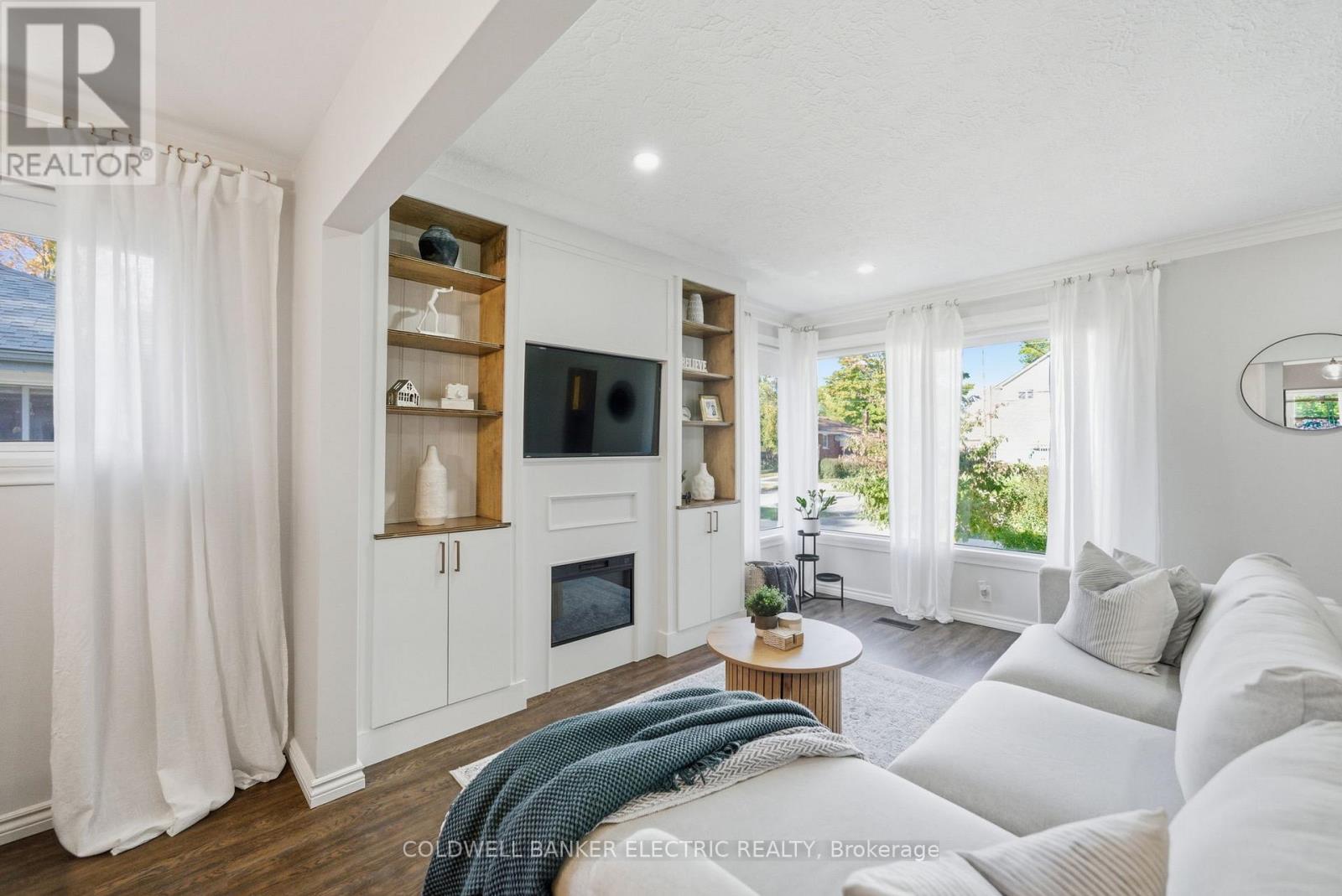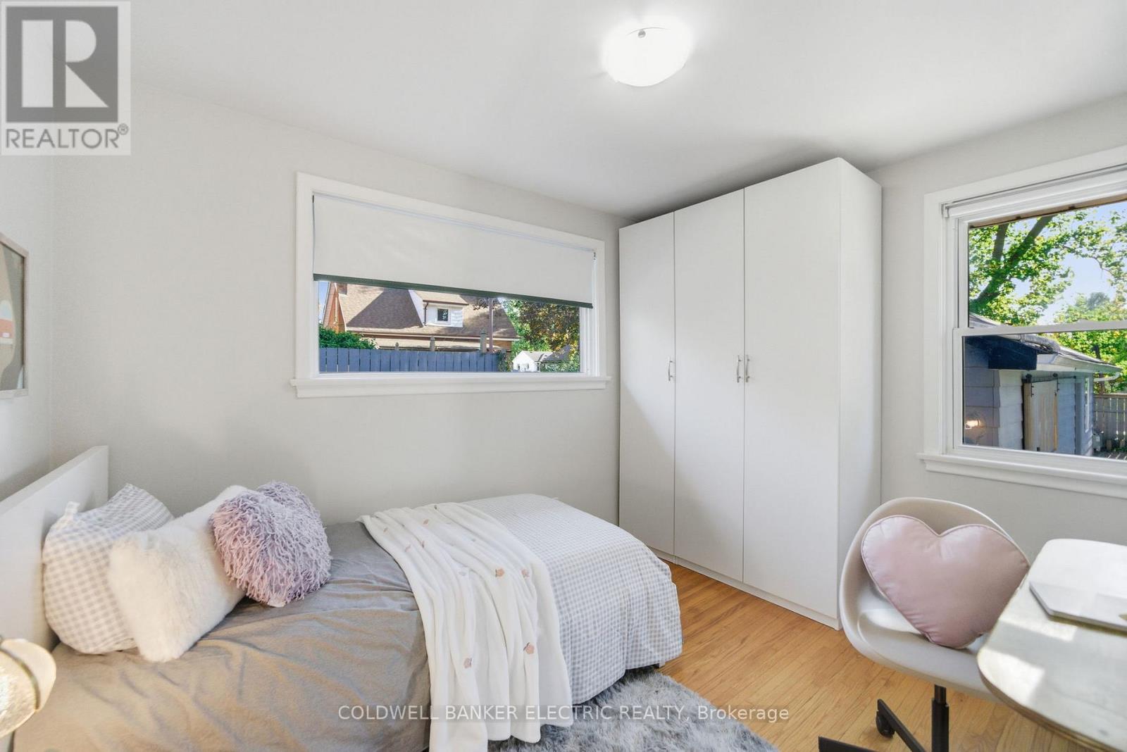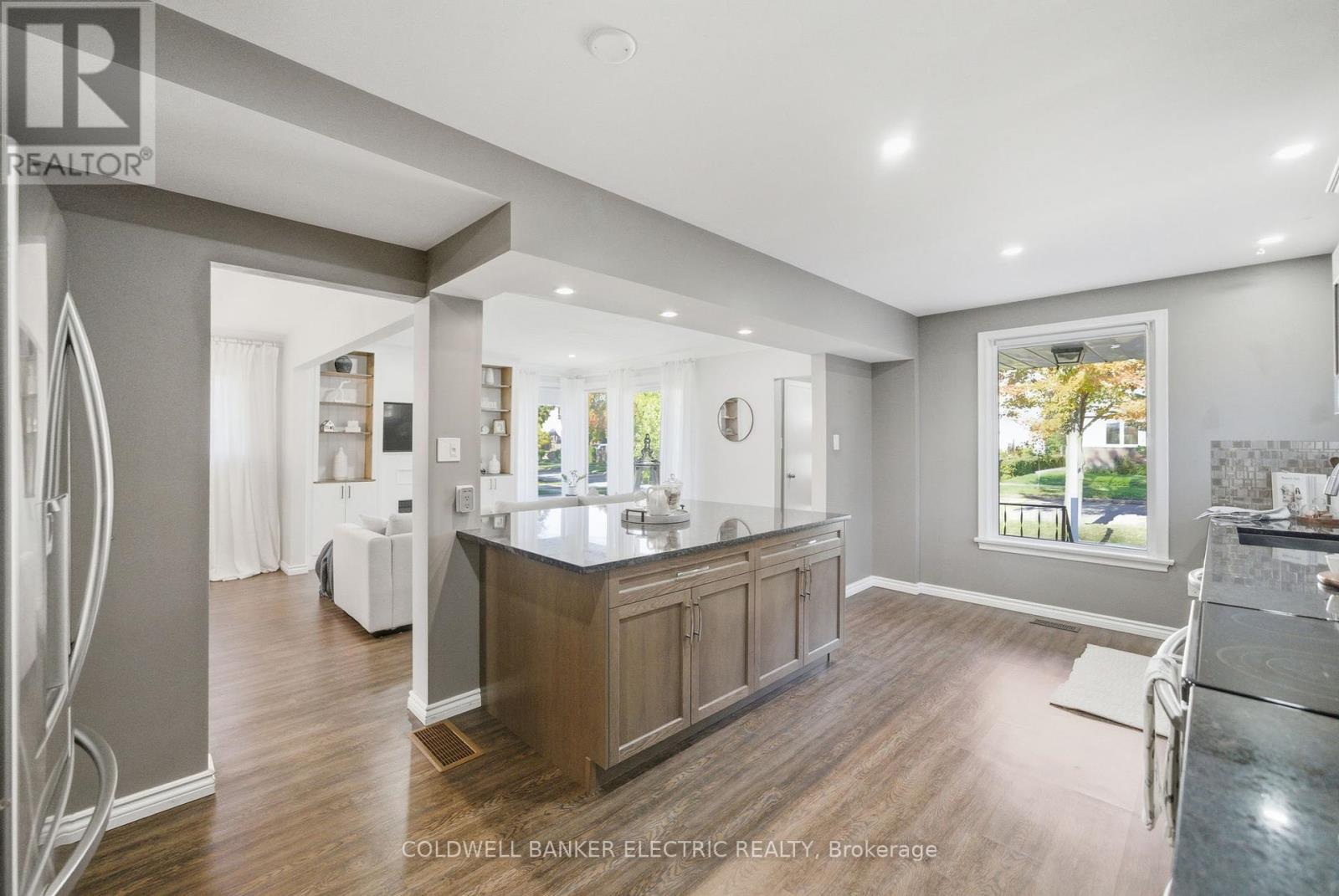 Step inside and be greeted by a stunning renovated kitchen featuring a massive island with breakfast bar, granite countertops, modern light fixtures, and an abundance of cabinetry-- good luck filling them all! The open-concept layout seamlessly connects the bright dining area and cozy living room, complete with custom-built bookshelves that add both charm and character.The main floor bathroom has been tastefully updated with a sleek modern vanity and fixtures. You'll love the updated flooring and beautiful neutral paint palette that carries throughout the main floor and into both bedrooms, creating a warm and cohesive flow.Downstairs, the finished lower level offers even more space featuring a generously sized additional bedroom, a 3-piece bathroom, a large rec room, laundry room, cold cellar, and plenty of storage. With its separate entrance, this level offers excellent in-law potential for the future.Step outside to your own backyard retreat a 33' x 15' detached garage with a large barn-style door opening to a covered porch area, perfect for a poolside bar or change room. Overlooking the 32' x 15' heated inground pool with stamped concrete surround, this backyard is designed for entertaining and relaxation. The back of the garage includes a workshop space that every hobbyist will appreciate.Situated on a quiet, tree-lined street within walking distance to schools, parks, and amenities, this home truly has it all. With its modern upgrades, functional layout, and inviting outdoor space, you can't help but want to call this your next home. EXTRAS: Inground Pool (2017) Pool Heater (2022) Central Air (2019) Furnace (2025) Hot Water Tank (2025) Custom Built-Ins (2024) (id:51158)