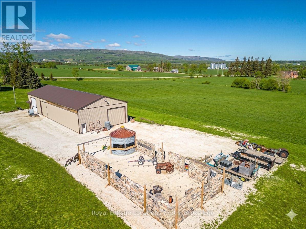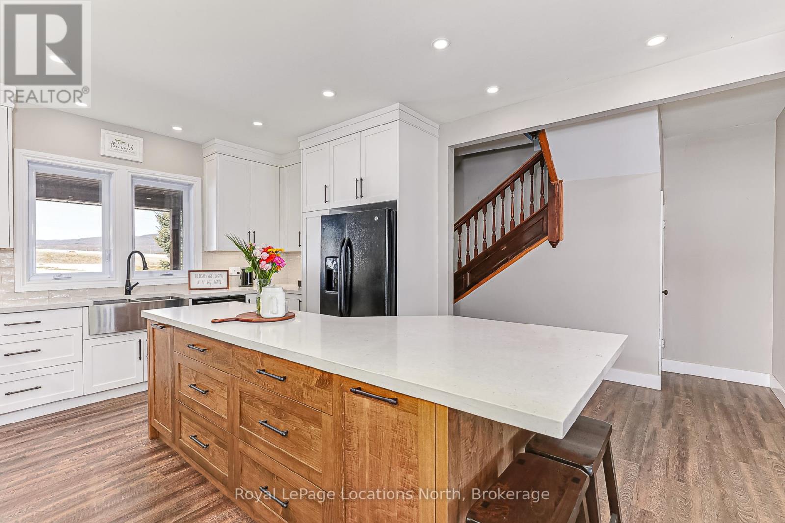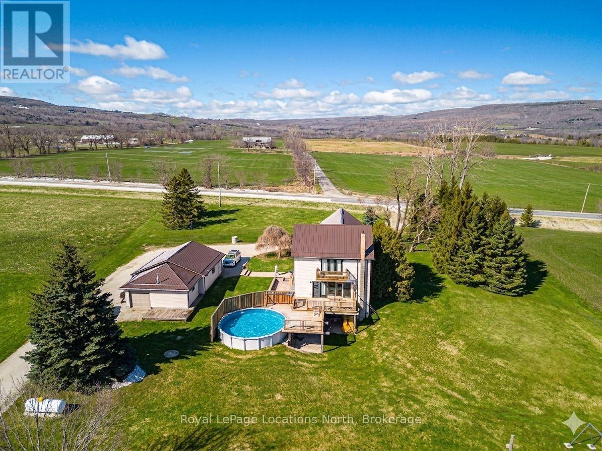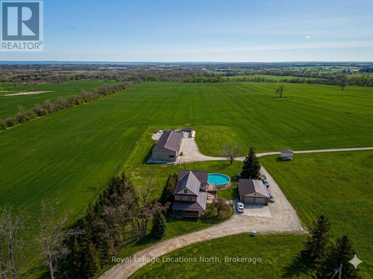 Discover the charm of country living with this 4 Bedroom, 3.5 bath, 3.5 storey renovated farmhouse with 3000 square feet of stylish open concept living space. Nestled on 2.68 acres this property offers a blend of modern comforts and rustic appeal. Walk-out from the living room to a large deck and patio area and soak in views of the Bay and refreshing pool. The gorgeous Batteaux Creek custom kitchen (2021) features a huge island with a quartz countertop, ideal for family gatherings or entertaining! Experience the ultimate retreat in the massive primary bedroom, complete with a 6 piece ensuite bath (2016) and walk-in closet. Step out onto the private balcony and take in the breathtaking views of Georgian Bay! The finished bonus room in the attic is perfect for a kid's playroom, music or art studio. The freshly painted family room on the lower level features a cozy wood stove and includes a walk-out to the expansive rear yard. Full bath and sauna complete the lower living space. The 7 foot high unfinished basement area is ideal for storage. Enjoy a morning coffee on the charming wrap around veranda. Steel roof on house and garage, windows and exterior doors all replaced in 2018. The 26 x 26 detached, double car garage has an attached 14 x 23 propane-heated workshop area. The quality built 2018, 40 x 112 outbuilding consists of a 32 x 40 shop with a 16 foot ceiling and is roughed-in for in-floor heating. 14 x 16 foot insulated overhead and slider doors. Impressive 40 x 80 cold storage area complete with a storage mezzanine. Primary underground service, 50kva transformer, 200 amp service to the shop area and central metering. From hobbies to business ventures, the uses for this building are endless! The original barn foundation is transformed into an outdoor party area complete with a silo converted bar! This is a very unique and special property located just minutes to Collingwood, Blue Mountain, private ski clubs and golf courses with a stunning million dollar view! (id:51158)