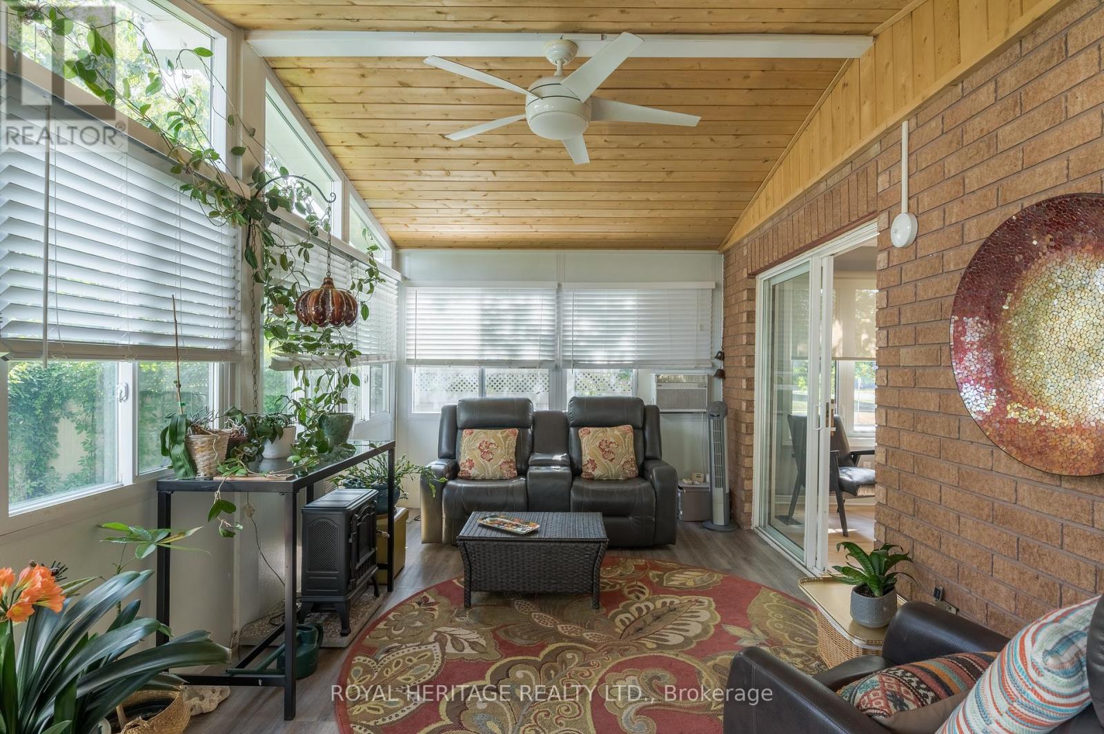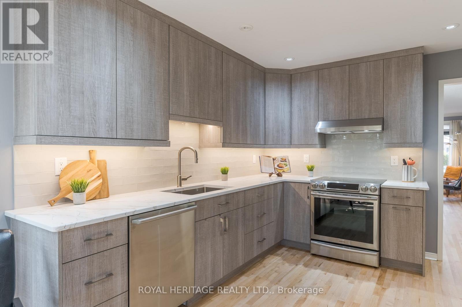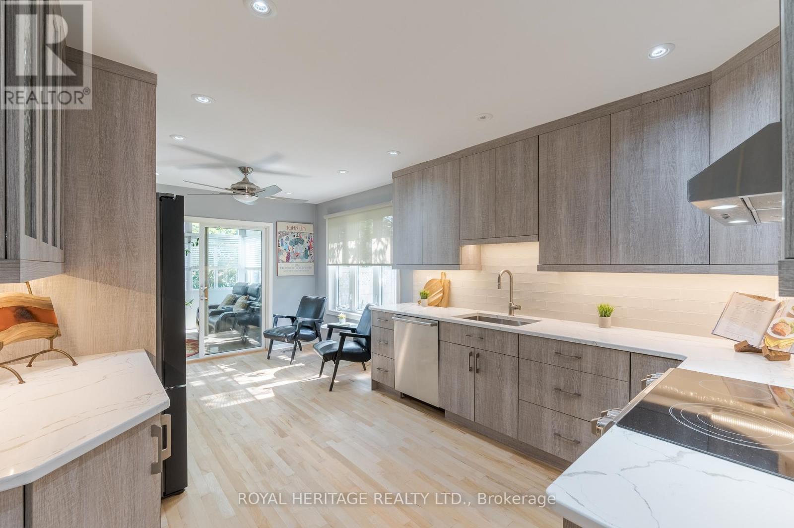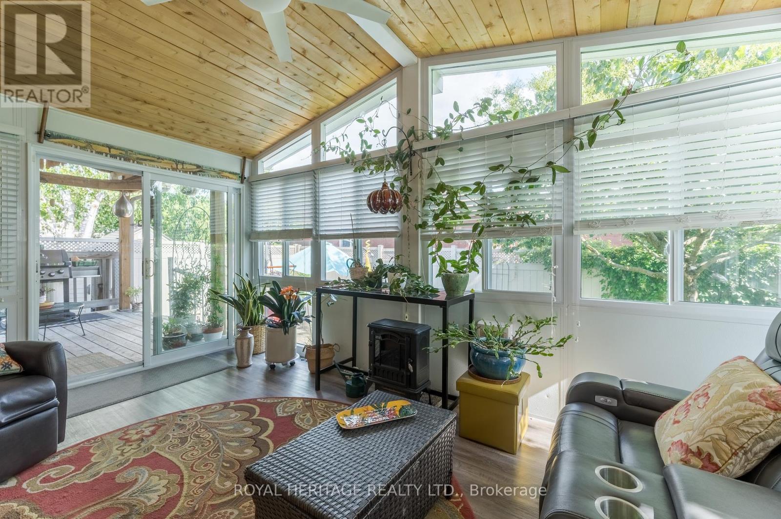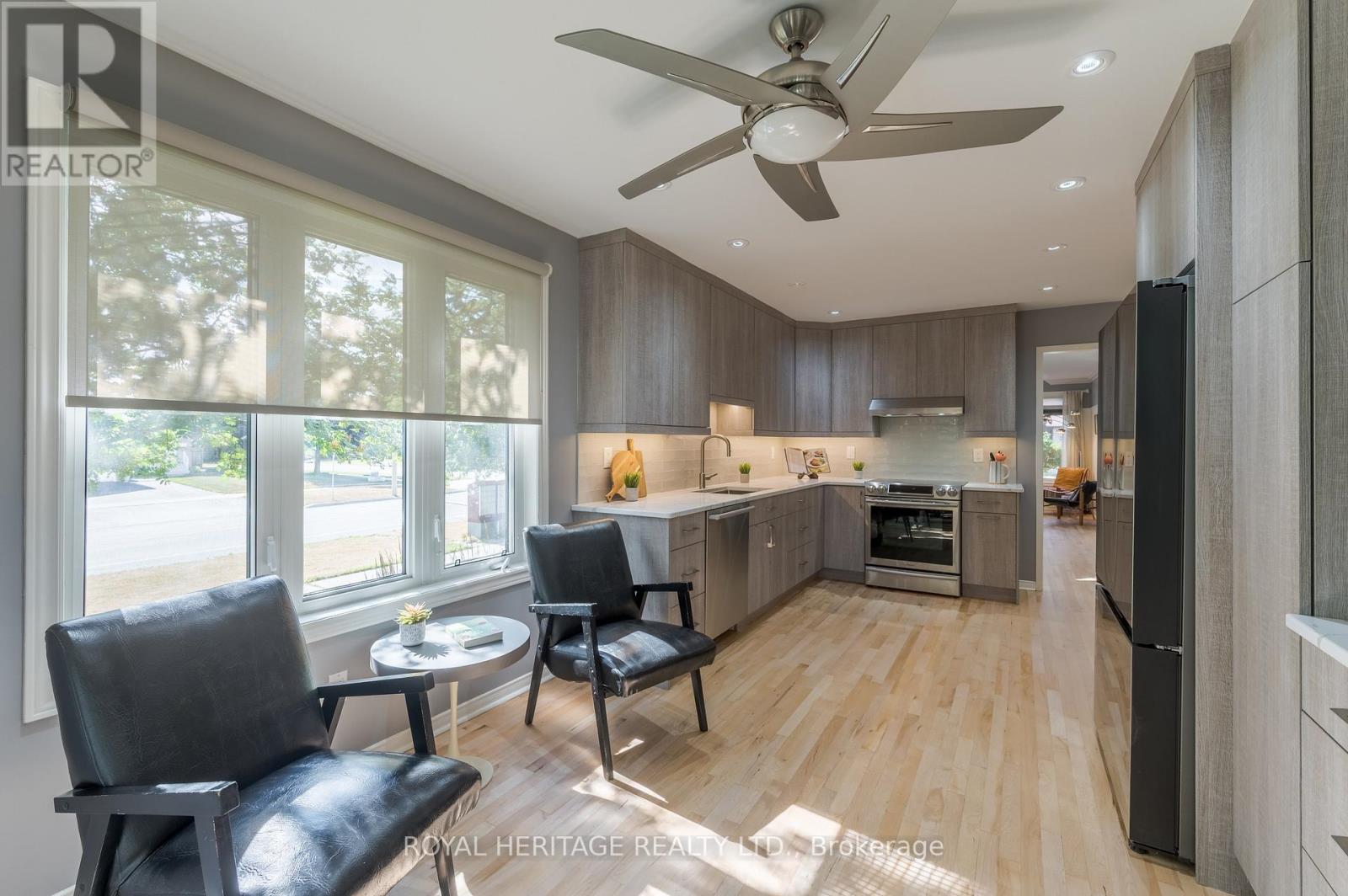 A well-maintained brick bungalow set on a professionally landscaped corner lot in Peterborough's sought-after west end. Offering three bedrooms, a 3-piece bath with a large walk-in shower, and main-floor laundry, this home is perfect for those seeking the ease and convenience of one-level living. The open-concept living and dining area showcases hardwood floors and an abundance of natural light. Beautifully appointed, the modern and stylish eat-in kitchen features high-end quartz countertops, soft-close floor-to-ceiling cabinetry, wood-dovetail full-extension drawers, undermounted lighting, and stainless-steel appliances (2019). As a bonus, the sunroom offers a comfortable space to relax and unwind. The fully finished basement extends the living space with a spacious family room complete with a gas fireplace, a versatile rec room or office, a four-piece bath, and a generous storage/workshop area. The private, fully fenced backyard, enclosed with low-maintenance composite fencing, provides an inviting outdoor oasis with a covered deck, interlocking stone patio, and raised garden beds. The oversized garage includes two man doors and direct access to the home's front foyer. Major updates include: shingles (2019), triple-glaze windows (2015), front door (2019), custom window coverings (2019), furnace and AC (2019), Generac generator (2020), high-efficiency washer/dryer (2024), and landscaping (2025). Don't miss out on this turnkey property in a prime location! (id:51158)