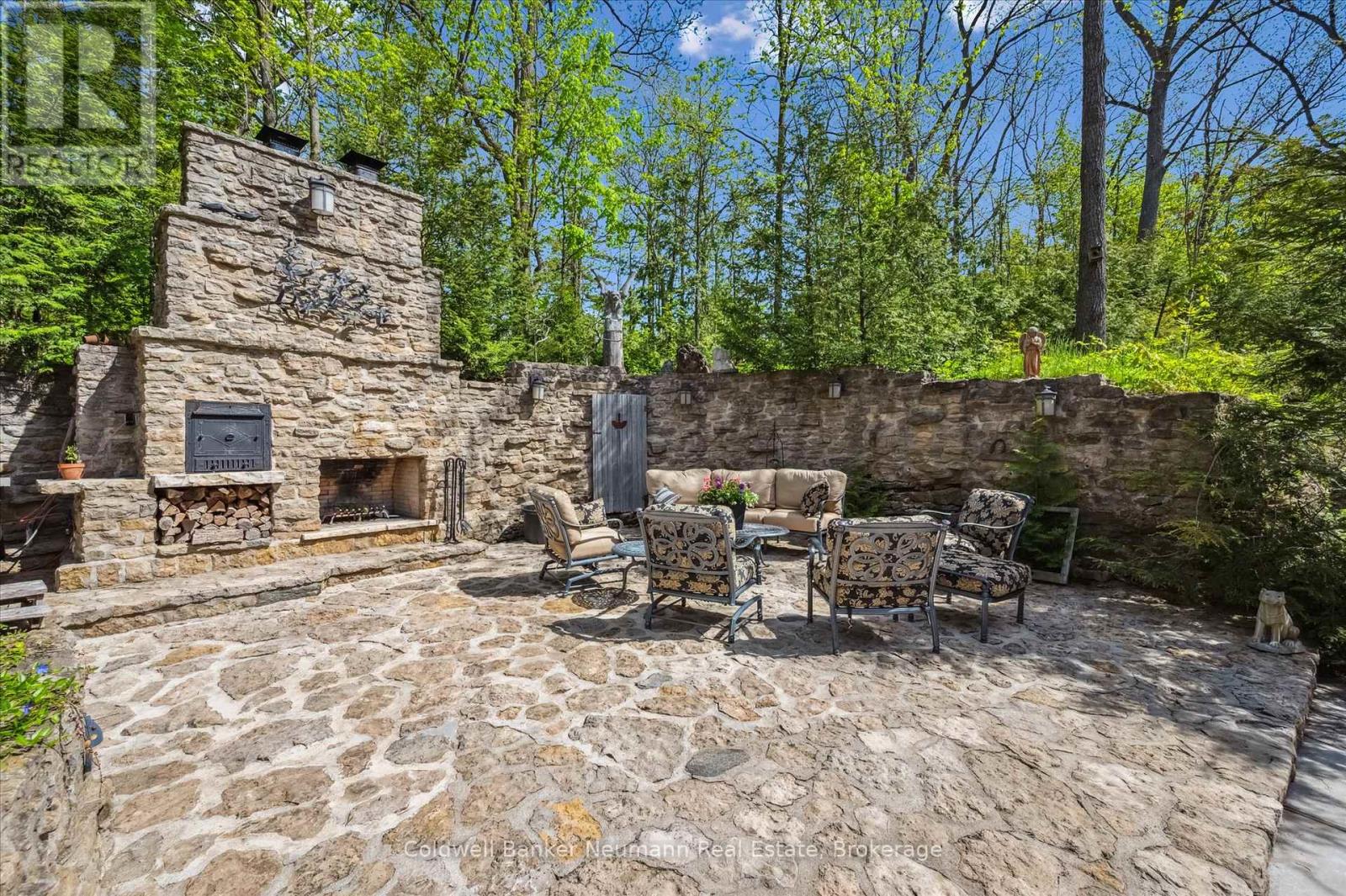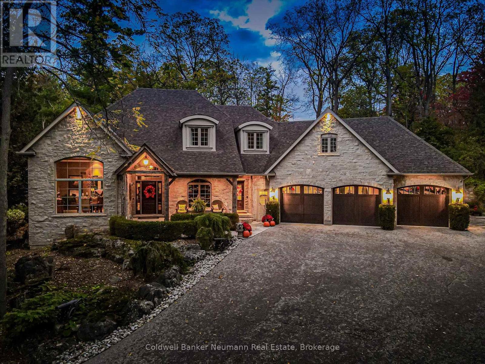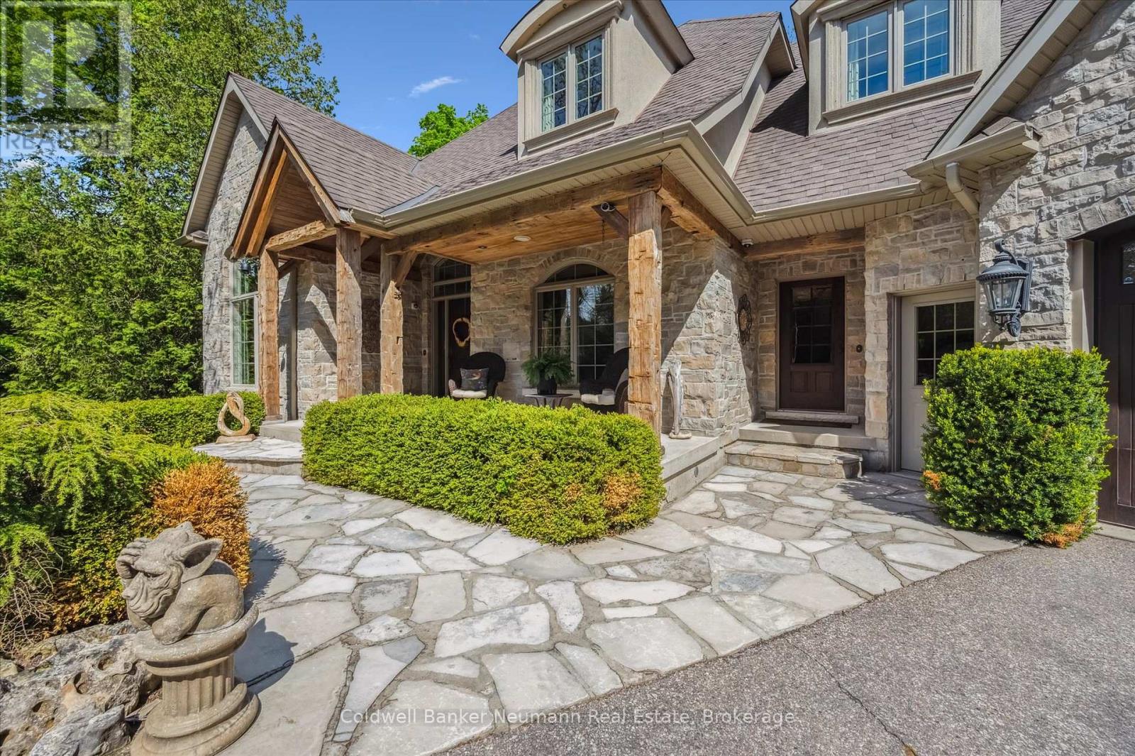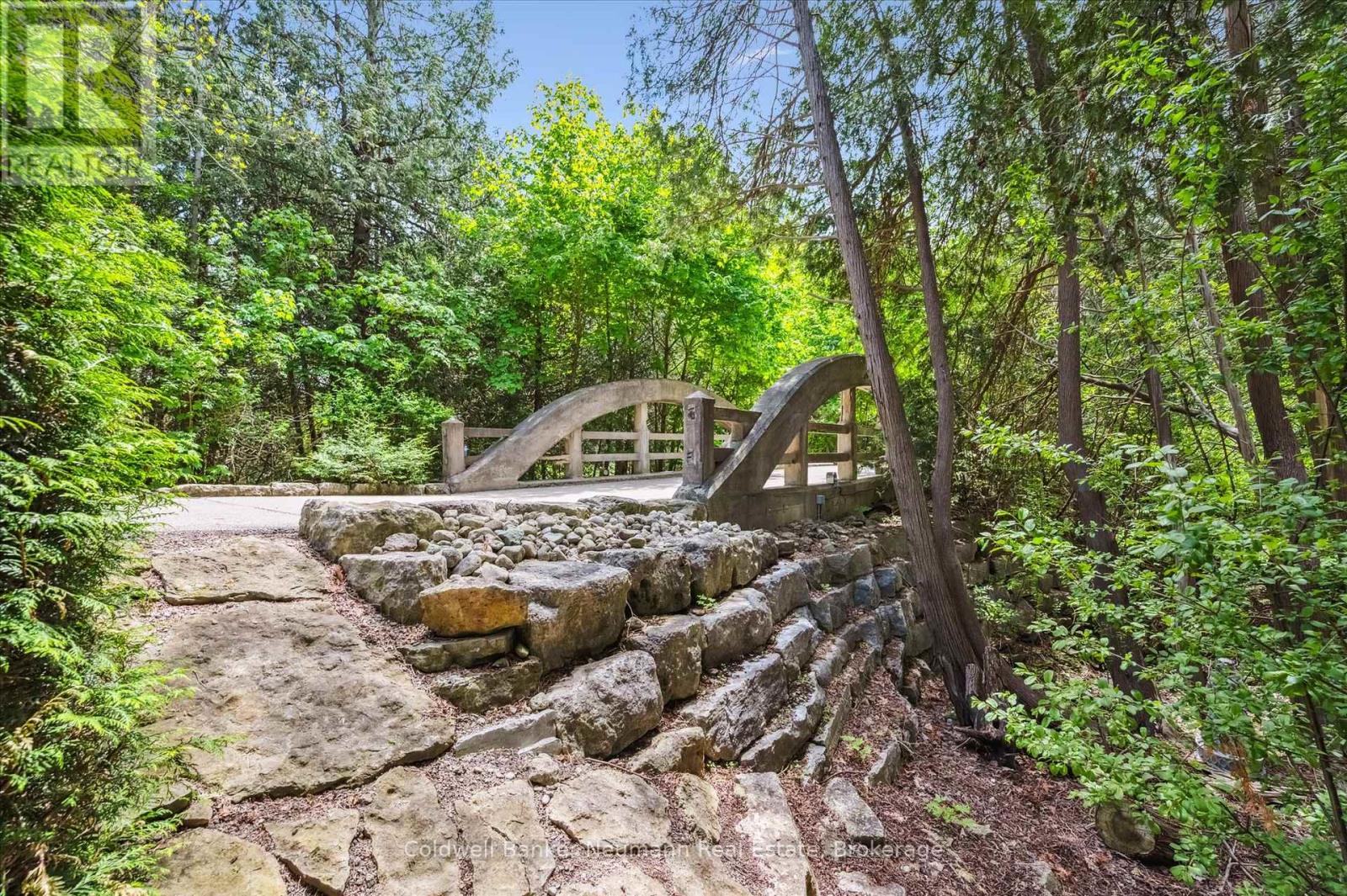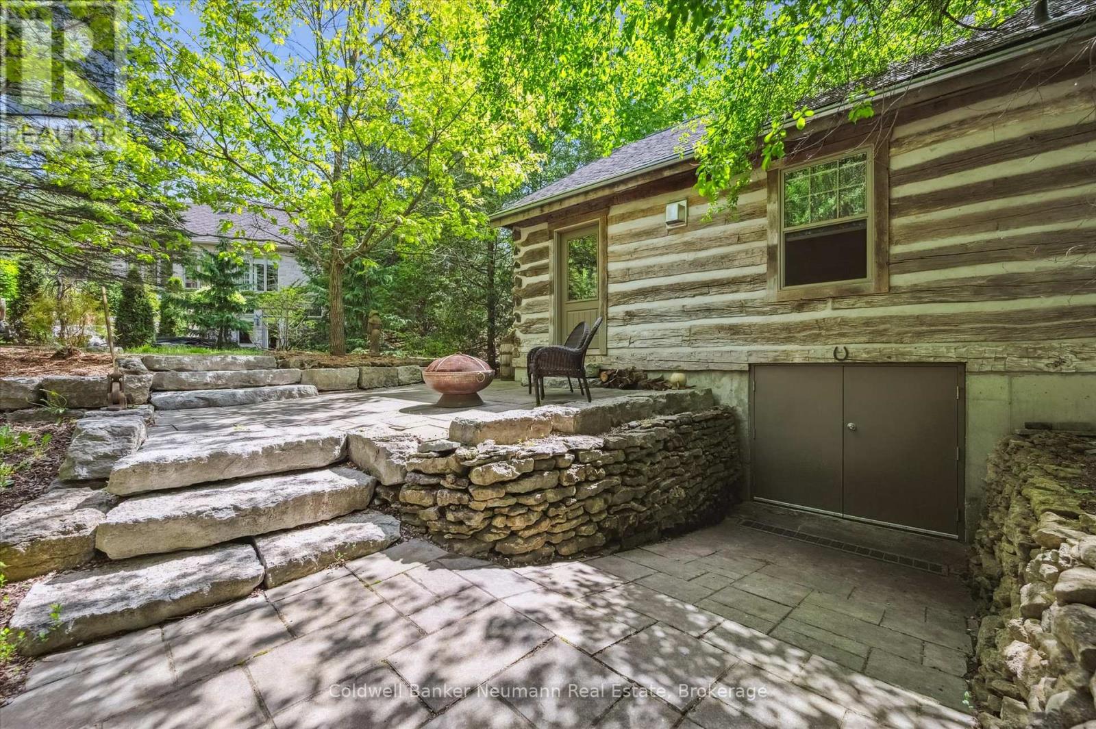 Set against the limestone escarpment on a private 1.1-acre lot at the end of a quiet road in Rockwood, this extraordinary retreat is surrounded by conservation land, offering complete privacy and a deep connection to nature. What began as untouched forest became an architectural masterpiece - the result of over three years of meticulous planning, permitting, and passion. Eighteen feet of rock were carved away to shape the foundation. A centuries-old log cabin from Ariss was carefully deconstructed and reassembled on-site, bridging history with modern innovation. Even the entrance was designed to impress - complete with its own handcrafted bridge leading to the home's grand arrival. Inside, the craftsmanship speaks for itself. Soaring cathedral ceilings, oversized windows, and panoramic forest views create an atmosphere that's both inspiring and serene. The main living area opens onto a European-style stone courtyard, while the primary suite feels like a private spa, complete with a luxurious ensuite and its own tranquil waterfall outlook. Upstairs, two additional bedrooms and a full bath offer comfort and flexibility for family or guests. The walk-out basement opens to a stunning flagstone patio complete with a hot tub - an ideal spot to unwind in total tranquility. Inside, enjoy the well-appointed entertainment level featuring a custom bar and private wine cellar, a pool table area perfect for friendly competition, a theatre room to catch the big game, a dedicated gym space for workouts, a full bathroom, and more. And then there's the historic 550 sq. ft. log cabin - beautifully restored and ready to serve as a guest house, creative studio, or personal sanctuary. Outfitted with a wet bar, gas fireplace, full bathroom, and ample storage, it's a destination all its own. A triple-car garage with lift provides ample room for vehicles, hobbies, and adventure gear, blending practicality with luxury. Schedule a private showing today to experience 198 Pasmore. (id:51158)