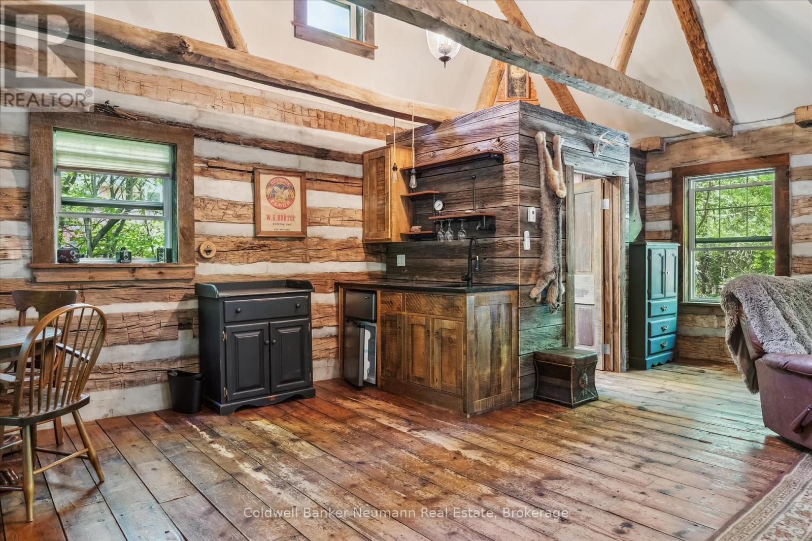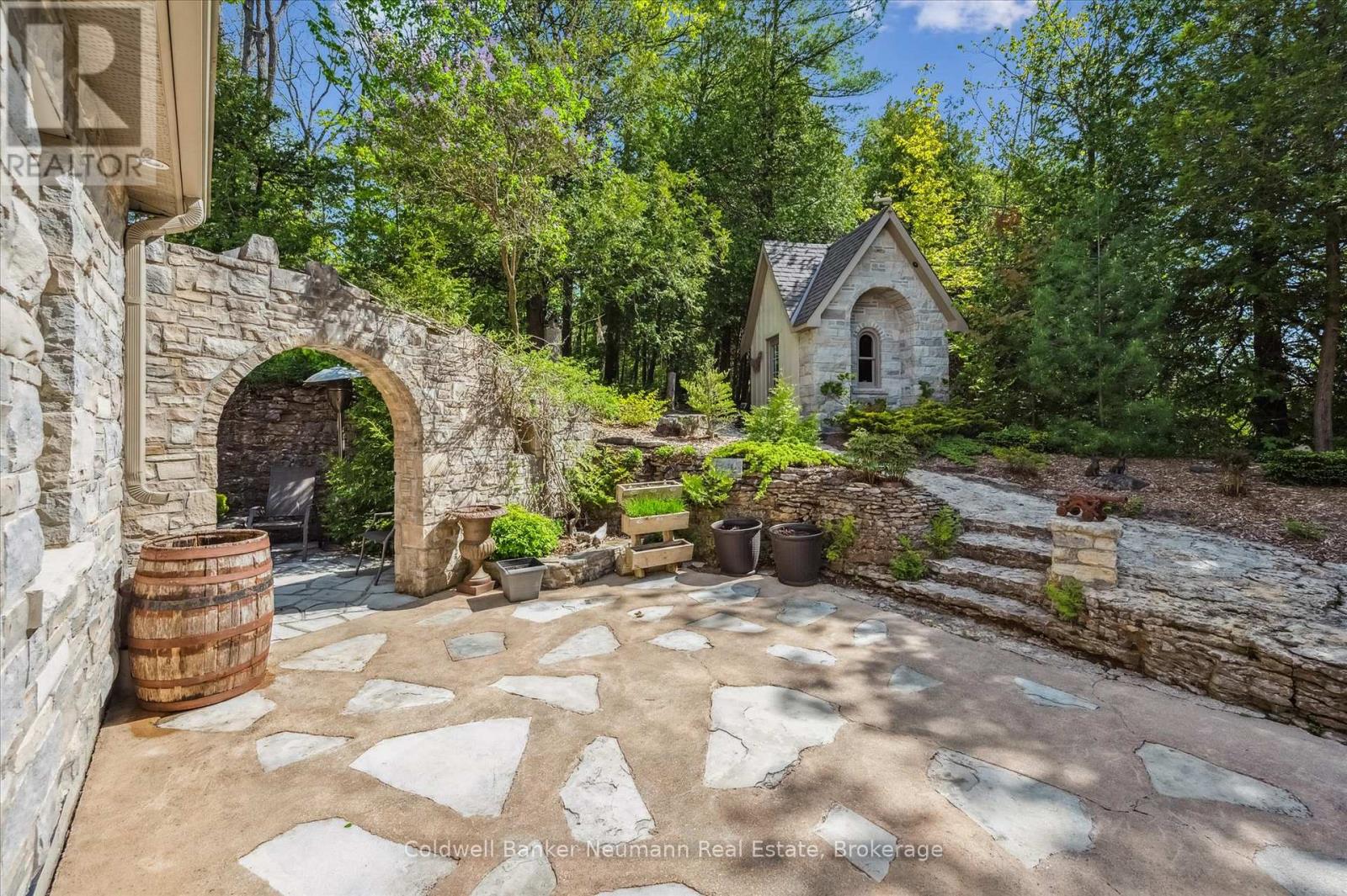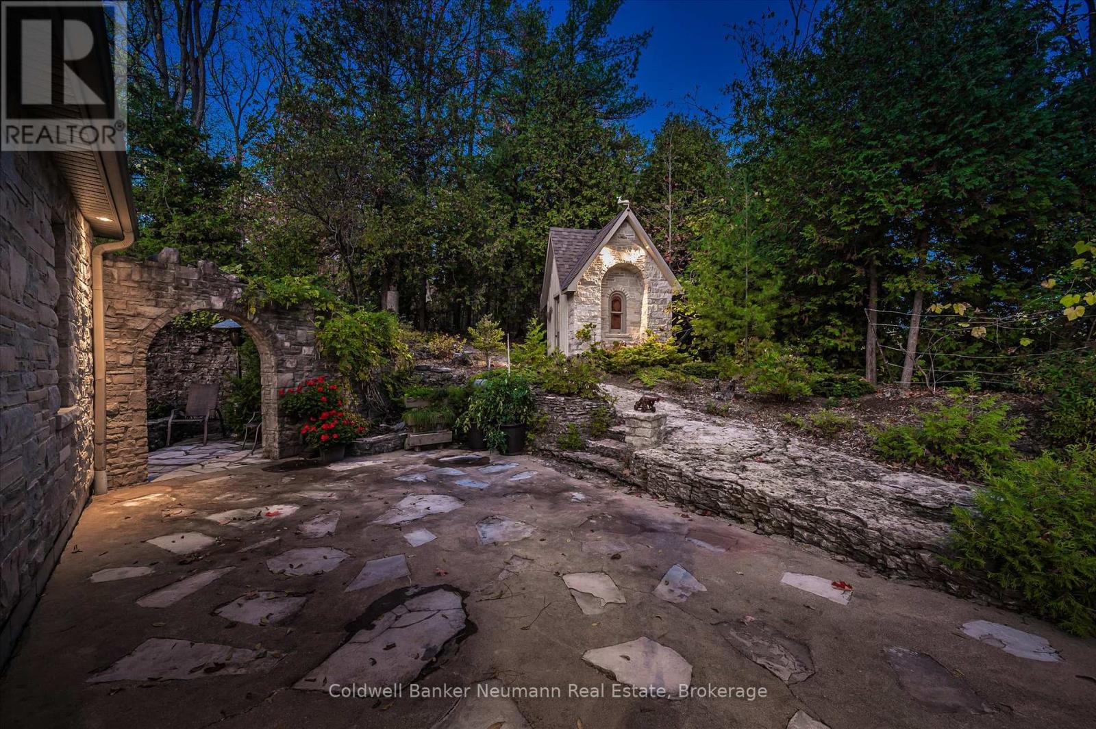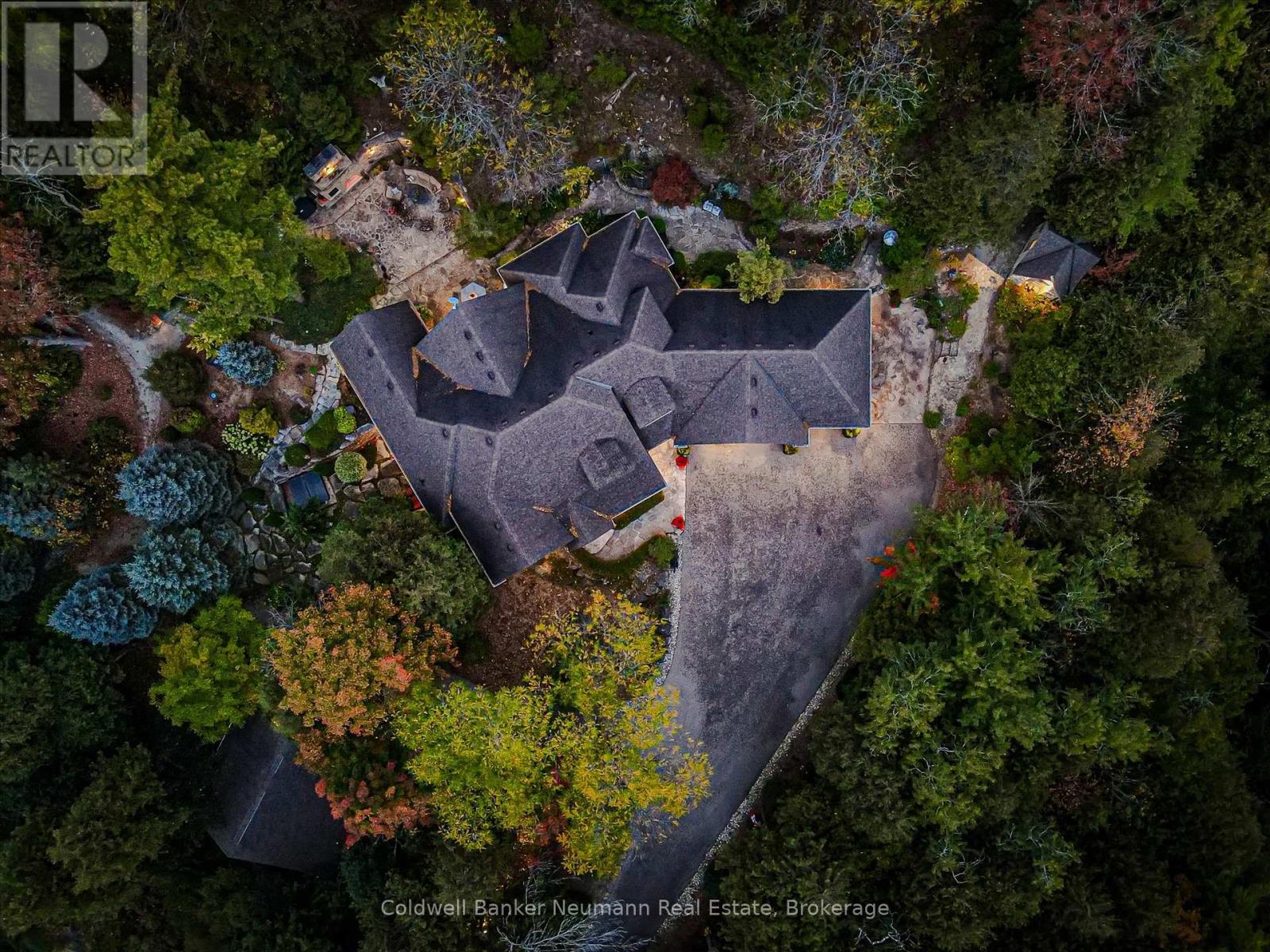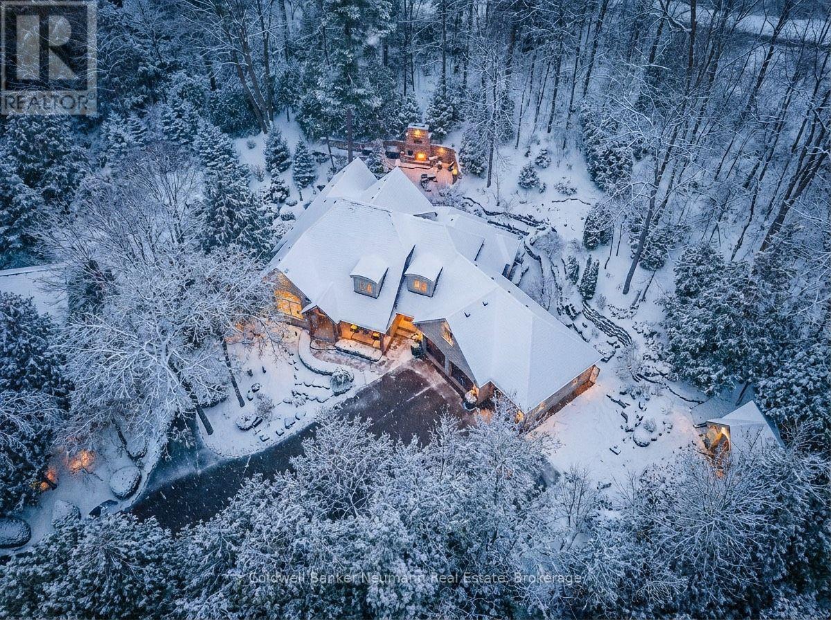 Set against the limestone escarpment on a private 1.1-acre lot at the end of a quiet road in Rockwood, this extraordinary retreat is surrounded by conservation land, offering complete privacy and a deep connection to nature. What began as untouched forest became an architectural masterpiece - the result of over three years of meticulous planning, permitting, and passion. Eighteen feet of rock were carved away to shape the foundation. A centuries-old log cabin from Ariss was carefully deconstructed and reassembled on-site, bridging history with modern innovation. Even the entrance was designed to impress - complete with its own handcrafted bridge leading to the home's grand arrival. Inside, the craftsmanship speaks for itself. Soaring cathedral ceilings, oversized windows, and panoramic forest views create an atmosphere that's both inspiring and serene. The main living area opens onto a European-style stone courtyard, while the primary suite feels like a private spa, complete with a luxurious ensuite and its own tranquil waterfall outlook. Upstairs, two additional bedrooms and a full bath offer comfort and flexibility for family or guests. The walk-out basement opens to a stunning flagstone patio complete with a hot tub - an ideal spot to unwind in total tranquility. Inside, enjoy the well-appointed entertainment level featuring a custom bar and private wine cellar, a pool table area perfect for friendly competition, a theatre room to catch the big game, a dedicated gym space for workouts, a full bathroom, and more. And then there's the historic 550 sq. ft. log cabin - beautifully restored and ready to serve as a guest house, creative studio, or personal sanctuary. Outfitted with a wet bar, gas fireplace, full bathroom, and ample storage, it's a destination all its own. A triple-car garage with lift provides ample room for vehicles, hobbies, and adventure gear, blending practicality with luxury. Schedule a private showing today to experience 198 Pasmore. (id:51158)