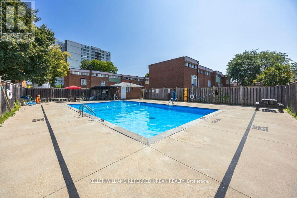 $618.06 MonthlySpacious multi-level, 3-bedroom, 4-bathroom end-unit townhome with attached single-car garage and private driveway parking in a well-maintained, community-oriented complex. Corner location offers extra windows and light, with the feel of a semi-detached home. Complex features new fencing & updated streetlights, as well as a heated outdoor pool, privately managed by owners who care. Main level features a bright living room with a separate dining area overlooking the living space that connects into the kitchen. Upper level offers a primary bedroom with updated laminate flooring (2025) & 2-piece ensuite. Hallway flooring was updated in 2025. Lower level is an above grade family room with walkout to the backyard featuring new fencing and new steps (June 2025), as well as a newly sodded front lawn (June 2025). Basement has a utility/laundry area with lots of storage space & hot water tank (rental, 2 years old). Electrical panel is also 2 years old (in garage). Freshly painted throughout (including closets) & driveway resurfaced/sealed in 2025. Cable included in Maintenance cost. Family-friendly neighborhood close to all amenities and transit. Across from Oakdale Golf & Country Club, with Hwy 401 less than 5 minutes away. Steps to TTC, schools, community centre, library, parks, shopping, hospital and so much more! **Note: all furniture can be bought separate from the listing. (id:51158)