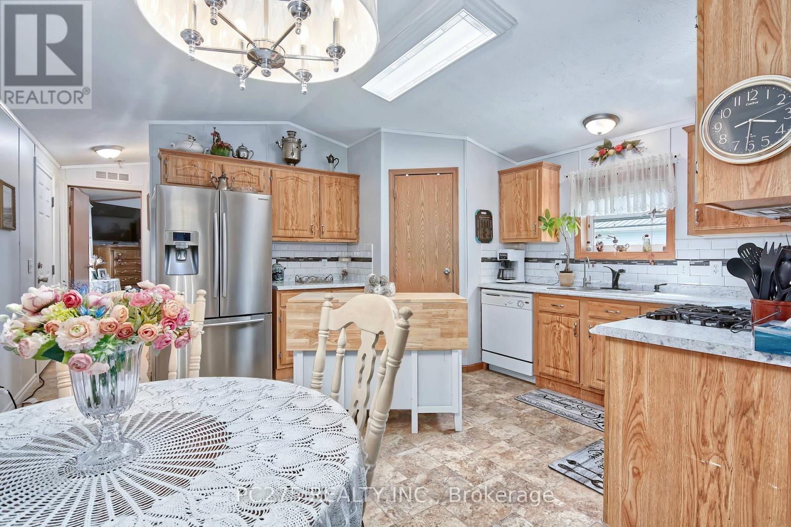 Welcome to 20 Linden Blvd in The Meadows. A sought-after 55+ adult lifestyle community just minutes from Tillsonburg. This spacious, well-maintained 3-bedroom, 2-bathroom home is one of the largest models available, offering over 1,200 sq.ft. of comfortable, low-maintenance living. Enjoy a bright, open-concept layout with vaulted ceilings, an oversized eat-in kitchen, generous storage, and a sunny front porch perfect for your morning coffee. The layout includes a primary suite with ensuite bath and walk-in closet, plus two additional bedrooms ideal for guests, hobbies, or a home office. A unique 3-season sunroom offers peaceful relaxation, while the landscaped garden lot and shed provide outdoor comfort and convenience without the upkeep of a full-sized home. Located in one of the regions best-managed communities -- with friendly neighbours, scenic green space, and easy access to shopping, services, and the beaches of Port Burwell -- this home is perfect for downsizers, retirees, or those seeking a welcoming, turnkey lifestyle. Monthly lot fee ($517.71 + $35.37 water test) covers site rental, water, snow plowing, garbage pickup, park management, and common area maintenance, ensuring a hassle-free living experience. (id:51158)