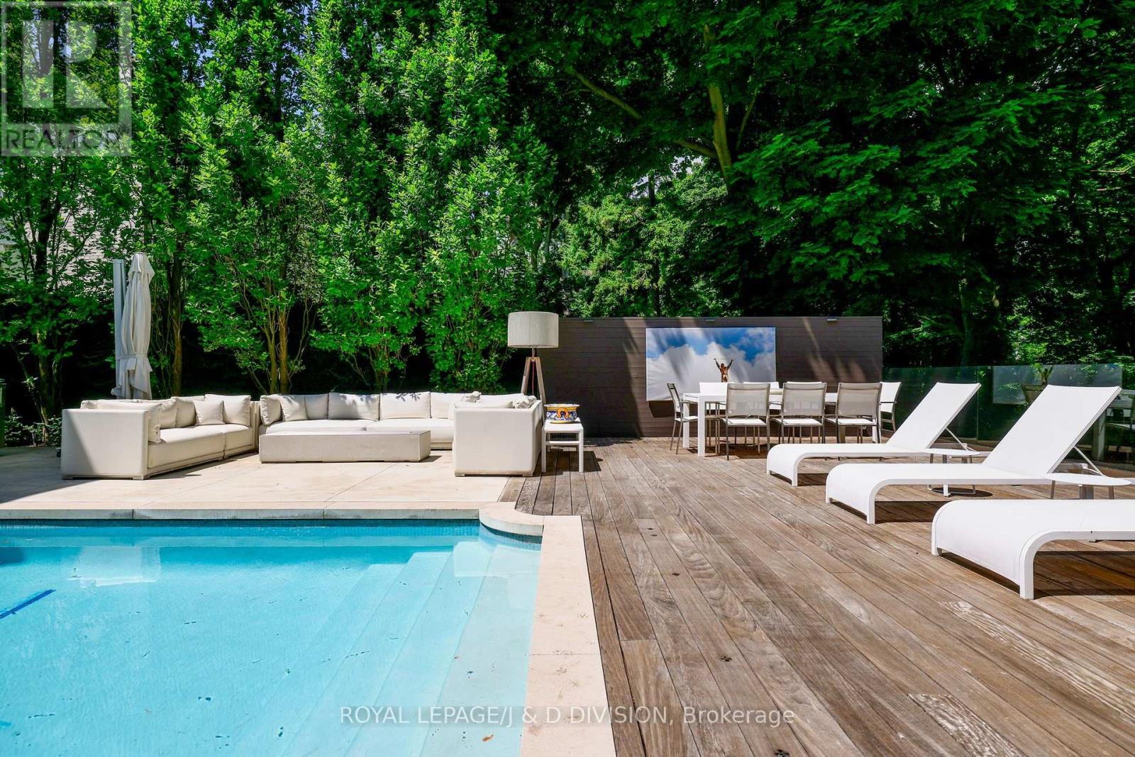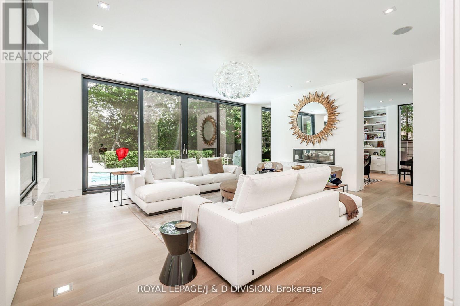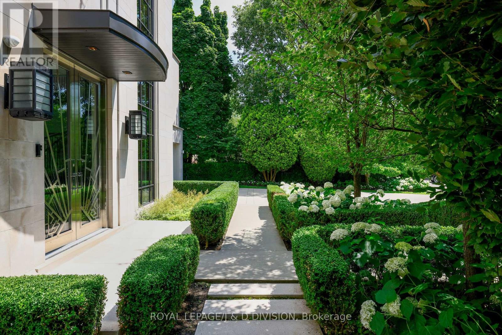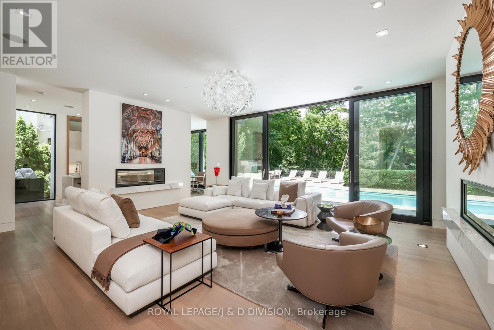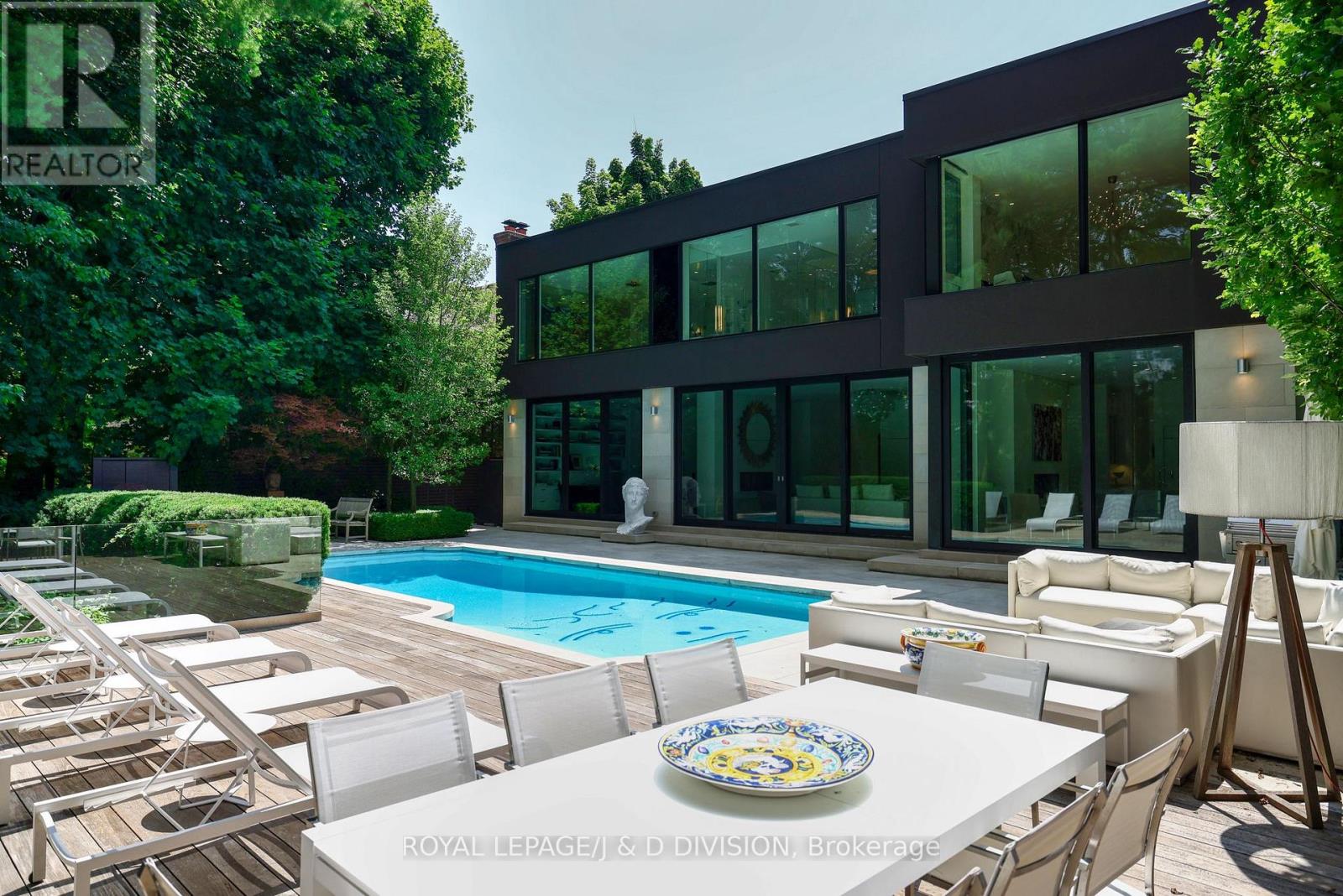 MORE THAN JUST A RESIDENCE...A WORK OF ART. Designed by Bill Mockler and Drawing Room Architect Inc. and constructed by Teddington Homes. A sophisticated contemporary design with breathtaking ravine views. The front facade is adorned with a custom carved stone statue, smooth limestone, majestic white flowering pear trees flank the front walkway to a stainless steel & glass double door entry, marble foyer, and 10 ceilings. Natural light throughout the residence with massive floor-to-ceiling windows, skylights, and a striking two-storey foyer inviting the beauty of the outdoors inside. The Great room is balanced with two fireplaces and ever changing seasonal views of the garden, formal dining room with refined details, fireplace, & opens to private patio. Chefs kitchen with seamless cabinetry, immense marble island, premium appliances, breakfast area, servery, and pantry. Family room with custom millwork, fireplace, walk out to the garden, and an exquisite powder room. Luxurious primary suite, six-piece spa bath, massive dressing room (originally planned as a 4th bedroom), two other bedrooms with ensuites, and full laundry room. Lower level with recreation room, additional bedroom/exercise rm, bathroom, second laundry rm and wine cellar. The fluid design creates spacious rooms that engage the senses at every turn with, generous wall space for the art collector, high-end finishes, negative trim detailing, luxurious marble surfaces, custom millwork, archways that stretch to the ceiling, exquisite wood elements, automated blinds that recess into walls, Control4 system for lights, speakers, and security. Spectacular 75 x 300 extremely private lot with inviting gunite pool, sundeck, sitting area and outdoor dining area - an oasis! Unparalleled opulent living for those seeking elegance, style, and ultimate privacy on one of Toronto's most coveted streets. Steps to Rosedale Golf Club, fine dining & boutique shops on Yonge St in the prestigious Teddington Park neighbourhood. (id:51158)