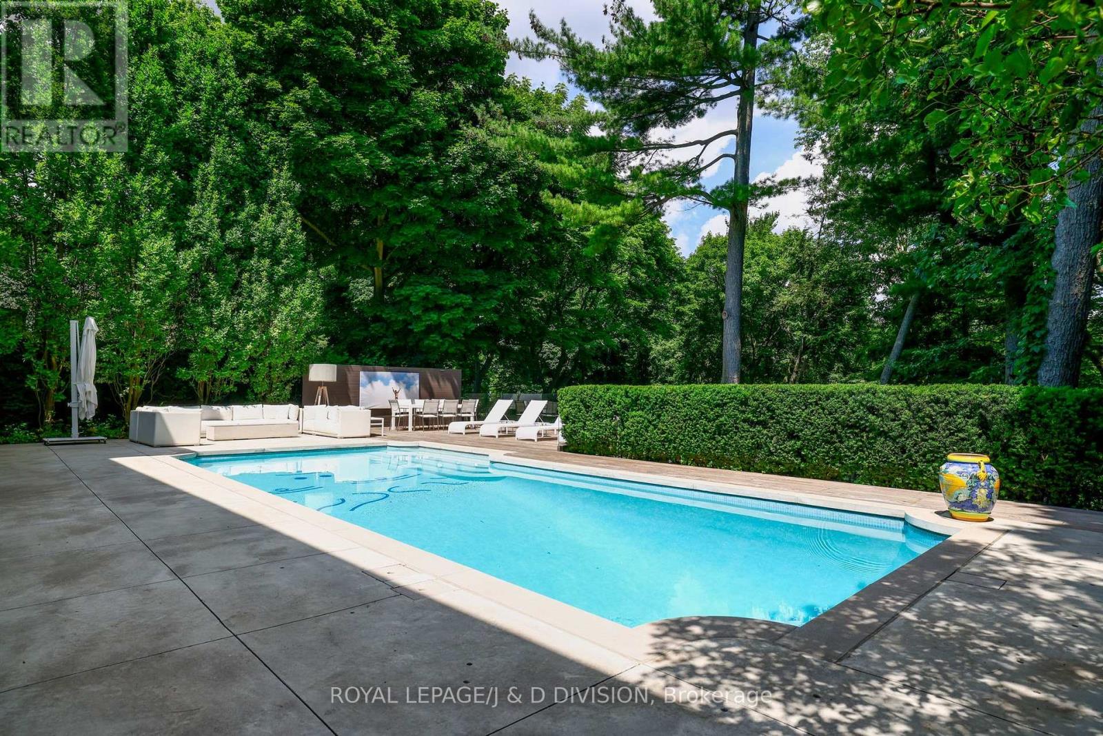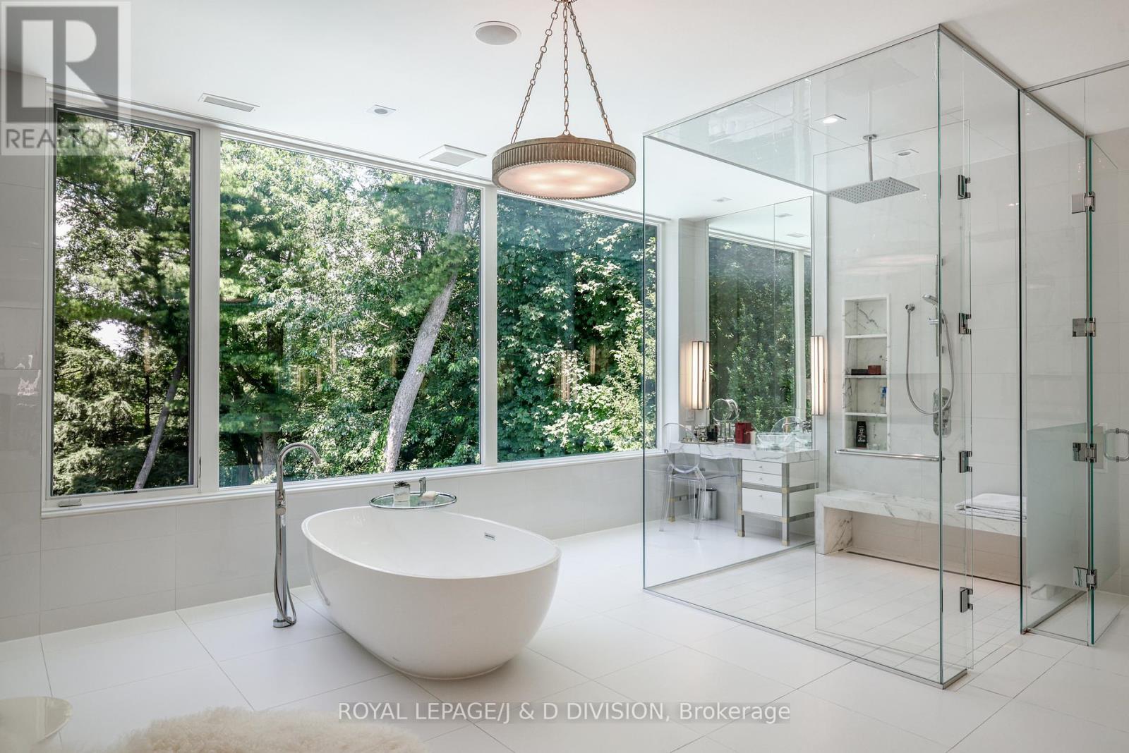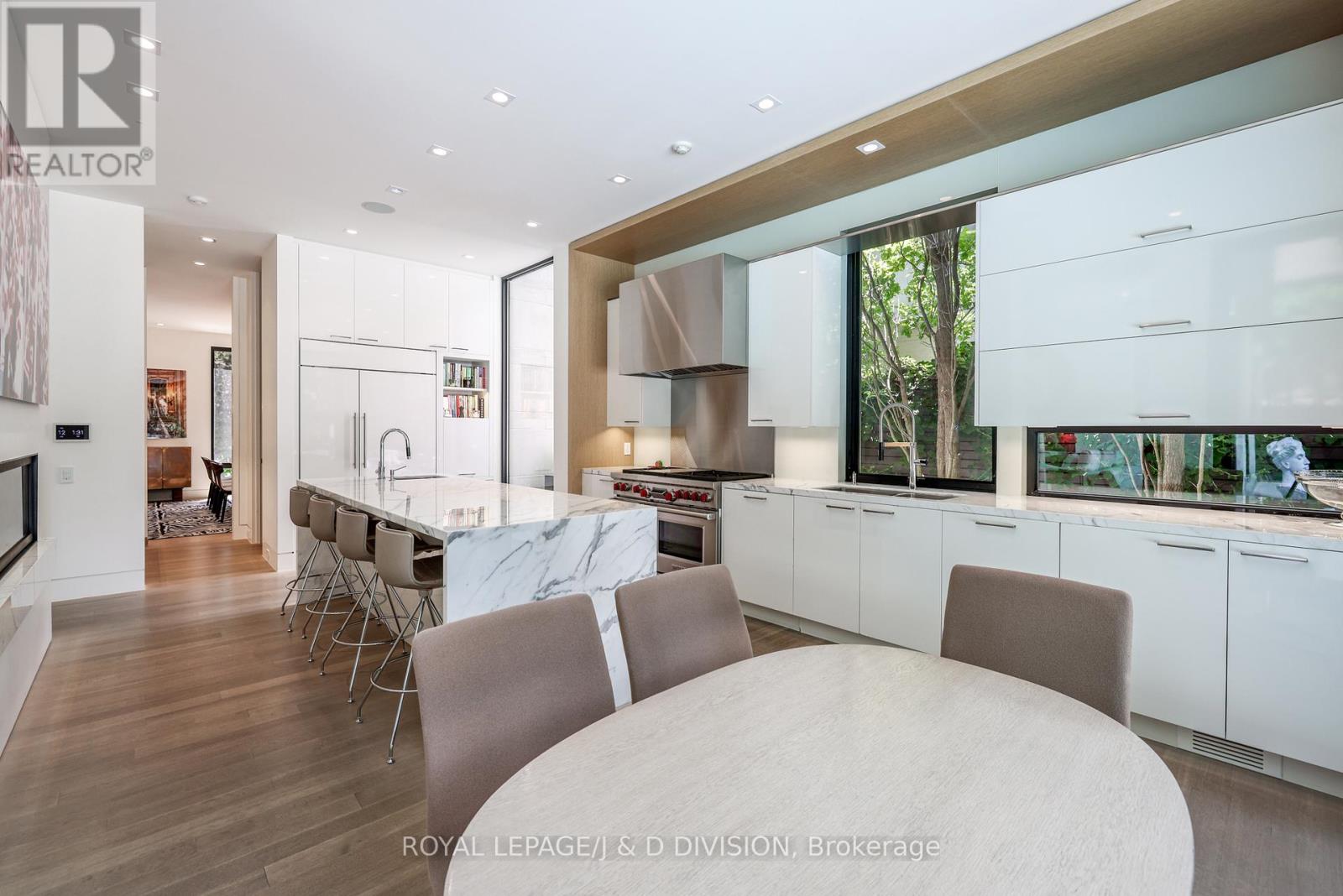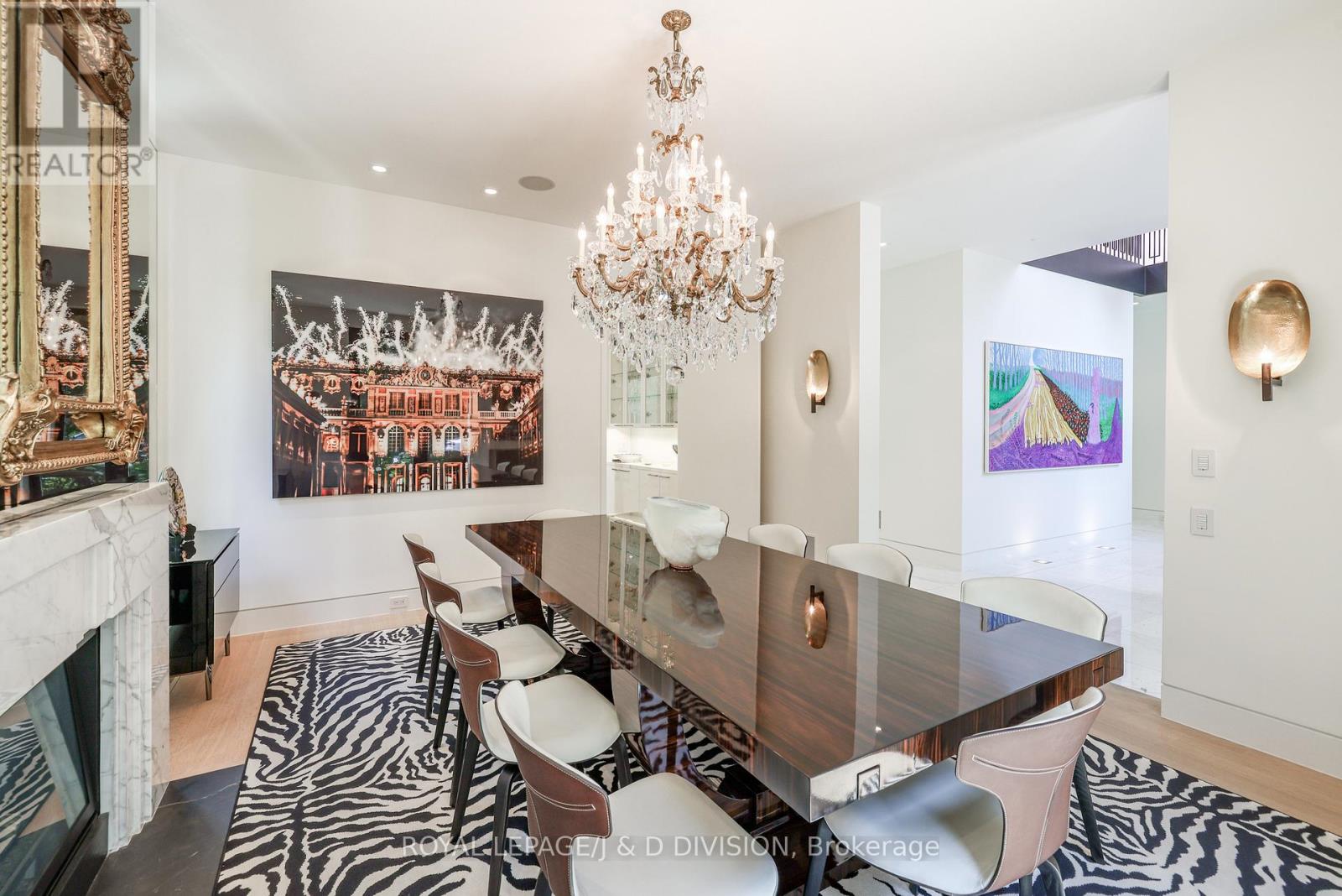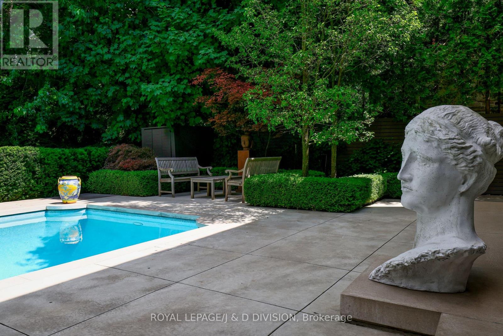 MORE THAN JUST A RESIDENCE...A WORK OF ART. Designed by Bill Mockler and Drawing Room Architect Inc. and constructed by Teddington Homes. A sophisticated contemporary design with breathtaking ravine views. The front facade is adorned with a custom carved stone statue, smooth limestone, majestic white flowering pear trees flank the front walkway to a stainless steel & glass double door entry, marble foyer, and 10 ceilings. Natural light throughout the residence with massive floor-to-ceiling windows, skylights, and a striking two-storey foyer inviting the beauty of the outdoors inside. The Great room is balanced with two fireplaces and ever changing seasonal views of the garden, formal dining room with refined details, fireplace, & opens to private patio. Chefs kitchen with seamless cabinetry, immense marble island, premium appliances, breakfast area, servery, and pantry. Family room with custom millwork, fireplace, walk out to the garden, and an exquisite powder room. Luxurious primary suite, six-piece spa bath, massive dressing room (originally planned as a 4th bedroom), two other bedrooms with ensuites, and full laundry room. Lower level with recreation room, additional bedroom/exercise rm, bathroom, second laundry rm and wine cellar. The fluid design creates spacious rooms that engage the senses at every turn with, generous wall space for the art collector, high-end finishes, negative trim detailing, luxurious marble surfaces, custom millwork, archways that stretch to the ceiling, exquisite wood elements, automated blinds that recess into walls, Control4 system for lights, speakers, and security. Spectacular 75 x 300 extremely private lot with inviting gunite pool, sundeck, sitting area and outdoor dining area - an oasis! Unparalleled opulent living for those seeking elegance, style, and ultimate privacy on one of Toronto's most coveted streets. Steps to Rosedale Golf Club, fine dining & boutique shops on Yonge St in the prestigious Teddington Park neighbourhood. (id:51158)