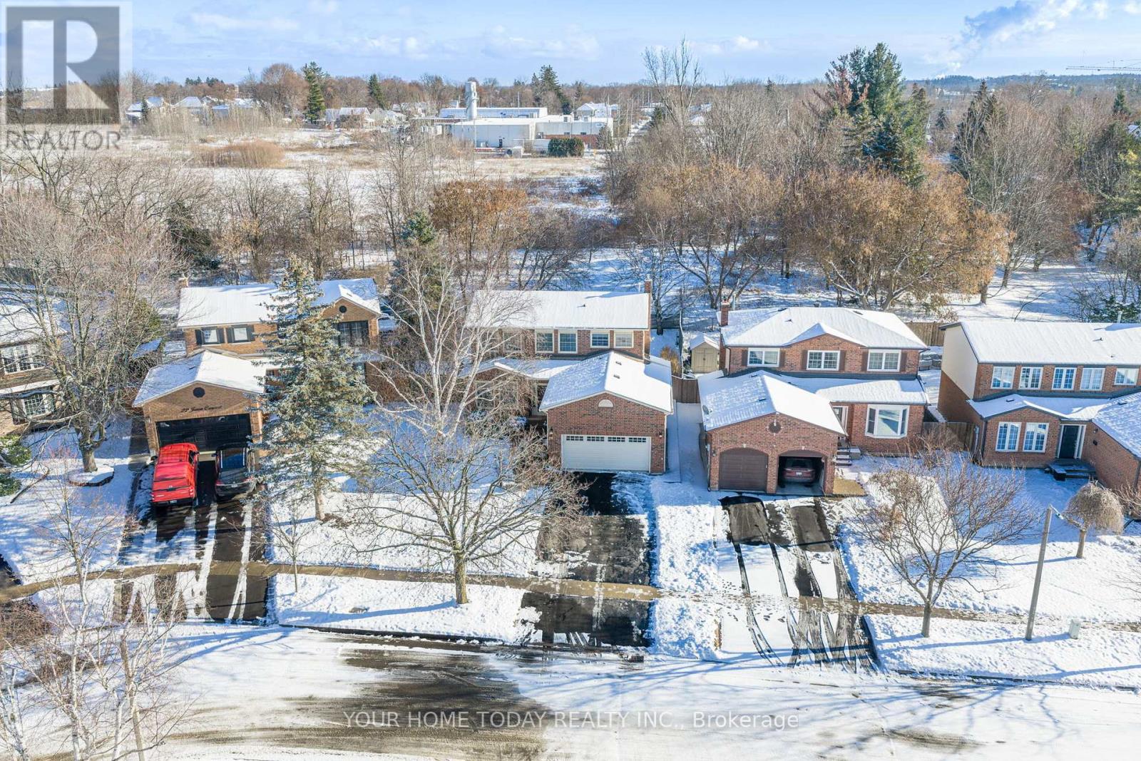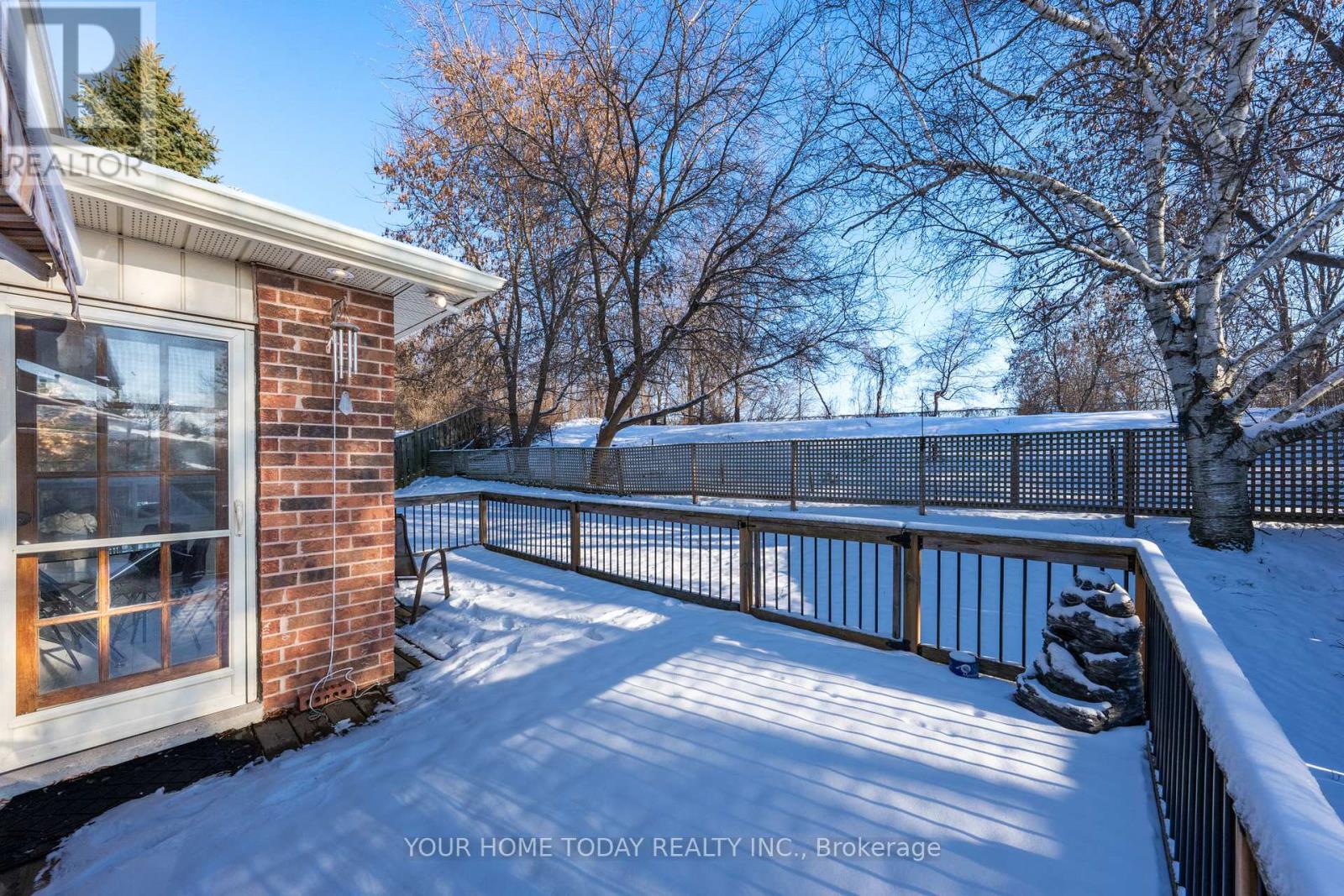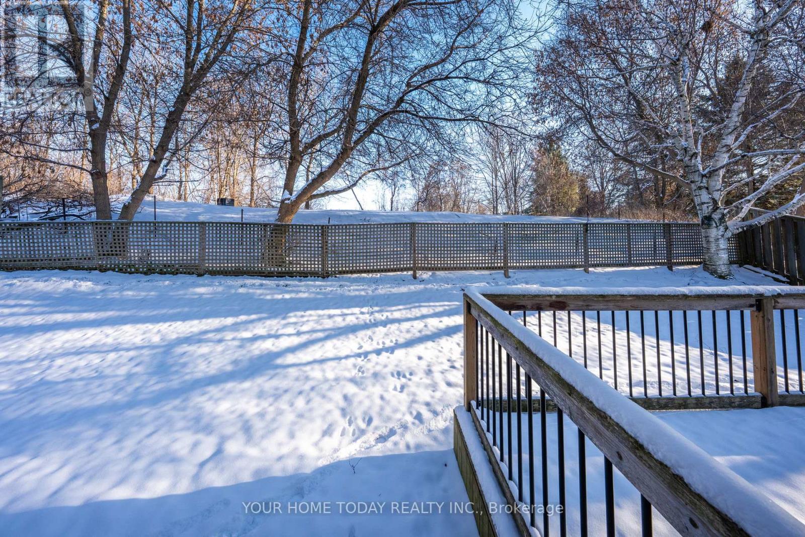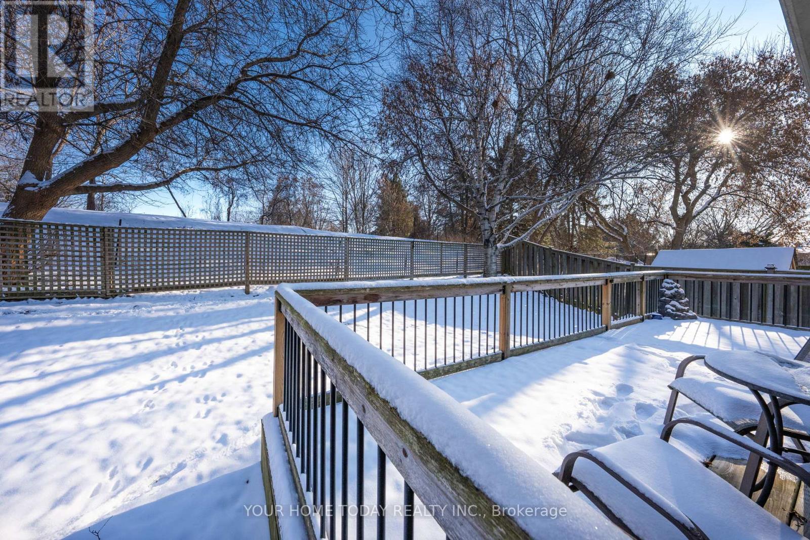 A concrete walkway and lovely landscaping welcome you to this well designed 3-bedroom, 2.5-bathroom home on a quiet, family-friendly street. Step inside the sun-filled foyer and you'll immediately feel at home in the spacious main-level rooms. The combined living and dining areas strike the perfect balance offering an inviting retreat for quiet evenings and a bright open space for laughter-filled gatherings with friends and family. The kitchen with its neutral cabinetry and generous windows overlooking the backyard is the heart of the home and is ideal for casual meals, morning coffee or keeping an eye on kids at play in the large, fenced yard. A French door walkout from the breakfast area to the deck is perfect for barbecuing. The cozy family room, complete with a fireplace and another walkout to the deck is made for movie nights or simply curling up with a good book. Everyday convenience is enhanced with main-level laundry and direct access to the garage. An eye-catching wood staircase leads to the upper level where you'll find 3 spacious bedrooms, the primary with a walk-in closet and 4-piece ensuite. The partially finished basement adds flexibility with a roomy rec room, an additional (almost finished) area and plenty of storage/utility space. Outside, a large, fully fenced pie-shaped lot with large shed, mature trees and no homes behind offers endless space for play, gardening, or peaceful moments in the fresh air. All of this in a truly wonderful location-close to schools, GO, downtown and more. (id:51158)