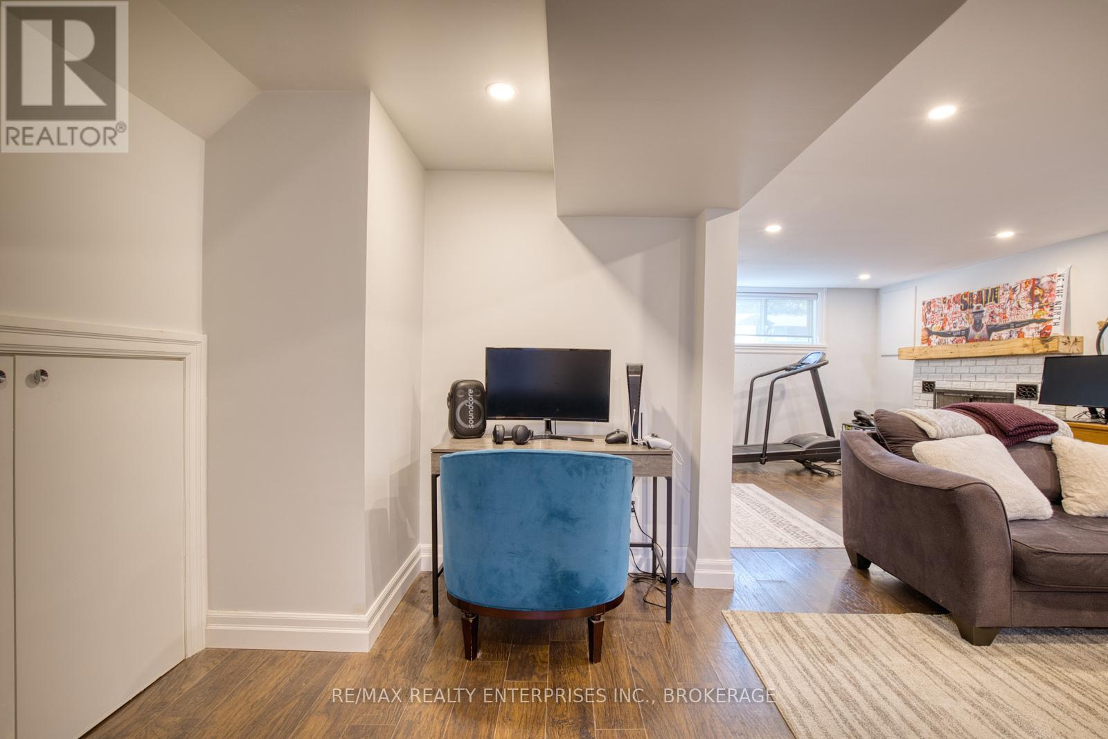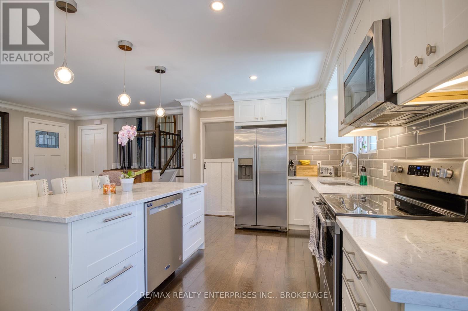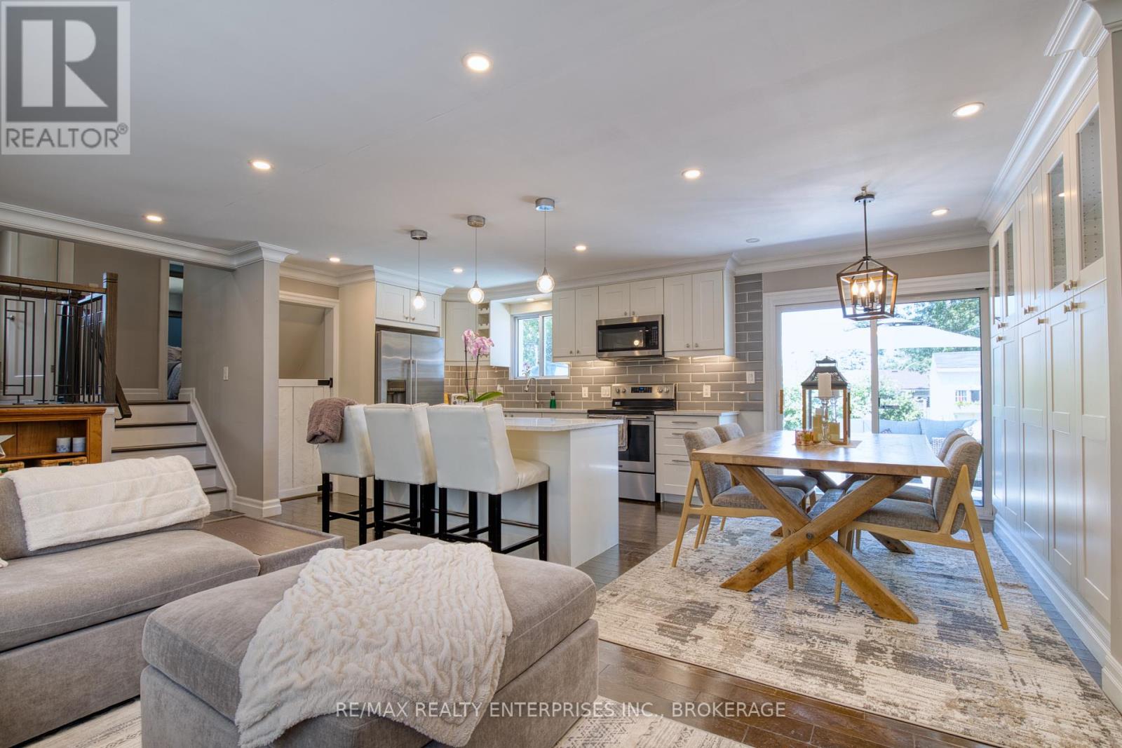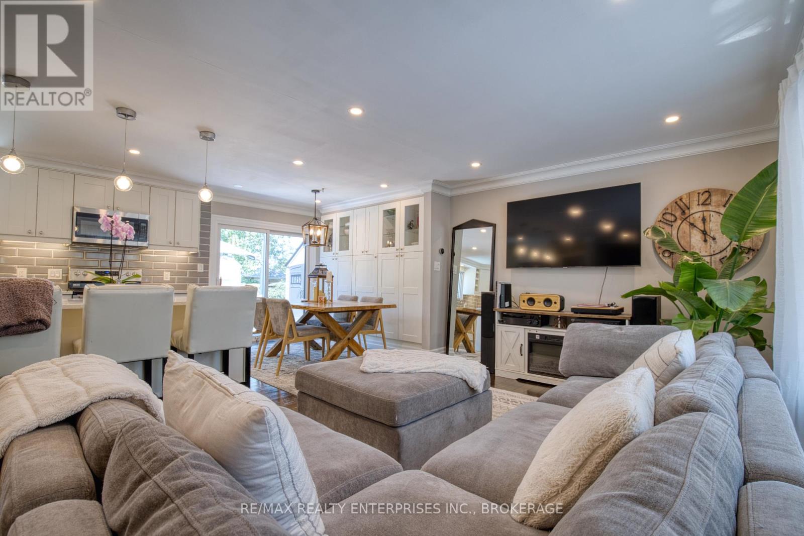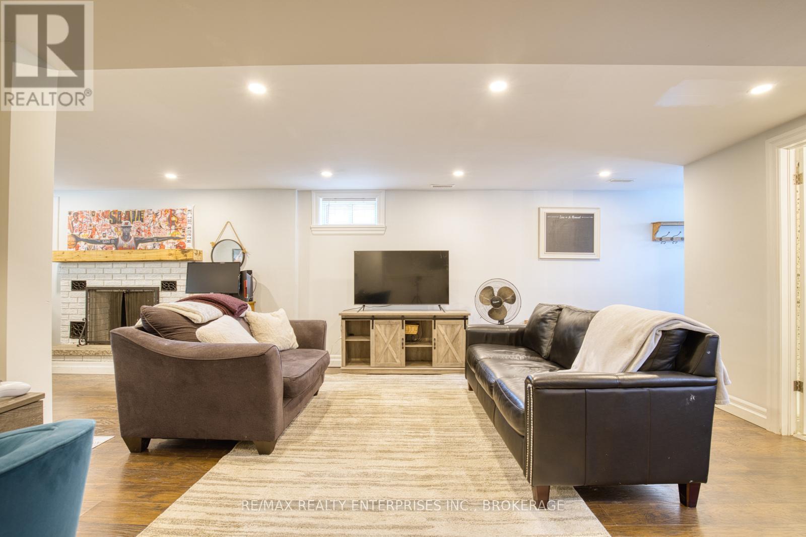 Walking distance to the Lake! This fully finished 3 bedroom, 2 bathroom, 3 level side split has been extensively updated and is move-in ready. Located on a 60 x 112 ft landscaped lot in one of the areas most desirable lakeside neighbourhoods, this home combines modern finishes with family-friendly living.The open concept main floor features a brand new eat-in kitchen with quartz countertops, a centre island with breakfast bar, and custom cabinetry. Garden doors from the dining area open to a private patio, ideal for entertaining. Rich 3/4" oak hardwood flooring flows through the main and upper levels, leading to three spacious bedrooms and a fully upgraded 4-piece bathroom.The lower level includes a cozy family room with wood-burning fireplace, an updated 3-piece bath, rec room, laundry area, and separate side entrance offering additional flexibility. A large crawl space provides ample storage. Outside, enjoy a fully fenced backyard retreat with a hot tub and above ground pool. Recent Updates: concrete driveway & patio (2024), siding, eaves & downspouts (2024), furnace & tankless water heater (2019), dishwasher (2024), hot tub & pool (2020), sand filter (2025), metal roof with transferable lifetime warranty (2005). A rare opportunity to own a turnkey property in an established lakeside community. (id:51158)
