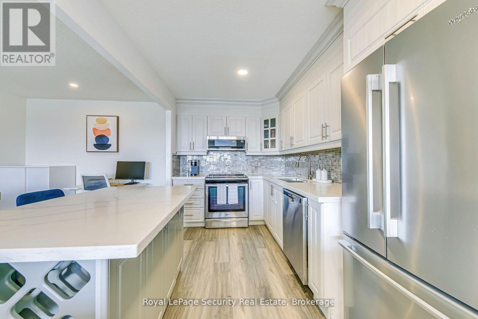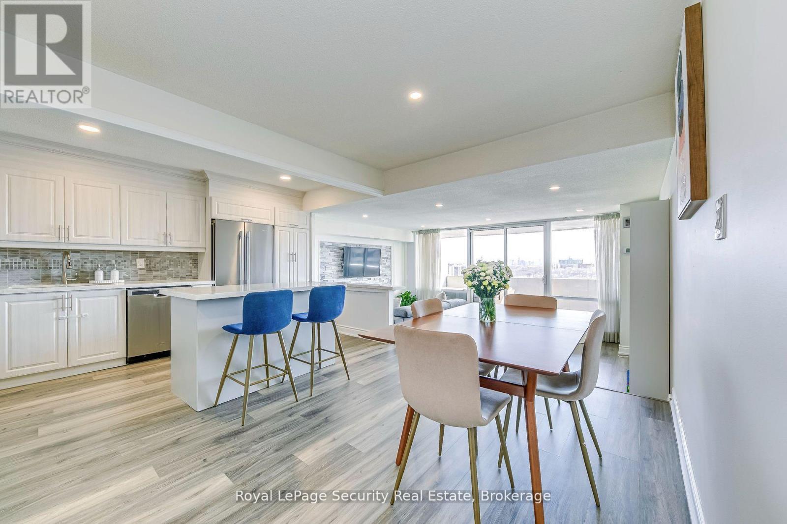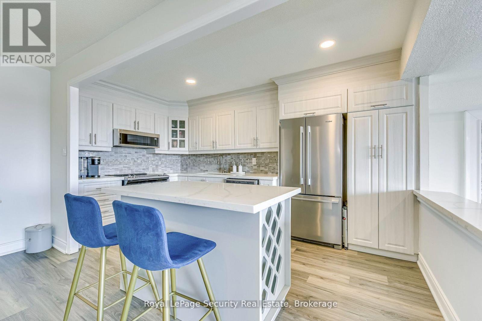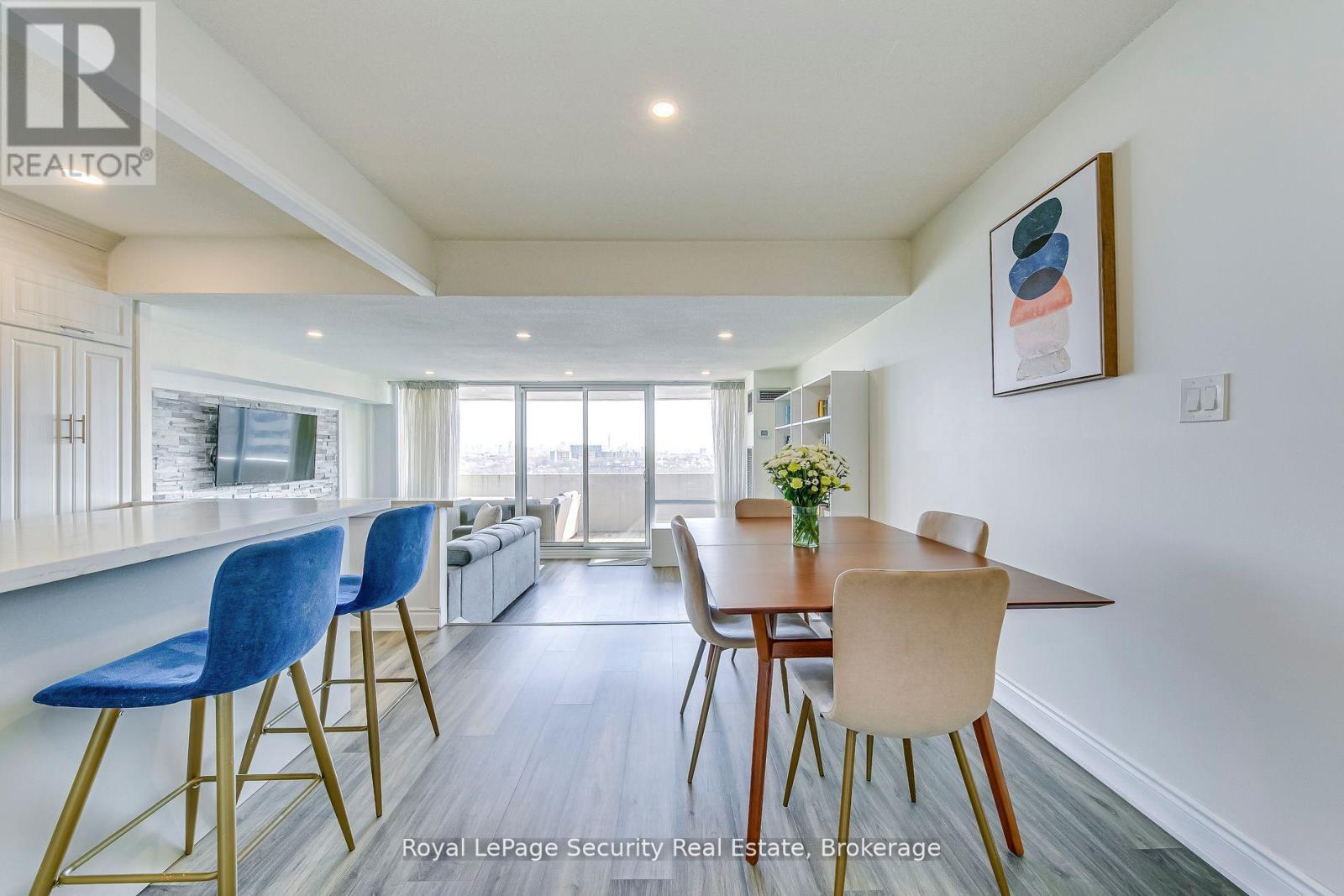 Welcome to the highly sought-after Lambton Square community! This stunning, updated top-floor unit offers a spacious and bright open-concept layout with high-end finishes throughout. 1030sqft living space + 130sqft balcony, total 1160sqft. The modern gourmet kitchen is a chefs dream, featuring ample cupboard space, undermount lighting, a central island with breakfast bar, quartz countertops, stylish backsplash, and stainless steel appliances including a fridge, stove, dishwasher, microwave rangehood. The spacious sunken living room, combined with the dining area, leads to a large balcony (5.55 x 2.23 meters) with panoramic south east city views and the CN Tower. Enjoy outdoor entertaining with an electric barbeque allowed. This lovely home boasts 2 generously sized bedrooms and 2 updated bathrooms, including a primary bedroom with a large mirrored closet and a 4-piece ensuite. The unit also features a laundry room with a new washer, new dryer, and shelving for added convenience. New flooring, baseboard and fresh professional paint were completed in November 2024. Included with the property is 1 parking space & 1 locker. The building has been elegantly renovated, with updated hallways and lobby. Residents enjoy access to excellent amenities such as an outdoor pool, party room, gym, sauna, car wash, bike storage, and nearby walking trails. Steps to TTC, the future LRT, and just a short walk to James Gardens and the trail system. Close to Lambton Golf & Country Club and Scarlett Woods Golf Course. Don't miss your chance to own this gorgeous home in a prime location! (id:51158)