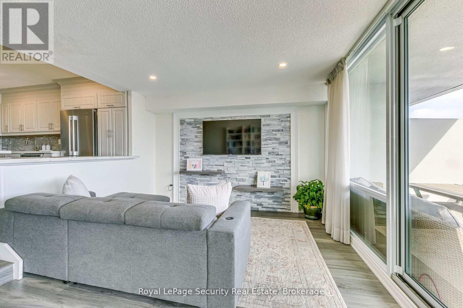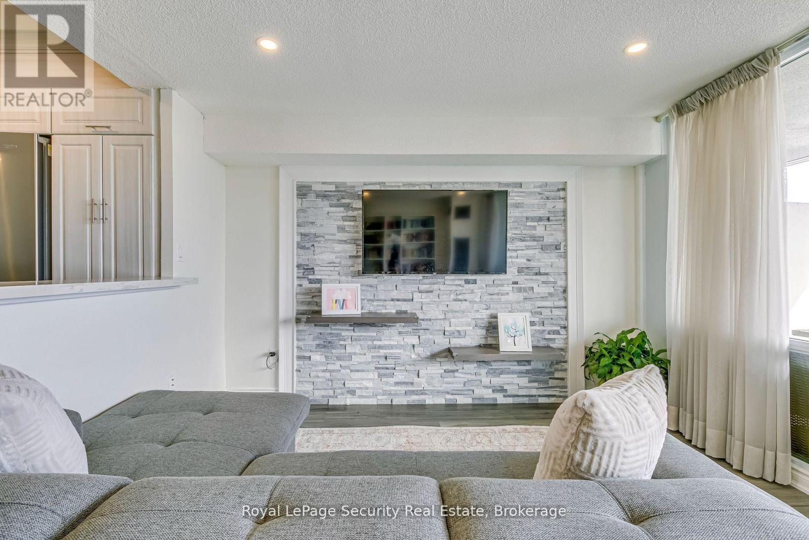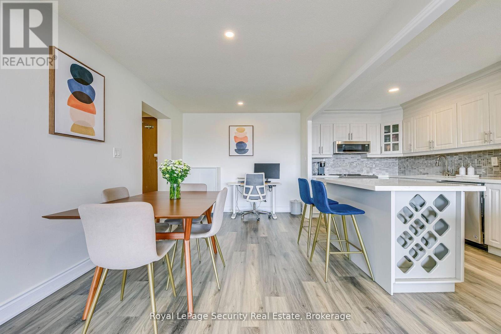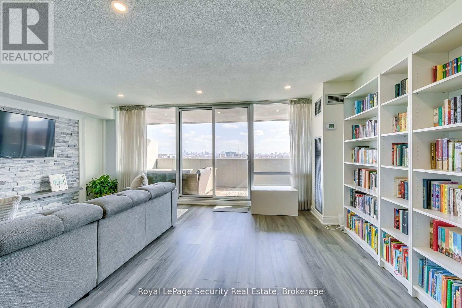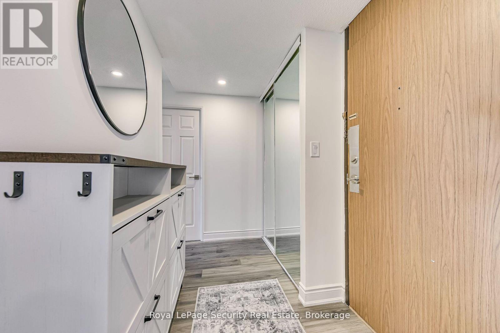 Welcome to the highly sought-after Lambton Square community! This stunning, updated top-floor unit offers a spacious and bright open-concept layout with high-end finishes throughout. 1030sqft living space + 130sqft balcony, total 1160sqft. The modern gourmet kitchen is a chefs dream, featuring ample cupboard space, undermount lighting, a central island with breakfast bar, quartz countertops, stylish backsplash, and stainless steel appliances including a fridge, stove, dishwasher, microwave rangehood. The spacious sunken living room, combined with the dining area, leads to a large balcony (5.55 x 2.23 meters) with panoramic south east city views and the CN Tower. Enjoy outdoor entertaining with an electric barbeque allowed. This lovely home boasts 2 generously sized bedrooms and 2 updated bathrooms, including a primary bedroom with a large mirrored closet and a 4-piece ensuite. The unit also features a laundry room with a new washer, new dryer, and shelving for added convenience. New flooring, baseboard and fresh professional paint were completed in November 2024. Included with the property is 1 parking space & 1 locker. The building has been elegantly renovated, with updated hallways and lobby. Residents enjoy access to excellent amenities such as an outdoor pool, party room, gym, sauna, car wash, bike storage, and nearby walking trails. Steps to TTC, the future LRT, and just a short walk to James Gardens and the trail system. Close to Lambton Golf & Country Club and Scarlett Woods Golf Course. Don't miss your chance to own this gorgeous home in a prime location! (id:51158)