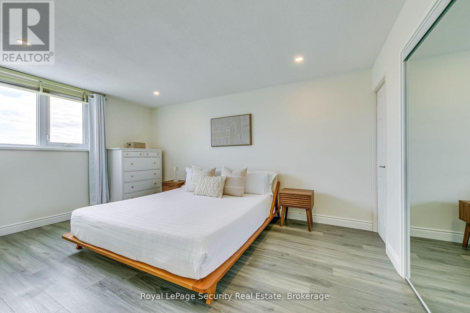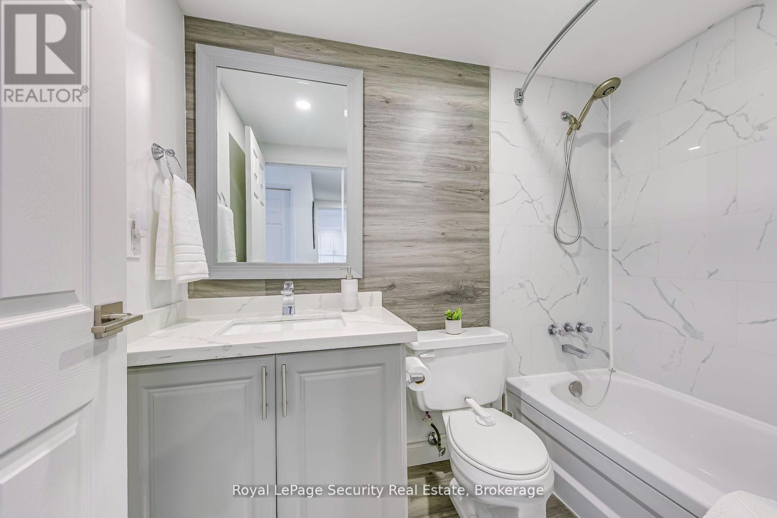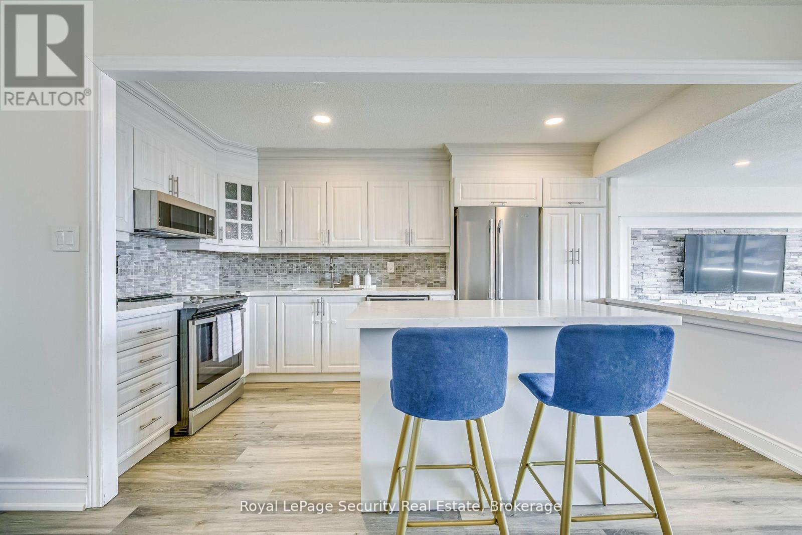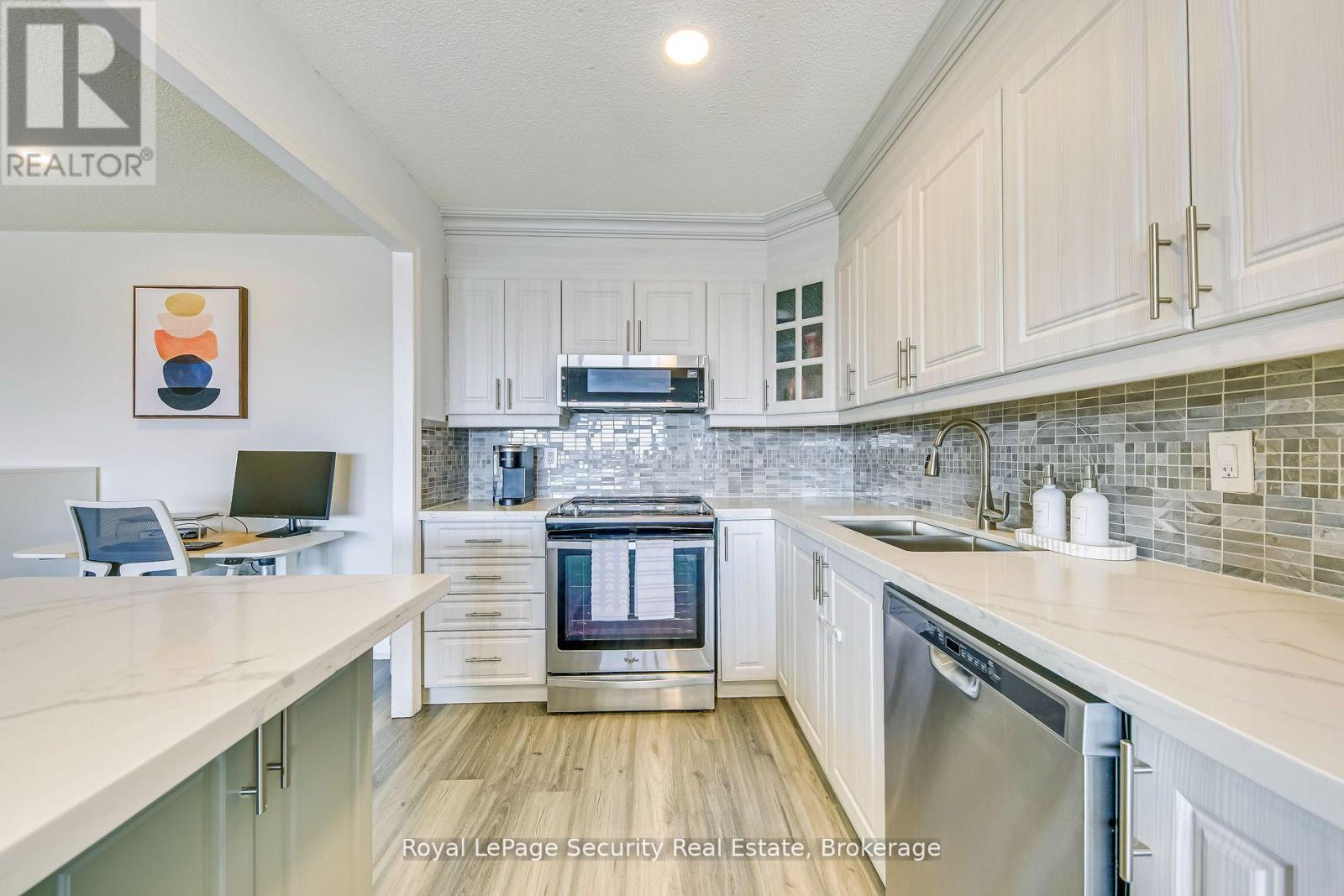 Welcome to the highly sought-after Lambton Square community! This stunning, updated top-floor unit offers a spacious and bright open-concept layout with high-end finishes throughout. 1030sqft living space + 130sqft balcony, total 1160sqft. The modern gourmet kitchen is a chefs dream, featuring ample cupboard space, undermount lighting, a central island with breakfast bar, quartz countertops, stylish backsplash, and stainless steel appliances including a fridge, stove, dishwasher, microwave rangehood. The spacious sunken living room, combined with the dining area, leads to a large balcony (5.55 x 2.23 meters) with panoramic south east city views and the CN Tower. Enjoy outdoor entertaining with an electric barbeque allowed. This lovely home boasts 2 generously sized bedrooms and 2 updated bathrooms, including a primary bedroom with a large mirrored closet and a 4-piece ensuite. The unit also features a laundry room with a new washer, new dryer, and shelving for added convenience. New flooring, baseboard and fresh professional paint were completed in November 2024. Included with the property is 1 parking space & 1 locker. The building has been elegantly renovated, with updated hallways and lobby. Residents enjoy access to excellent amenities such as an outdoor pool, party room, gym, sauna, car wash, bike storage, and nearby walking trails. Steps to TTC, the future LRT, and just a short walk to James Gardens and the trail system. Close to Lambton Golf & Country Club and Scarlett Woods Golf Course. Don't miss your chance to own this gorgeous home in a prime location! (id:51158)