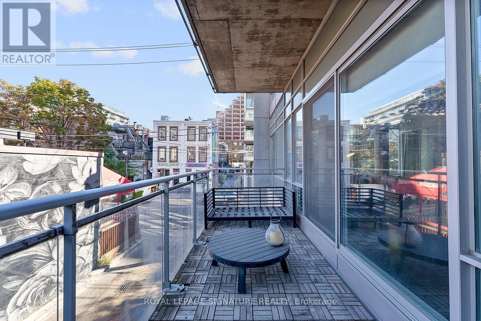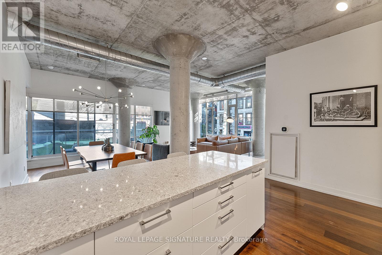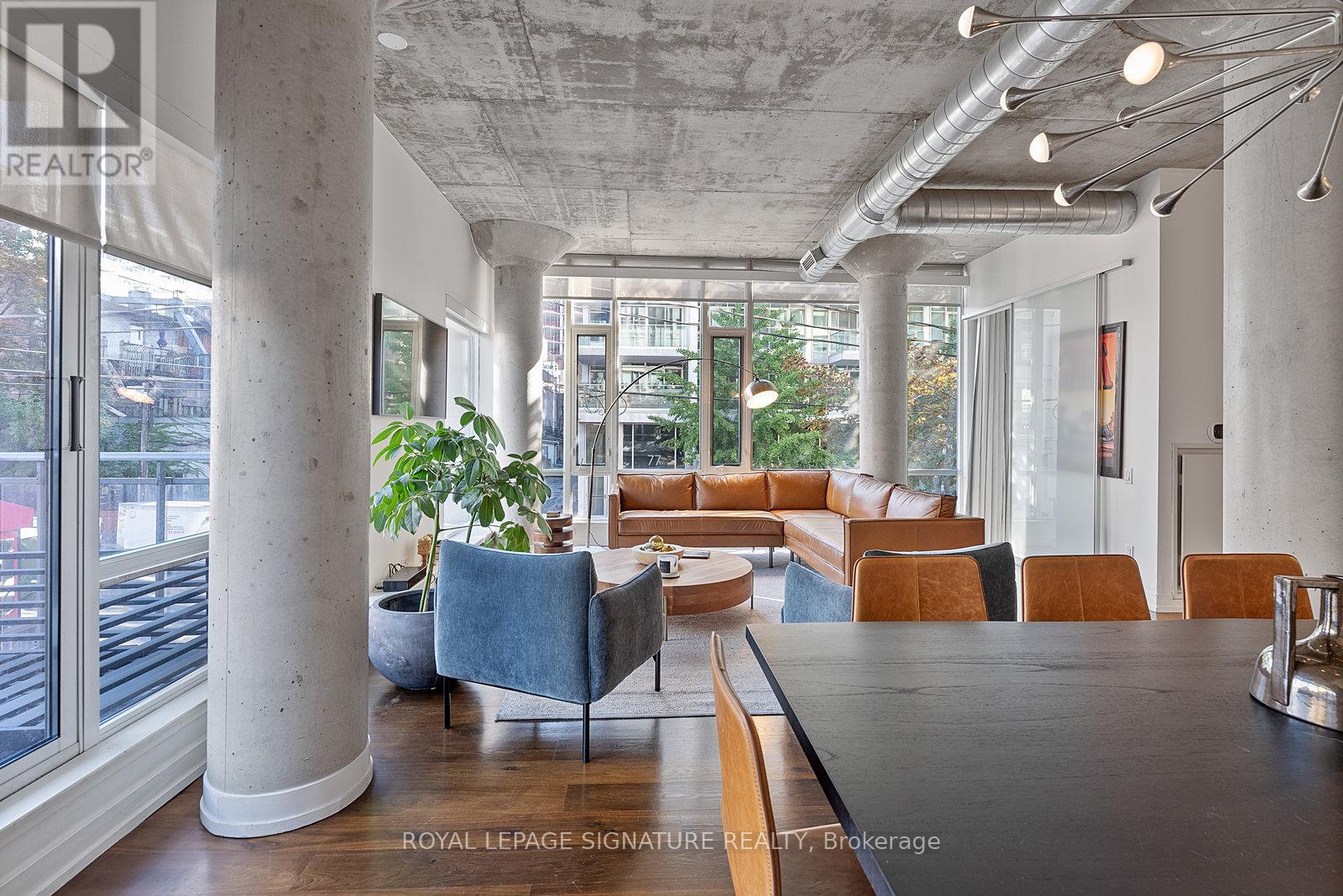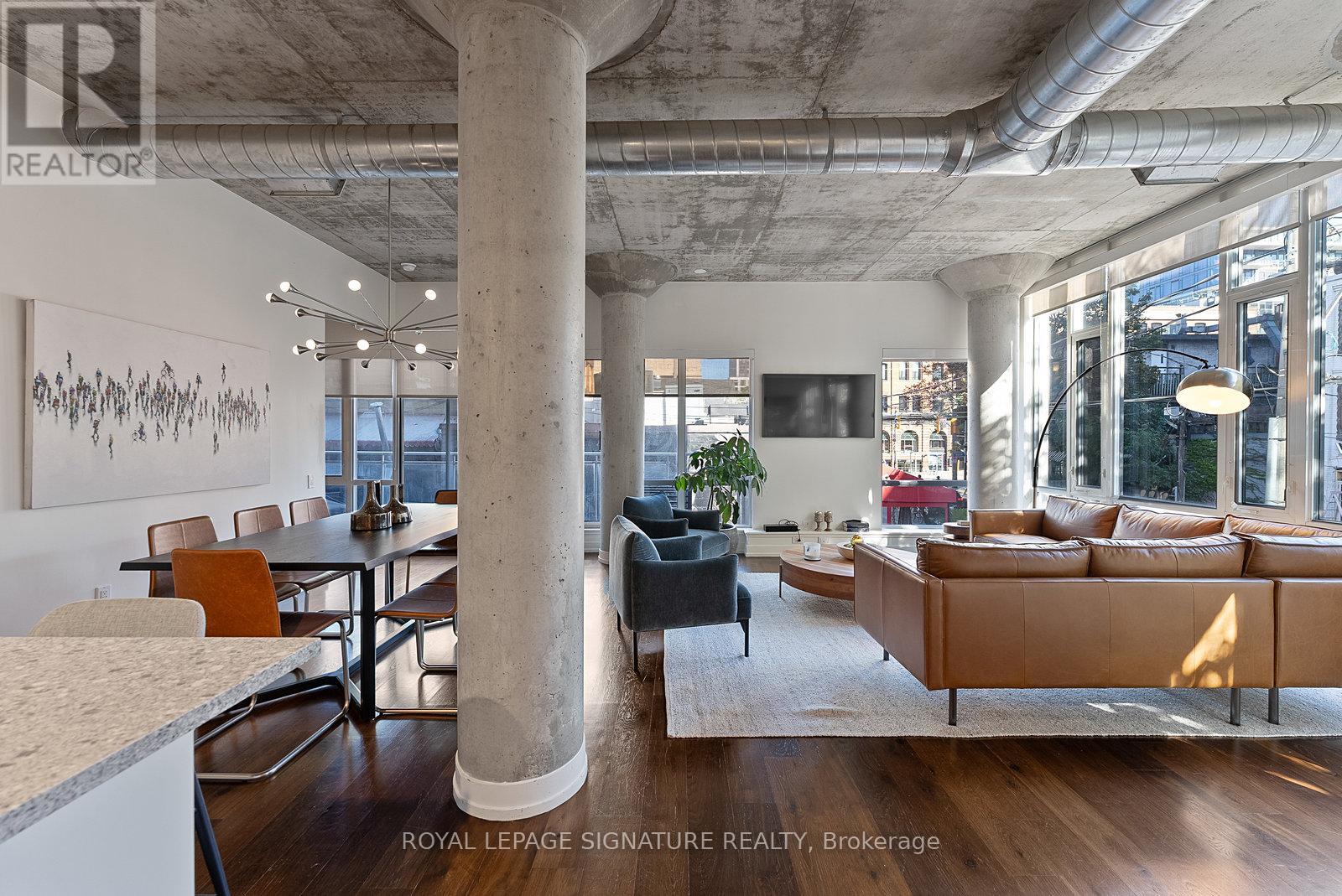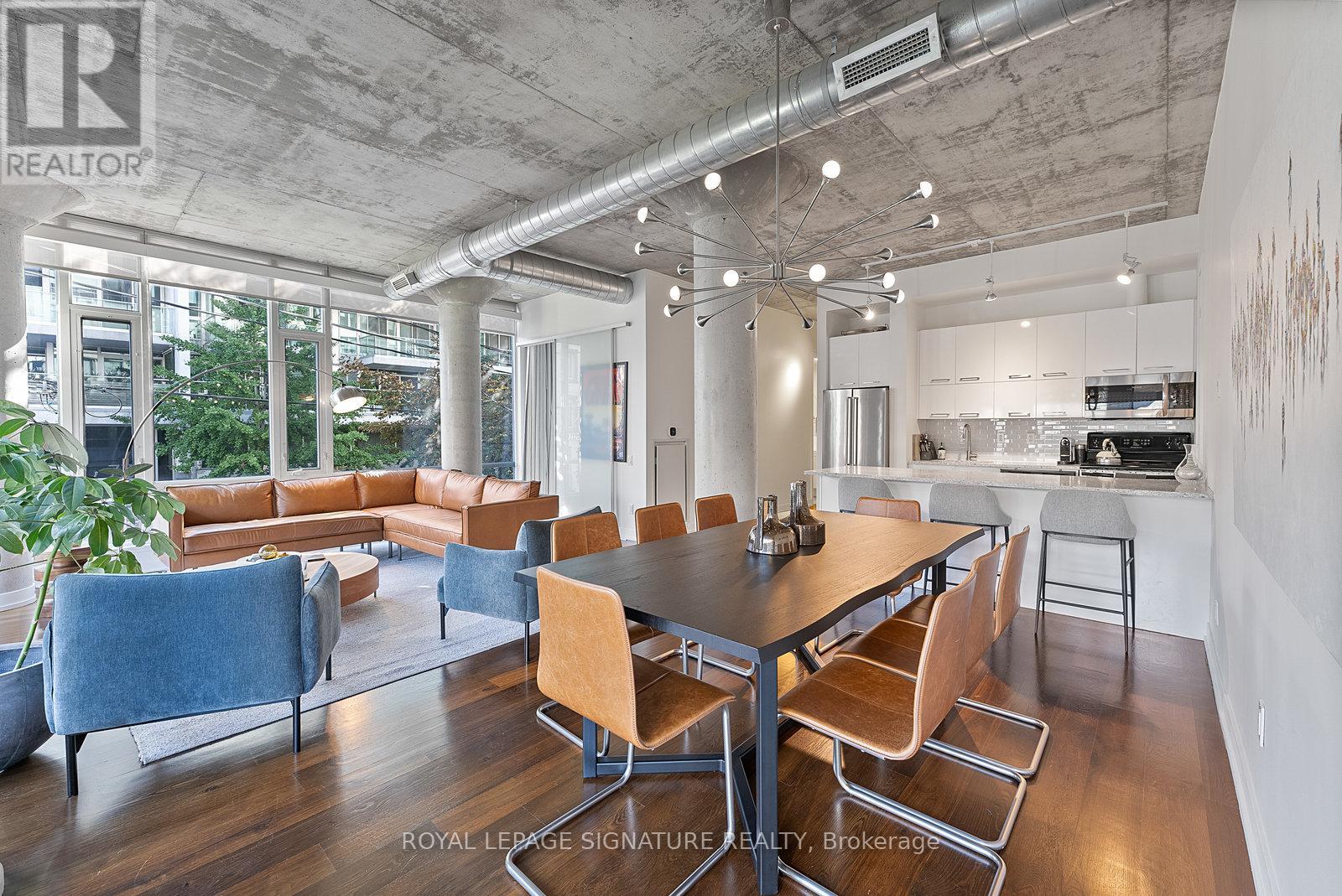 $890.81 MonthlyWelcome to Suite 201 at 66 Portland. This bright and spacious, corner suite offers a smart open-concept layout with floor-to-ceiling windows and abundant natural light throughout.The modern kitchen features full-sized stainless steel appliances, sleek cabinetry, and a large island with seating. It opens seamlessly to the expansive living area, where modern flooring and high ceilings create an airy, loft-inspired feel. The dining space comfortably accommodates a full table, making it ideal for both everyday living and entertaining. The primary bedroom includes a large closet and a private ensuite with contemporary finishes. The second bedroom includes a large window and closet, perfect for an office space or nursery. Another full bathroom adds convenience for guests or family. With its rare corner positioning, this suite enjoys light from two exposures and a highly functional floor plan with no wasted space. Located in the heart of King West, 66 Portland is a boutique building surrounded by Torontos best dining, cafes, and nightlife, with easy access to transit and the Financial District. (id:51158)