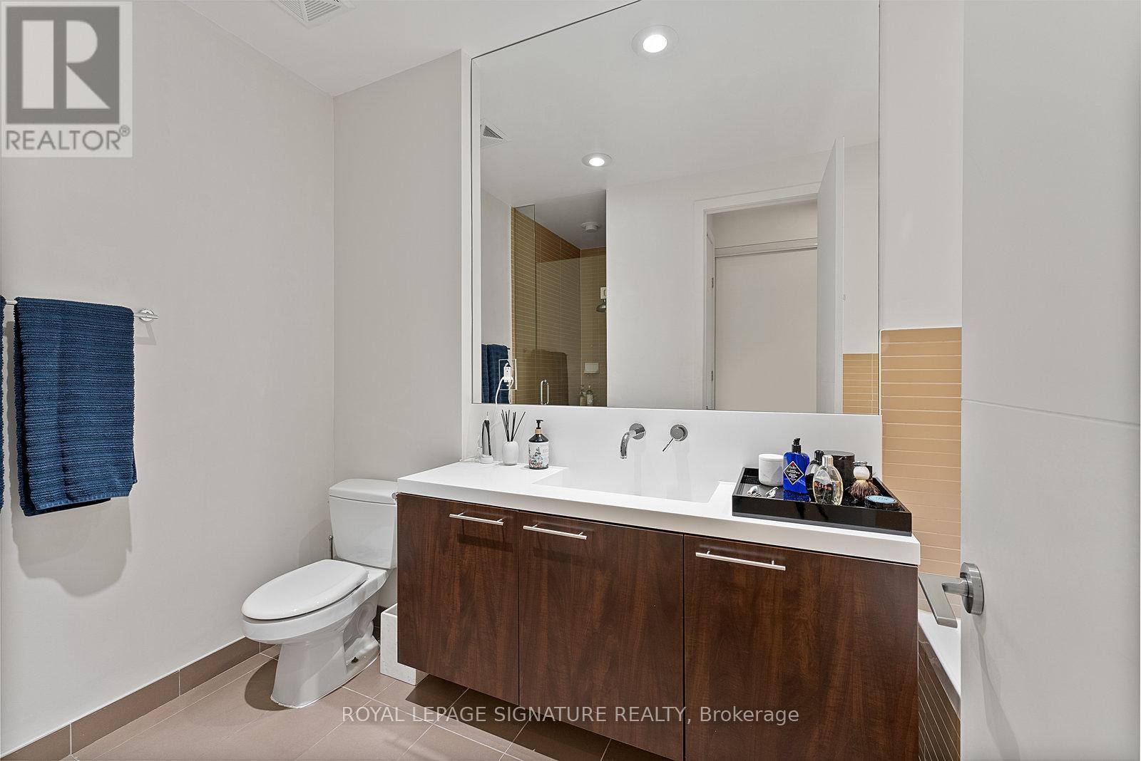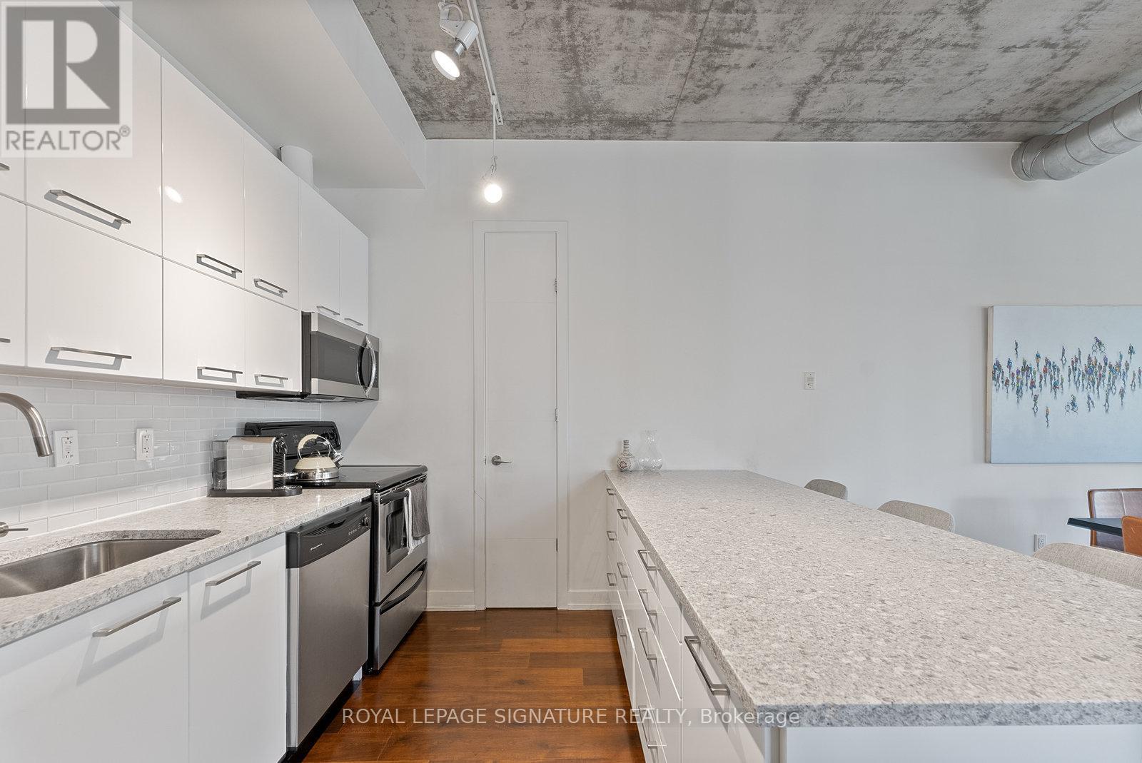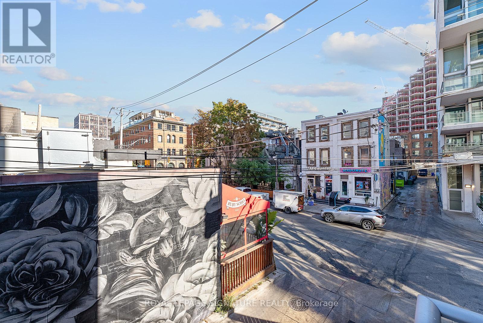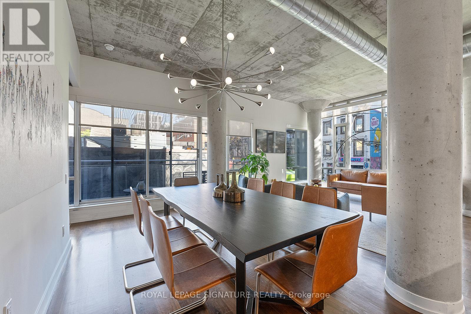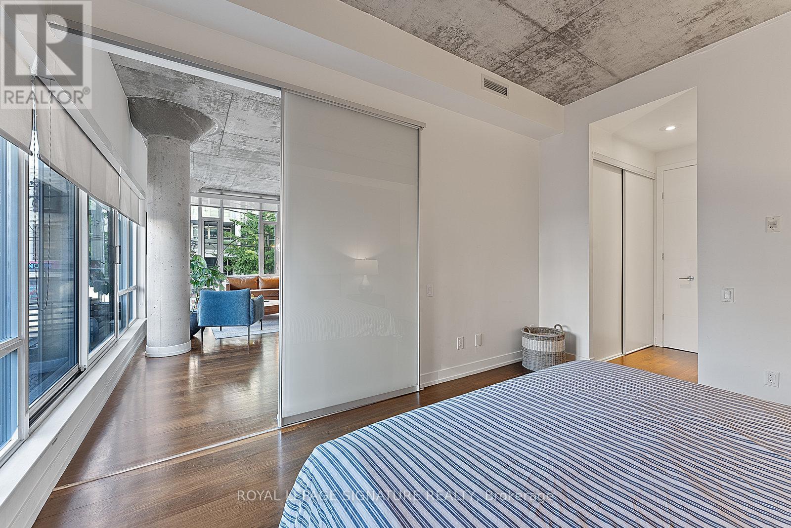 $890.81 MonthlyWelcome to Suite 201 at 66 Portland. This bright and spacious, corner suite offers a smart open-concept layout with floor-to-ceiling windows and abundant natural light throughout.The modern kitchen features full-sized stainless steel appliances, sleek cabinetry, and a large island with seating. It opens seamlessly to the expansive living area, where modern flooring and high ceilings create an airy, loft-inspired feel. The dining space comfortably accommodates a full table, making it ideal for both everyday living and entertaining. The primary bedroom includes a large closet and a private ensuite with contemporary finishes. The second bedroom includes a large window and closet, perfect for an office space or nursery. Another full bathroom adds convenience for guests or family. With its rare corner positioning, this suite enjoys light from two exposures and a highly functional floor plan with no wasted space. Located in the heart of King West, 66 Portland is a boutique building surrounded by Torontos best dining, cafes, and nightlife, with easy access to transit and the Financial District. (id:51158)