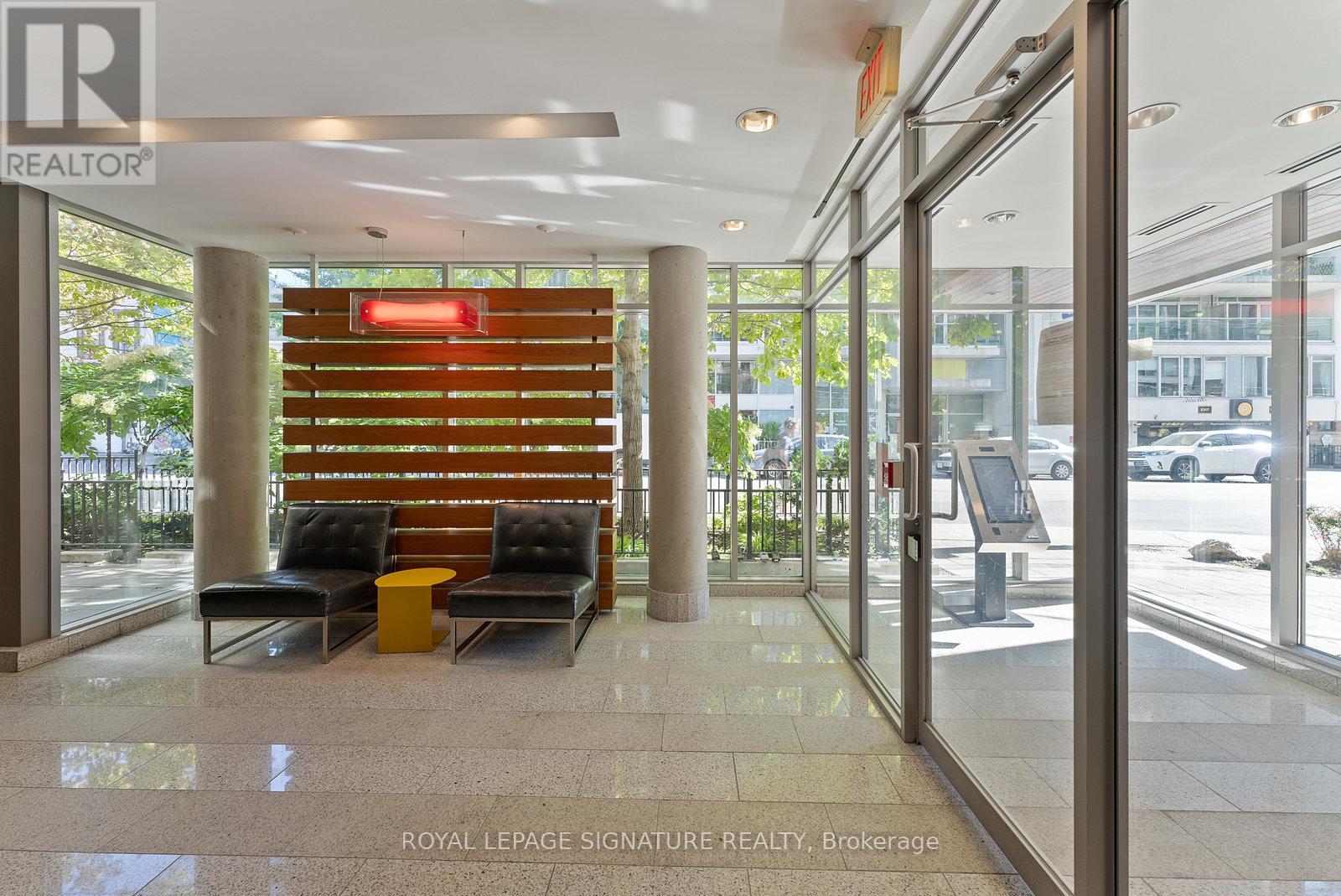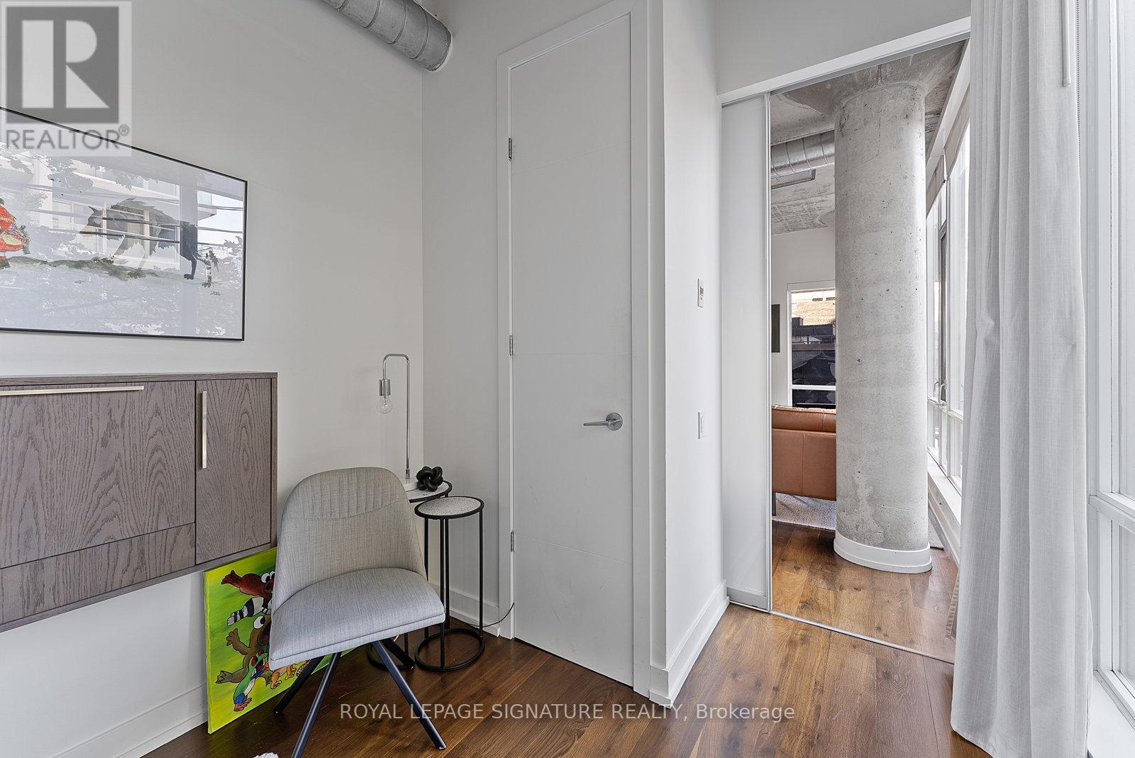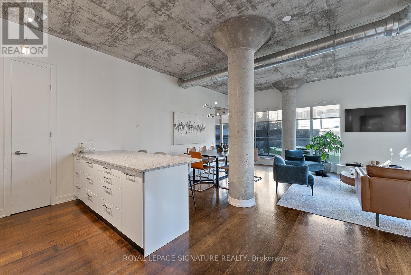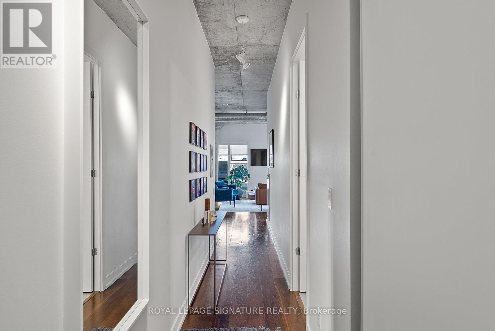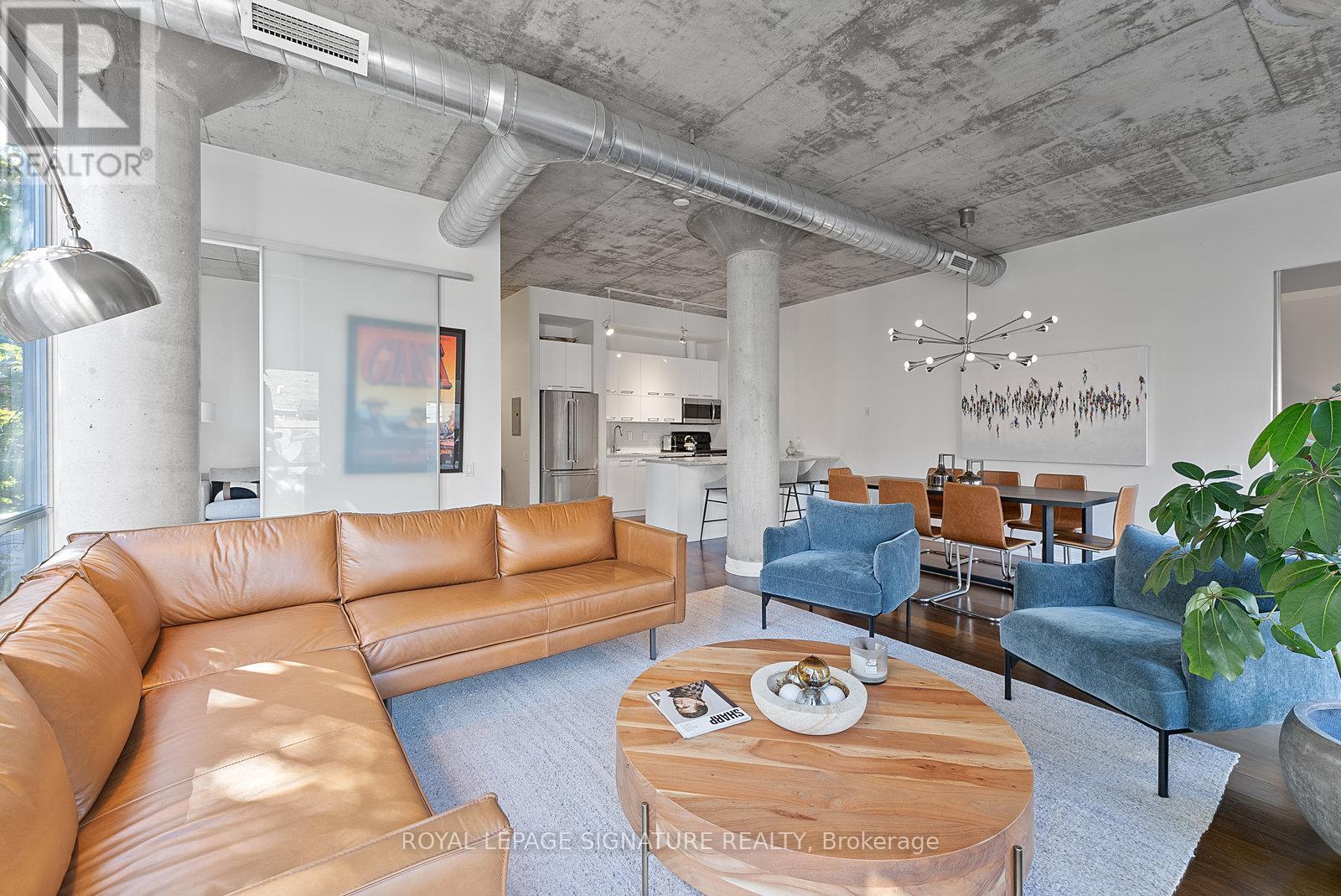 $890.81 MonthlyWelcome to Suite 201 at 66 Portland. This bright and spacious, corner suite offers a smart open-concept layout with floor-to-ceiling windows and abundant natural light throughout.The modern kitchen features full-sized stainless steel appliances, sleek cabinetry, and a large island with seating. It opens seamlessly to the expansive living area, where modern flooring and high ceilings create an airy, loft-inspired feel. The dining space comfortably accommodates a full table, making it ideal for both everyday living and entertaining. The primary bedroom includes a large closet and a private ensuite with contemporary finishes. The second bedroom includes a large window and closet, perfect for an office space or nursery. Another full bathroom adds convenience for guests or family. With its rare corner positioning, this suite enjoys light from two exposures and a highly functional floor plan with no wasted space. Located in the heart of King West, 66 Portland is a boutique building surrounded by Torontos best dining, cafes, and nightlife, with easy access to transit and the Financial District. (id:51158)