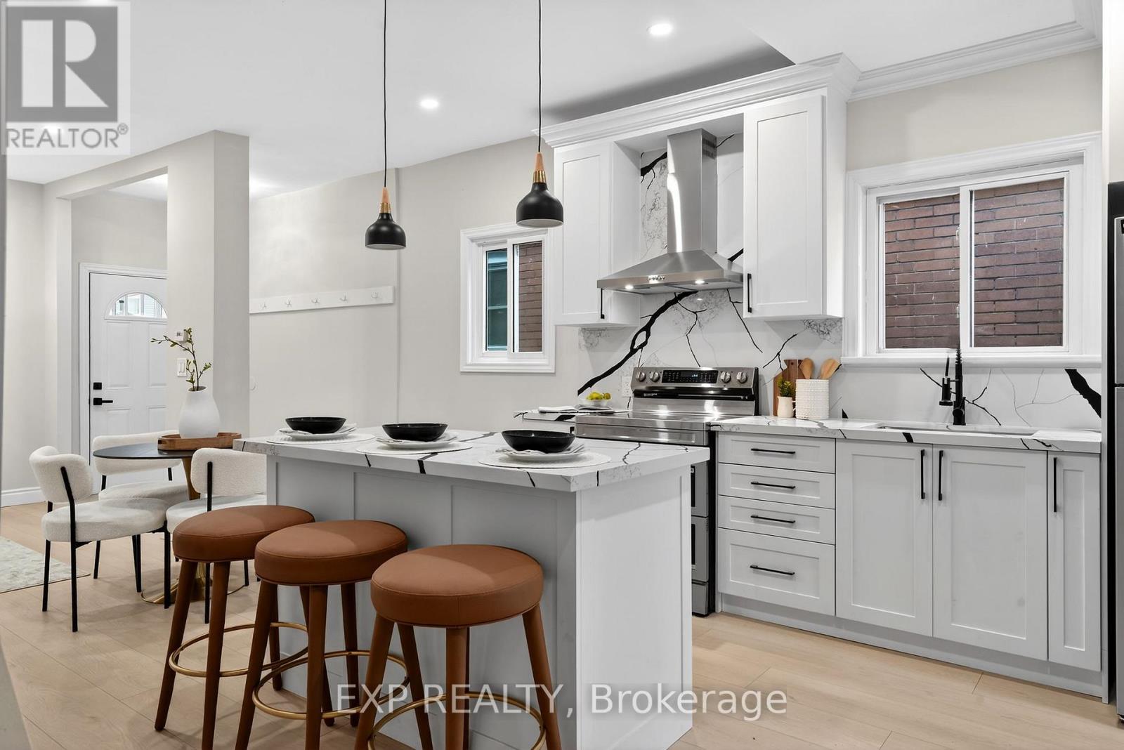Welcome to 201 Grosvenor Avenue, where modern design meets community charm in one of Hamilton's coolest neighbourhoods-Crown Point. This beautifully updated 2+1 bedroom, 2 bathroom home is the perfect blend of style, comfort, and functionality, ready to create years of great memories.Step inside and you're immediately greeted by soaring ceilings and a bright, cozy living space featuring a statement feature wall and electric fireplace, all anchored by an oversized window that looks out onto your private deck-ideal for both relaxing evenings and lively gatherings.The open-concept designer kitchen flows seamlessly from the living area, making it perfect for entertaining and everyday family life. Finished with stainless steel appliances, modern cabinetry, and plenty of prep space, this kitchen truly sits at the heart of the home. The main level also offers a versatile bedroom-ideal as a home office or guest room-along with oversized laminate flooring and a full bathroom complete with a glass-enclosed standing shower.Upstairs, retreat to your private primary suite, featuring an oversized bedroom, a custom built-in his-and-hers closet, and a spa-inspired ensuite with a four-piece bath, standing shower, tub, and a window overlooking the backyard.Outside, the home continues to impress with an oversized poured concrete patio and a generous backyard designed for entertaining. Enjoy the built-in bar setup, TV inserts, and a shed for extra storage-perfect for hosting friends, family, and game nights.Additional highlights include two parking spaces and a prime location just minutes from Ottawa Street, known for its vibrant shops, cafés, and community atmosphere.This is modern Crown Point living at its best-move in, unpack, and enjoy. (id:51158)