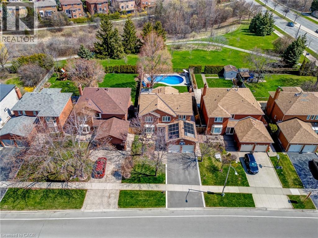 Lot! Layout! Location! Just steps away from the prestigious Joshua Creek area, this beautifully upgraded 5-bedroom, 4-bathroom home offers approximately 3800 sqft of finished living space, perfect for modern family living. The main level features hardwood and tile flooring, a custom kitchen with quartz countertops and breakfast area, formal living/dining rooms, a cozy gas fireplace in the family room, and main-floor laundry. Upstairs, the primary suite impresses with a den, a spacious 5-piece ensuite , and a walk-in closet, while three additional bedrooms share a stylish 3-piece bath. The fully finished basement includes a rec room, gas fireplace, 5th bedroom, 3-piece bath, workshop, and ample storage. Outdoors, enjoy a private ravine lot oasis with an in-ground solar-heated pool (liner 2021), 8-person Jacuzzi under a curtained gazebo, fire pit, mature landscaping, and multiple patterned concrete patios. Highlights include an insulated garage with premium LED lighting, paved driveway, ADT security system, and newer windows throughout. Fantastic location steps to the top-rated Iroquois Ridge High School & Iroquois Ridge Community Centre as well as parks, tennis/pickleball courts, and transit. This turnkey home blends comfort, function, and style in one of Oakville's most sought-after neighbourhoods. (id:51158)