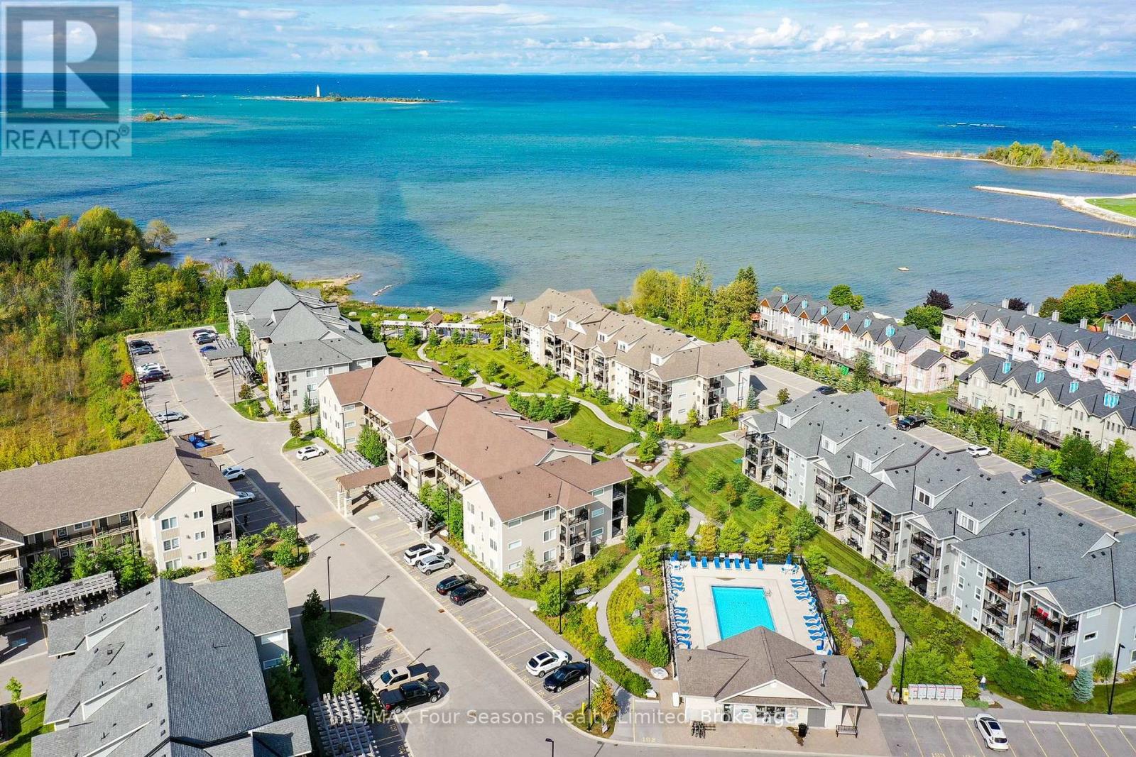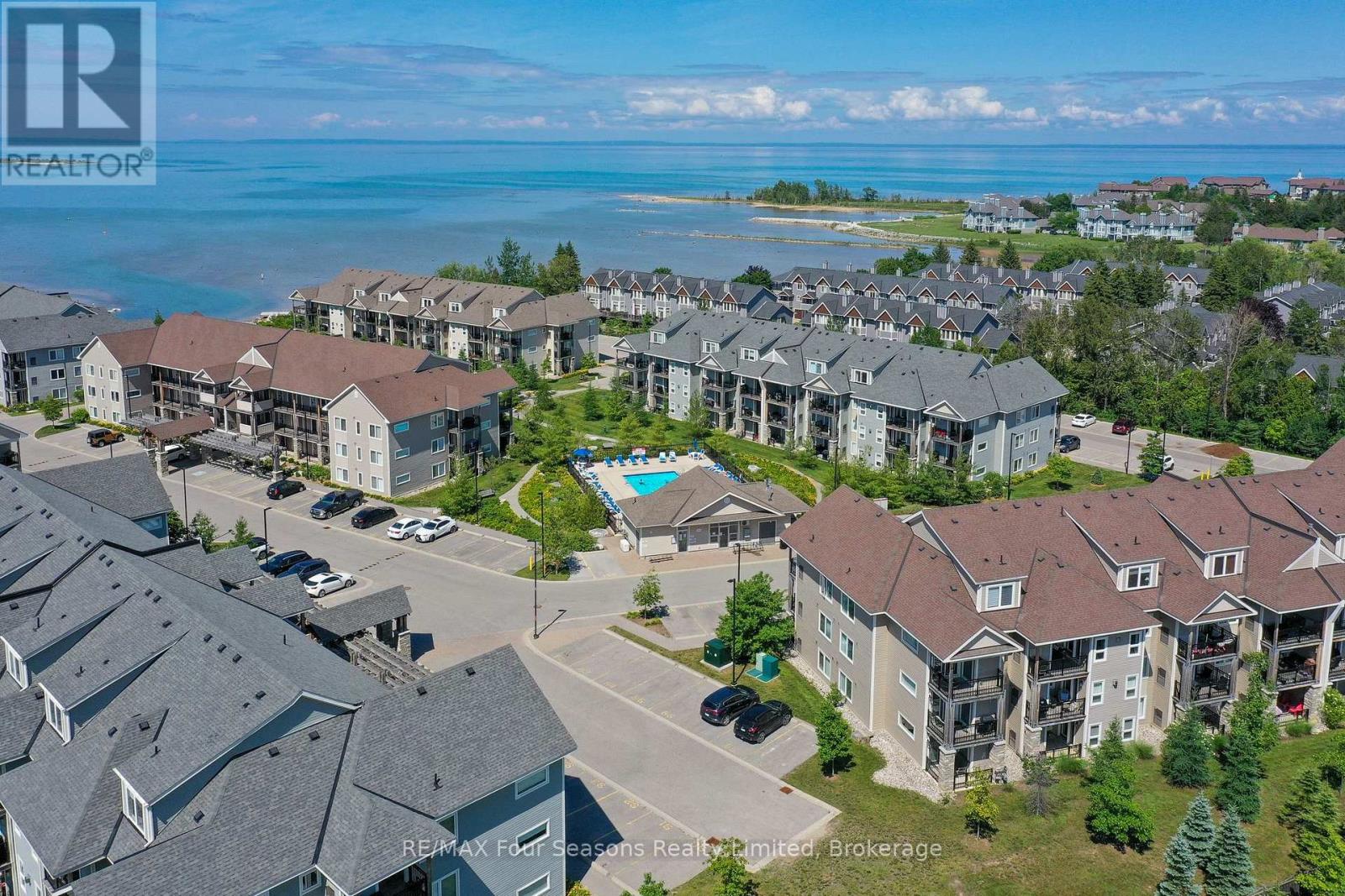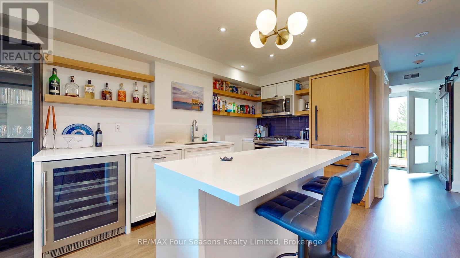 A Truly Unique Wyldewood Cove Osler Unit! This exceptional, one-of-a-kind residence was fully redesigned and retrofitted by renowned Toronto designer and gallery owner, Alison Milne. With panoramic views of the Niagara Escarpment from the front of this second floor unit and stunning seasonal Georgian Bay vistas from the back balcony, this home features over $250,000 in upgrades, custom improvements, and meticulous attention to detail. The space is move-in ready, offering a seamless living experience. Inside, you'll find pot lights throughout, each controlled by Lutron Maestro dimmers, and complemented by elegant Elte fixtures in every room. The chef's kitchen is a dream, complete with a new wine fridge (2025), GE Elite gas stove, new microwave/rangehood (2025), deep pocket pot drawers, and a fully integrated fridge and dishwasher. The luxurious master suite is a serene retreat, featuring a custom barn board headboard, a king-sized bed, under-bed storage, and a built-in wall closet. The ensuite bath boasts heated floors for ultimate comfort. After a day of outdoor adventure, unwind in the spacious open concept great room featuring living room and dining area/kitchen, complete with custom concrete gas fireplace. Step outside to the private balcony and soak in the breathtaking seasonal Georgian Bay views. This impeccably maintained condo offers the perfect balance of luxury and convenience, with active lifestyle amenities, including a gym, change rooms, and a year-round heated outdoor pool for winter enjoyment. Wyldewood Cove is an exclusive waterfront community and also features kayak/paddleboard area by the beach area and dock featuring a small channel to the Bay and serene views of the historic Nottawasaga Lighthouse. This executive condo truly embodies the best of four-season living! (id:51158)