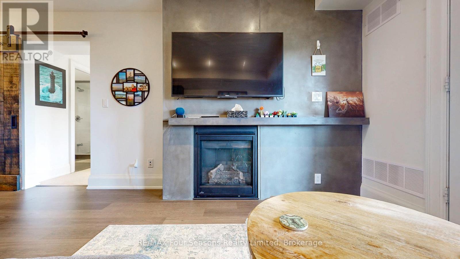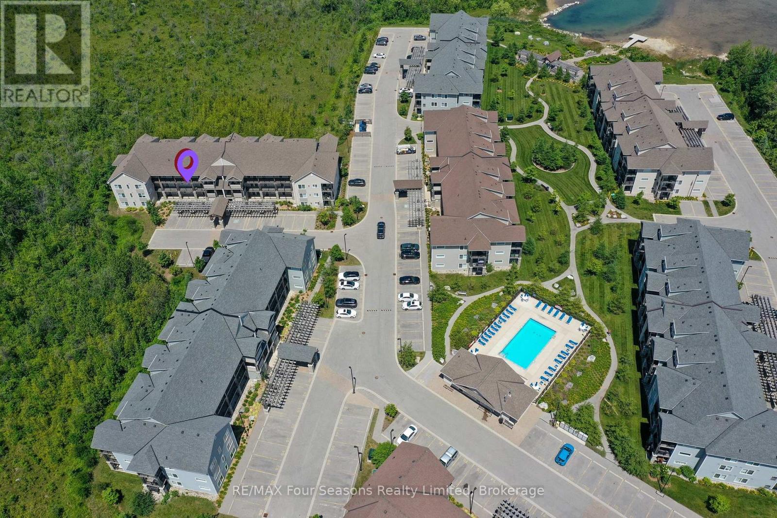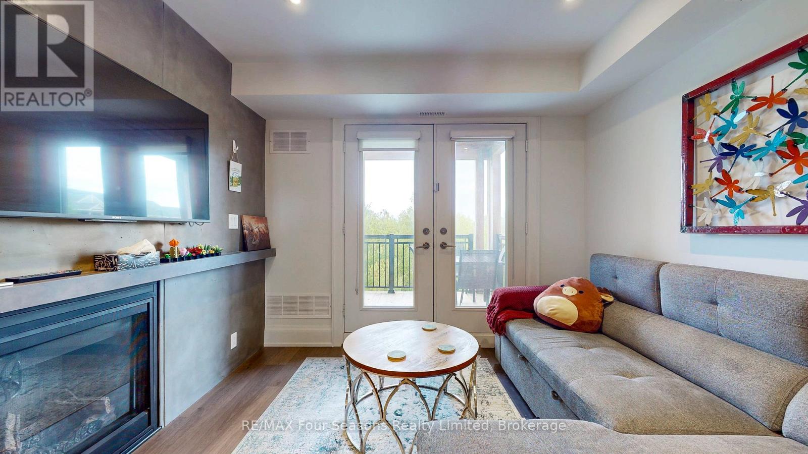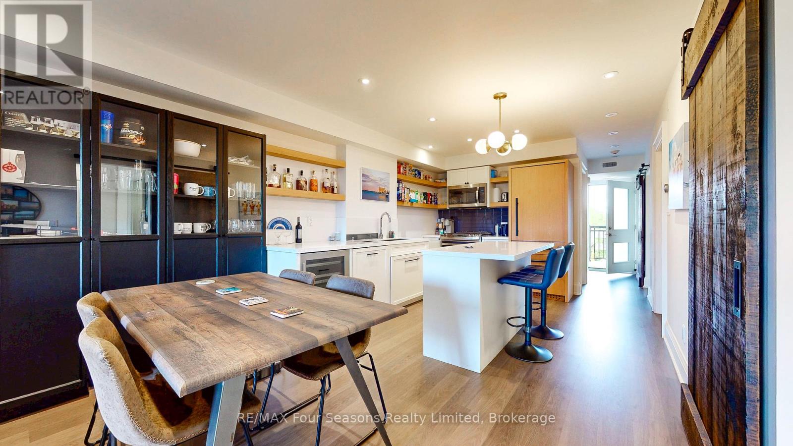 A Truly Unique Wyldewood Cove Osler Unit! This exceptional, one-of-a-kind residence was fully redesigned and retrofitted by renowned Toronto designer and gallery owner, Alison Milne. With panoramic views of the Niagara Escarpment from the front of this second floor unit and stunning seasonal Georgian Bay vistas from the back balcony, this home features over $250,000 in upgrades, custom improvements, and meticulous attention to detail. The space is move-in ready, offering a seamless living experience. Inside, you'll find pot lights throughout, each controlled by Lutron Maestro dimmers, and complemented by elegant Elte fixtures in every room. The chef's kitchen is a dream, complete with a new wine fridge (2025), GE Elite gas stove, new microwave/rangehood (2025), deep pocket pot drawers, and a fully integrated fridge and dishwasher. The luxurious master suite is a serene retreat, featuring a custom barn board headboard, a king-sized bed, under-bed storage, and a built-in wall closet. The ensuite bath boasts heated floors for ultimate comfort. After a day of outdoor adventure, unwind in the spacious open concept great room featuring living room and dining area/kitchen, complete with custom concrete gas fireplace. Step outside to the private balcony and soak in the breathtaking seasonal Georgian Bay views. This impeccably maintained condo offers the perfect balance of luxury and convenience, with active lifestyle amenities, including a gym, change rooms, and a year-round heated outdoor pool for winter enjoyment. Wyldewood Cove is an exclusive waterfront community and also features kayak/paddleboard area by the beach area and dock featuring a small channel to the Bay and serene views of the historic Nottawasaga Lighthouse. This executive condo truly embodies the best of four-season living! (id:51158)