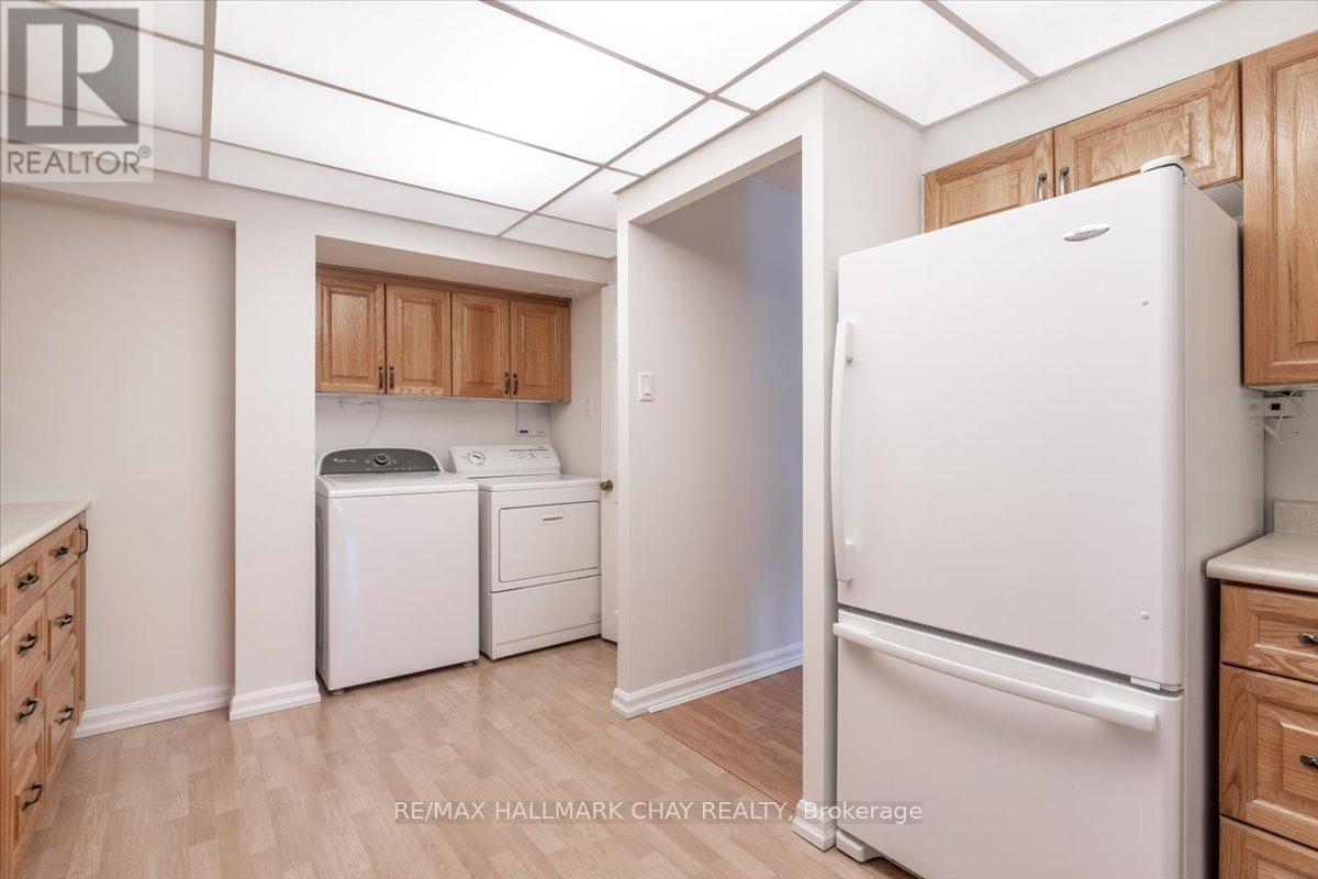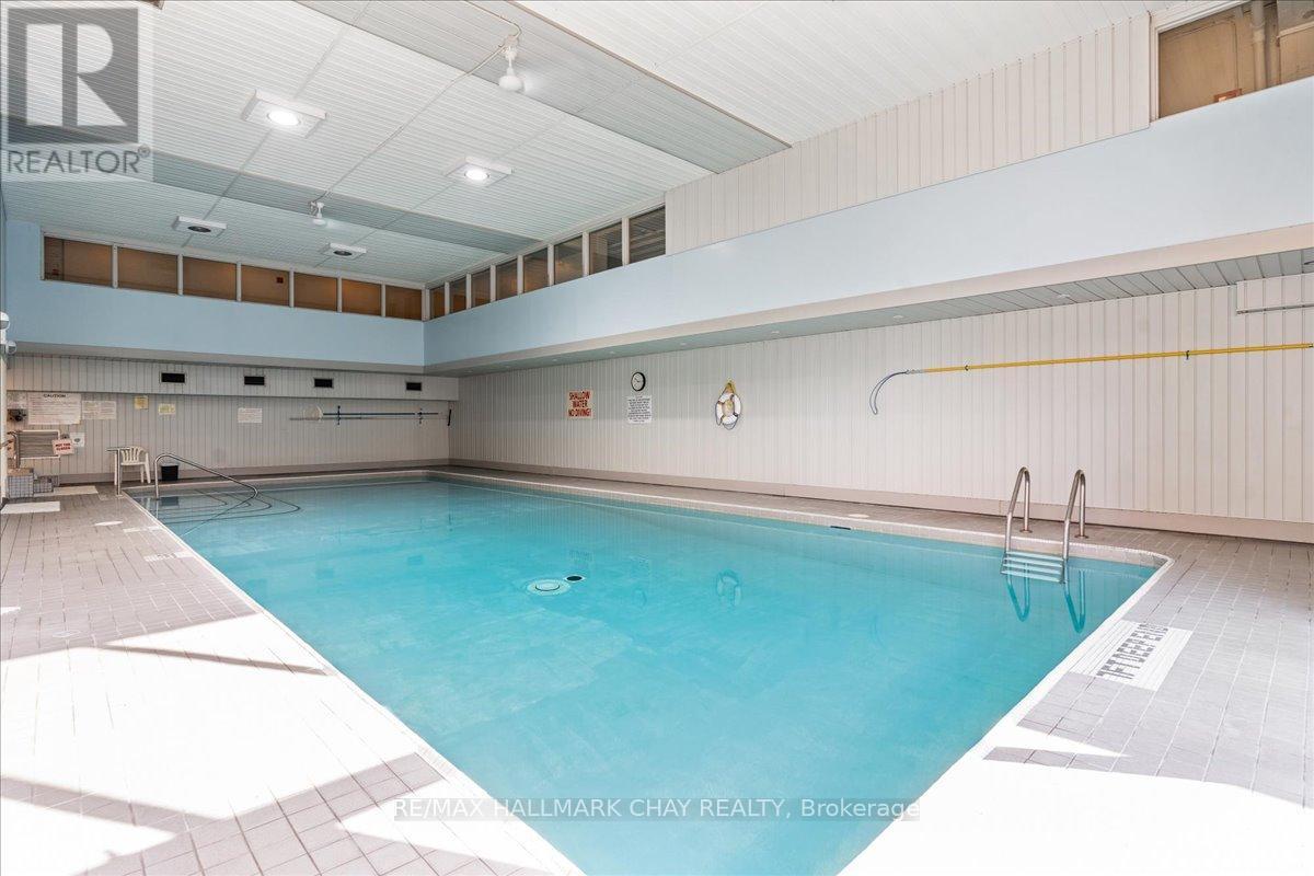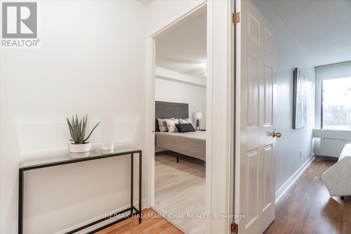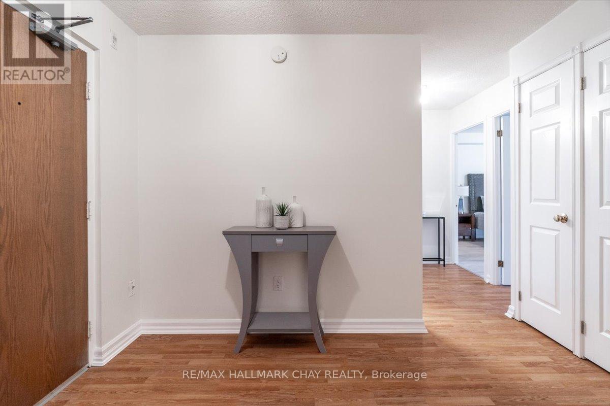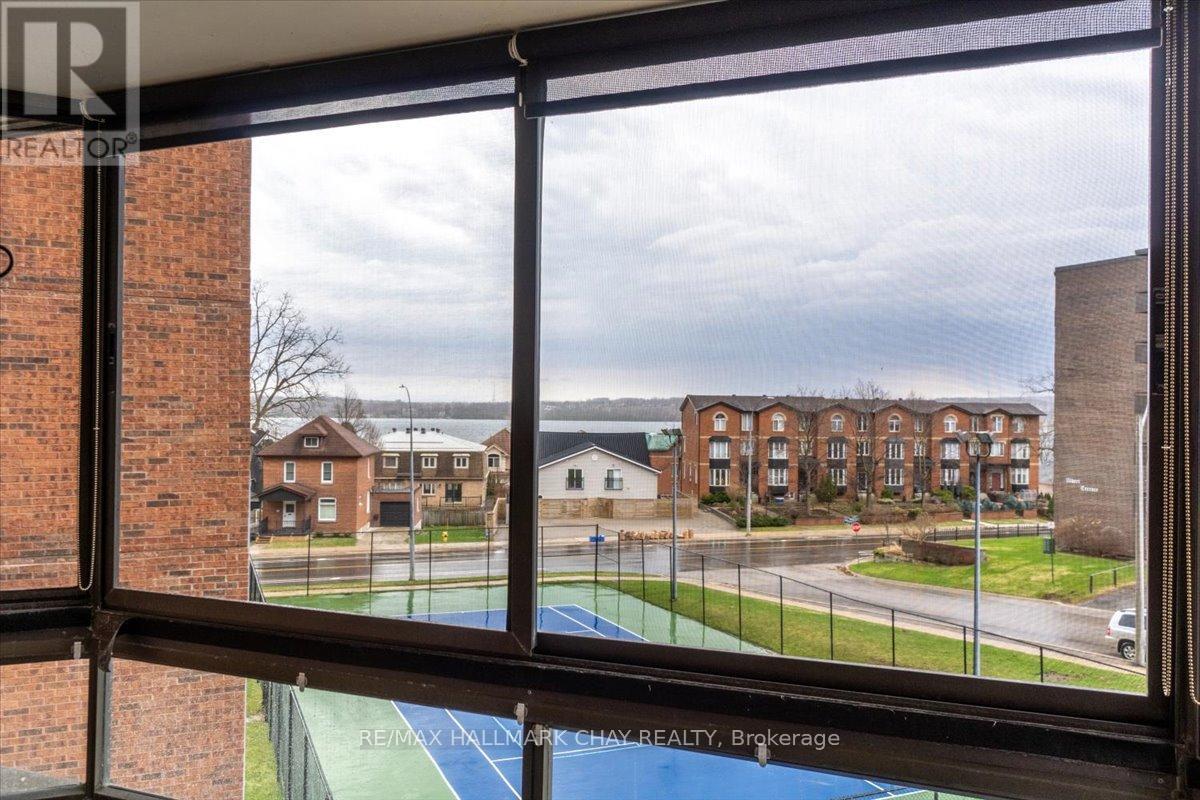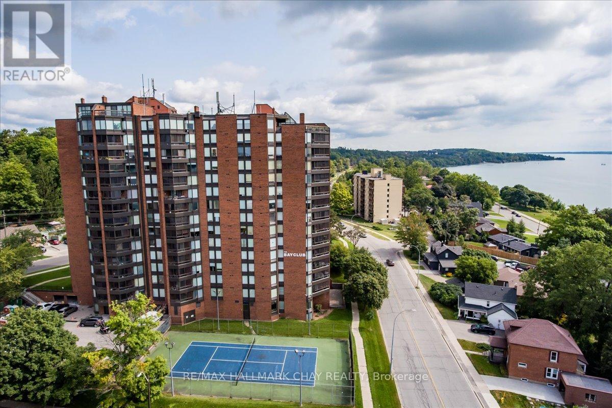 Welcome to The Bayclub! Spacious 2-bedroom, 2-bathroom 1,265 square foot suite. This lovely condo has a nice bright southwestern view, overlooking the newly surfaced pickle ball court. Large kitchen with loads of cabinets, pot drawers, double sink and built in laundry area. Roomy storage room that could easily accommodate the laundry for a dedicated laundry room. Spacious living room combined with the dining, bright and cheery with warm wood tones. Both the main bathroom and the ensuite bath have been updated, ensuite has walk-in shower. Large primary bedroom with a large walk-through closet. Home has been recently painted throughout with neutral paint and newer laminate flooring in the primary bedroom. Lovely enclosed balcony, barbecues are permitted. The underground has an assigned parking space and storage locker. The Bayclub is located in the highly desired quiet east end of Barrie steps to Kempenfelt Bay, walking path, downtown, and shopping as well as the Parkview Centre and transit. Best variety of recreational activities of all Barrie condos. Fantastic recreation facilities include one of the largest indoor pools of all the Barrie condominiums, indoor squash court, outdoor tennis/pickle ball court, expansive workshop for those who are handy or want to be, exercise room, billiards room, library, sauna, party room, guest suite, potting room for plant enthusiasts. Onsite management, superintendent and cleaner. Visitor parking lot and lovely well-kept grounds. (id:51158)