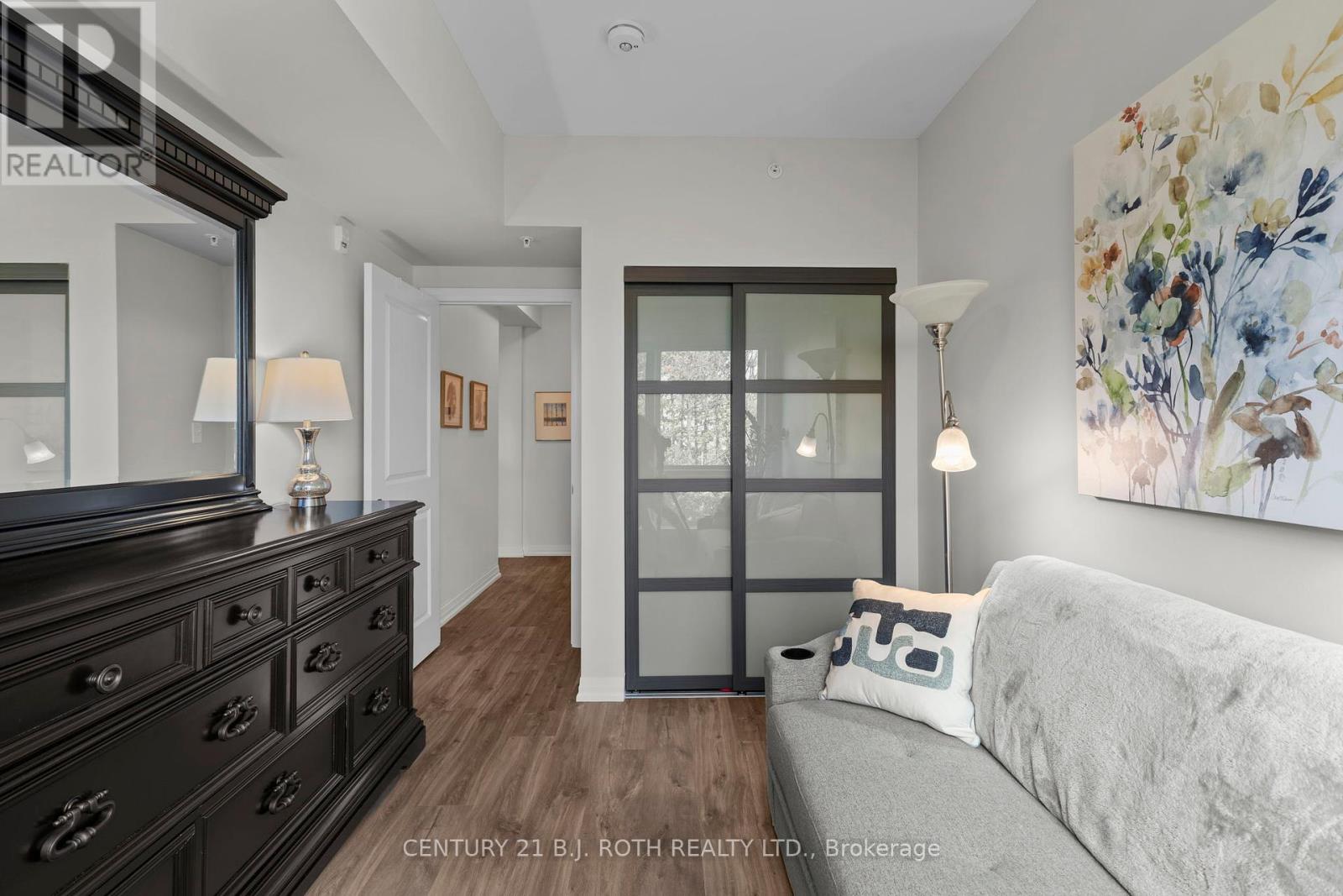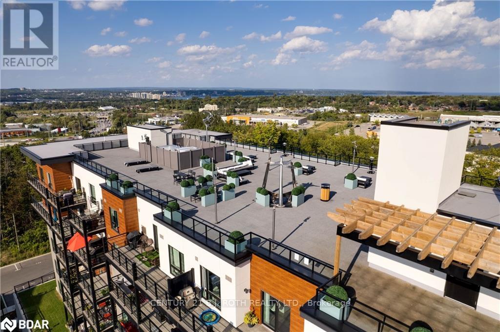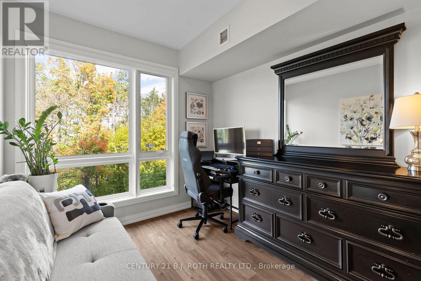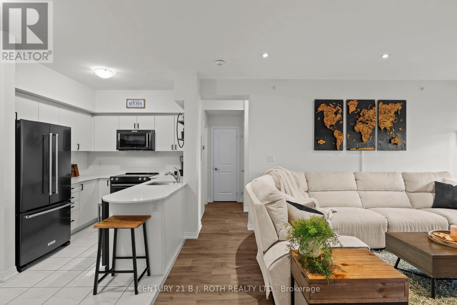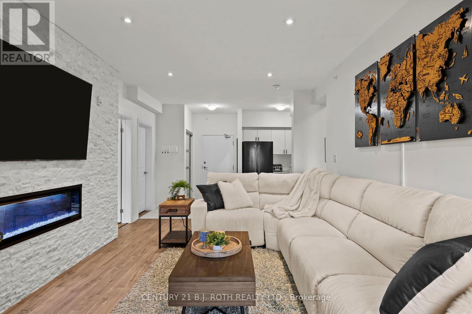 $551.86 MonthlyDiscover Suite 204 at The Gallery Condominiums, a showcase of modern West Coast style and design in Barrie's sought-after Ardagh community. This beautifully upgraded 2-bed + den, 2-bath suite offers 1,080 sq. ft. of open concept living; blending luxury finishes, comfort, and low-maintenance convenience. As you step inside, the sleek kitchen takes center stage, featuring quartz countertops, subway tile backsplash, top-of-the-line black KitchenAid appliances, and a built-in beverage fridge, perfect for both everyday living and entertaining. The open concept living area is warm and inviting, highlighted by a stone feature wall with a Napoleon electric fireplace, creating a cozy ambiance for movie nights or hosting guests. Large windows offer a serene tree-lined view, complemented by roller shades and pot lights that enhance the condos modern aesthetic. The spacious primary bedroom comfortably fits a king-size bed and full bedroom suite, featuring upgraded closet doors and a stylish 4-piece ensuite designed for relaxation. The large den offers incredible versatility, easily converted into a third bedroom, formal dining room or home office to suit your lifestyle. Additional highlights include an upgraded washer and dryer, fresh paint throughout, a pantry, and a Nest thermostat for smart, energy-efficient living. Step outside to your private balcony, perfect for unwinding or barbecuing a delicious meal. Residents also enjoy exclusive access to the 11,000 sq. ft. rooftop patio, offering panoramic views of Barrie and Kempenfelt Bay, an incredible space to relax or entertain. Just steps from your front door, explore the peaceful 14-acre forested park, ideal for a quiet walk or hike. Conveniently located minutes from Highway 400, shopping, dining, and the Rec. Centre, this home perfectly combines luxury, nature, and convenience in one exceptional package. **1 underground parking spot & locker included. Additional parking may be available for purchase or lease.** (id:51158)