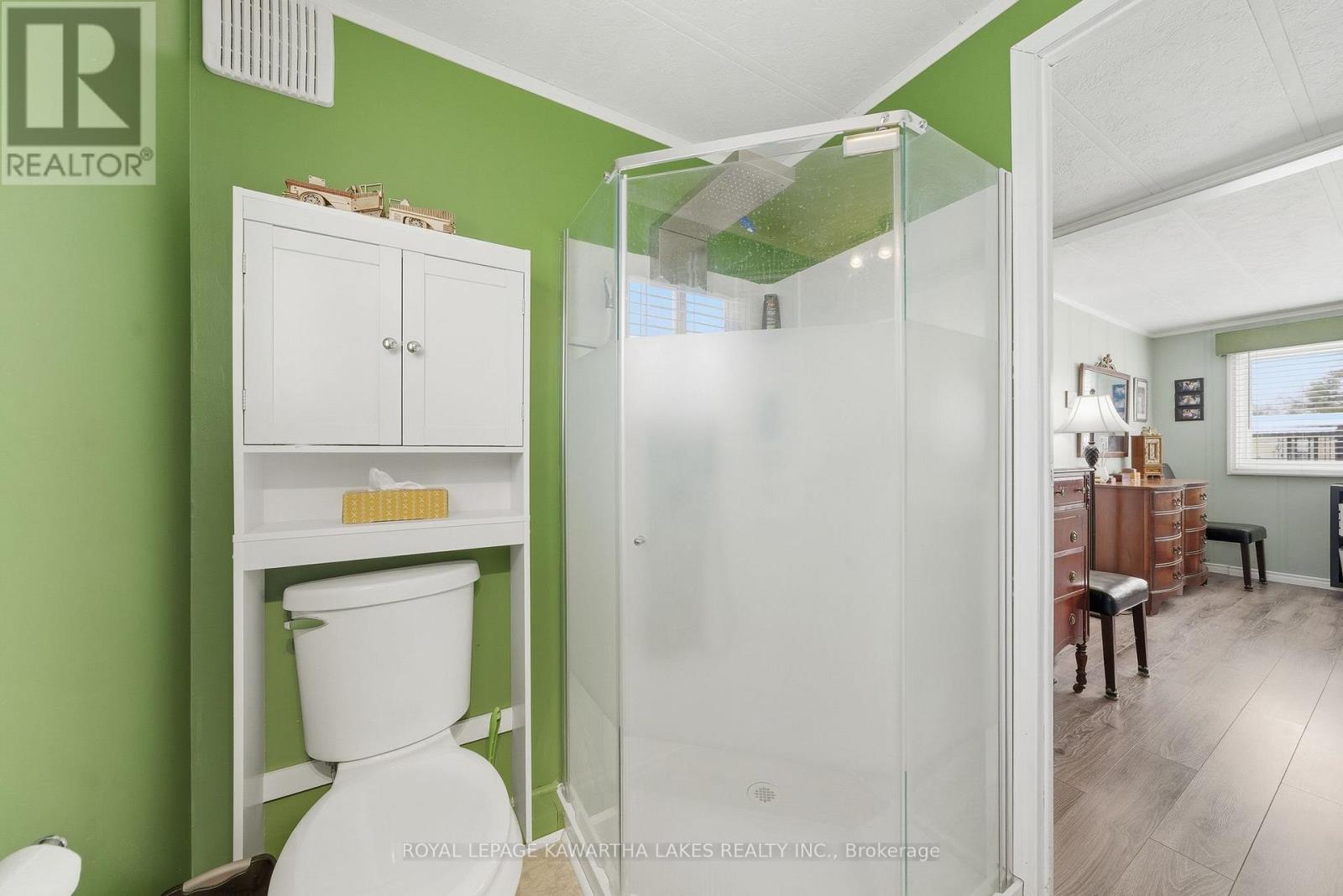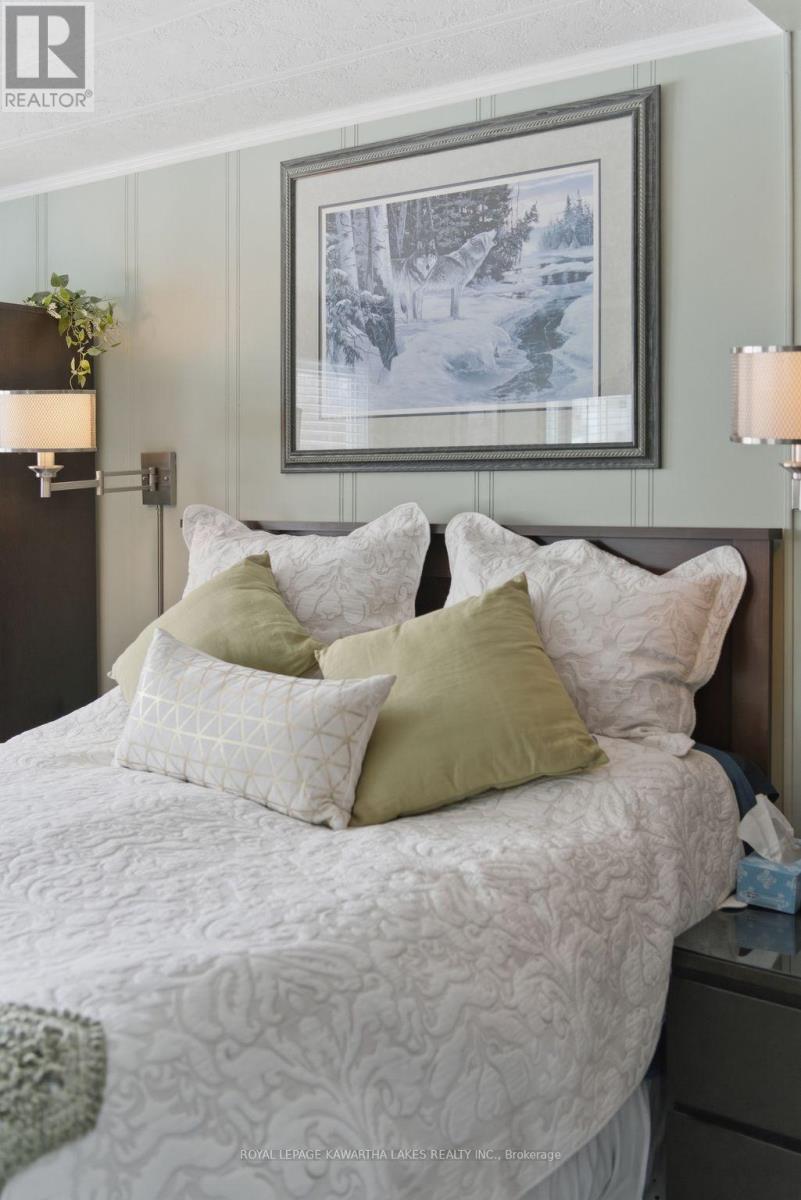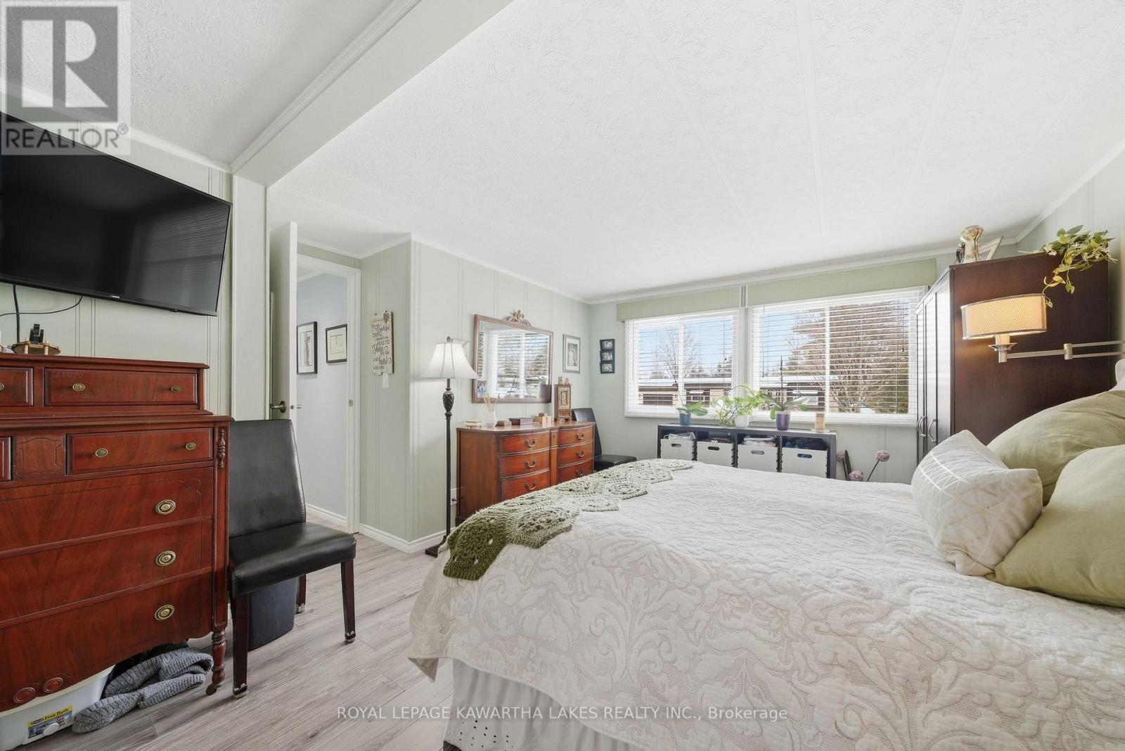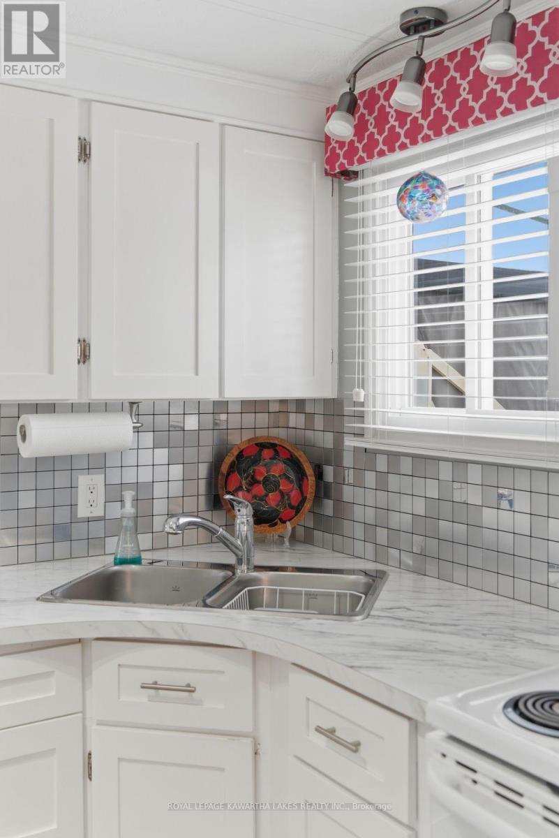 Welcome to Joy Vista Estates-a peaceful, friendly, and affordable adult lifestyle community in beautiful Kawartha Lakes, just 10 minutes from Lindsay. This well-maintained home truly shows pride of ownership and offers 2 bedrooms and 2 bathrooms, thoughtfully updated throughout. Enjoy new flooring, upgraded bathrooms, and a refreshed kitchen featuring new countertops and backsplash, with convenient laundry and pantry space just off the kitchen. The spacious primary bedroom includes a walk-in closet and a 3-piece ensuite. Outside, you'll find a single-car garage, paved laneway, and a garden shed for extra storage. Recent exterior upgrades include 2021 fiberglass shingles with a 20-year transferable warranty, new siding with added 1.5" foam board for improved R-value, new exterior doors, and most windows replaced. Relax and unwind on the maintenance-free deck with a screened gazebo-perfect for enjoying the outdoors. Embrace a low-maintenance lifestyle in this vibrant community. Lease fees to a New Owner $746.76/month (covering land lease fee, applicable taxes, water & water testing, sewers, garbage/recycling pickup) & access to community amenities. (id:51158)