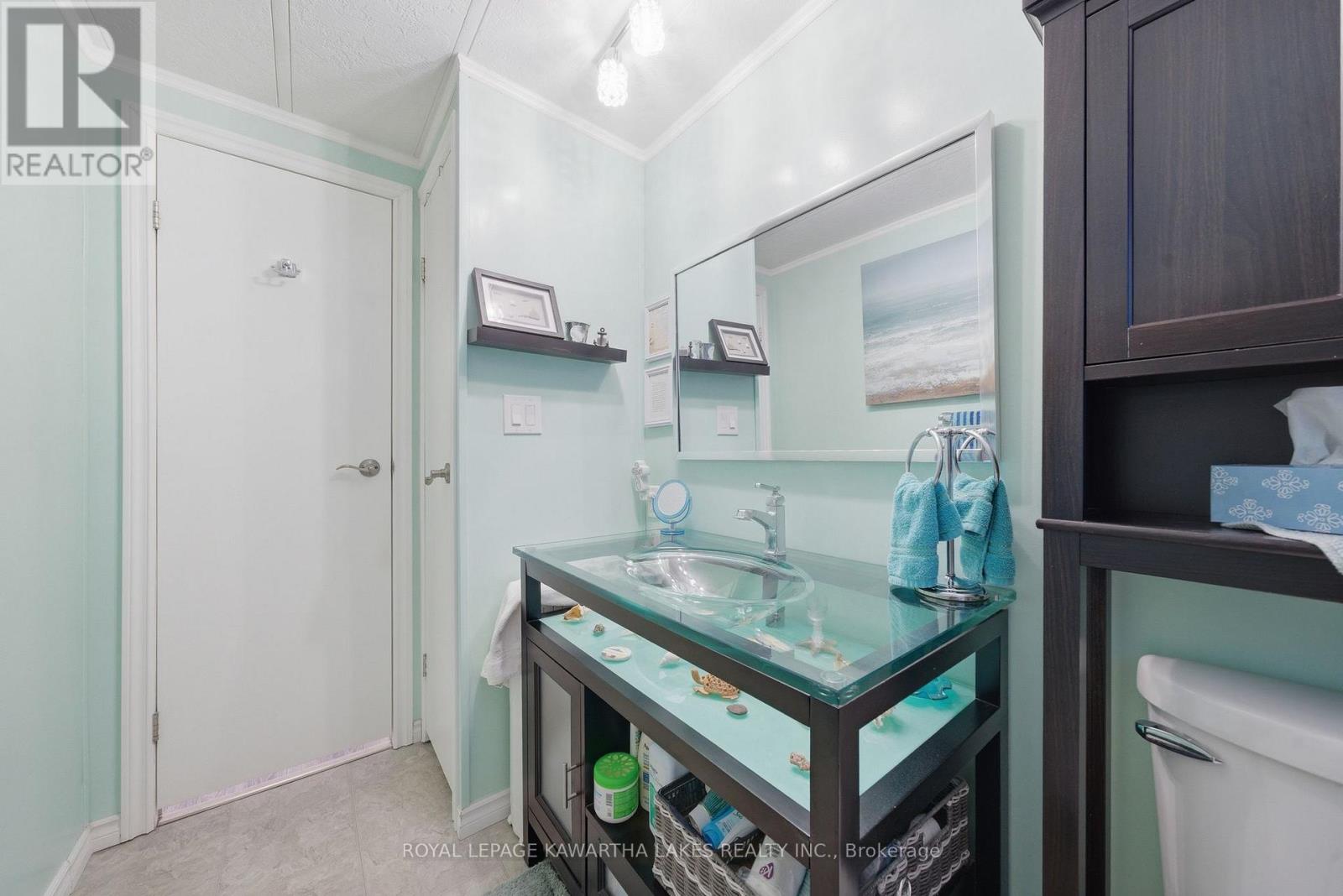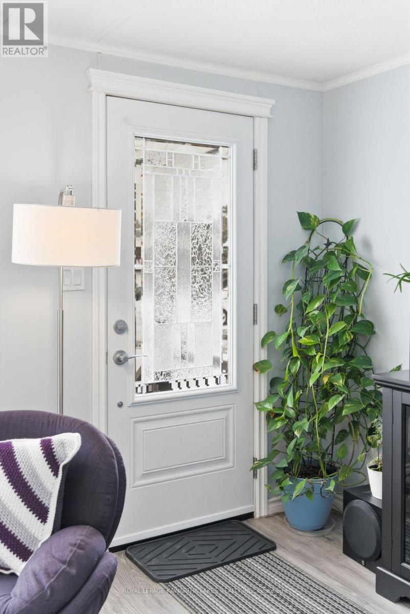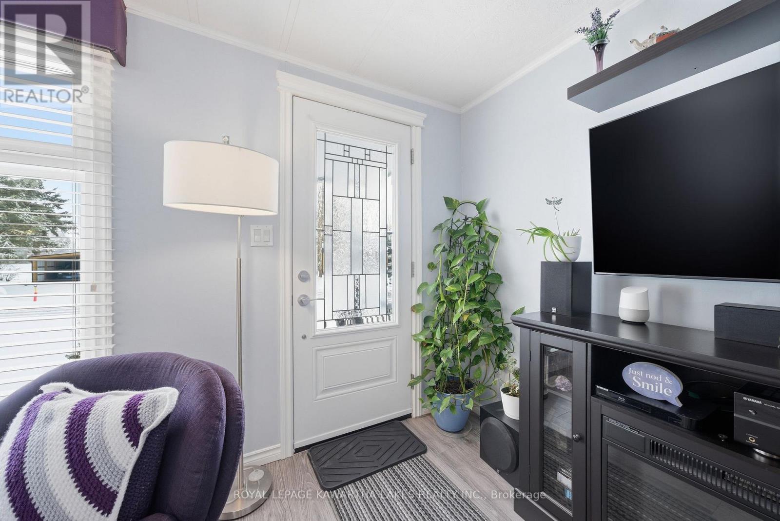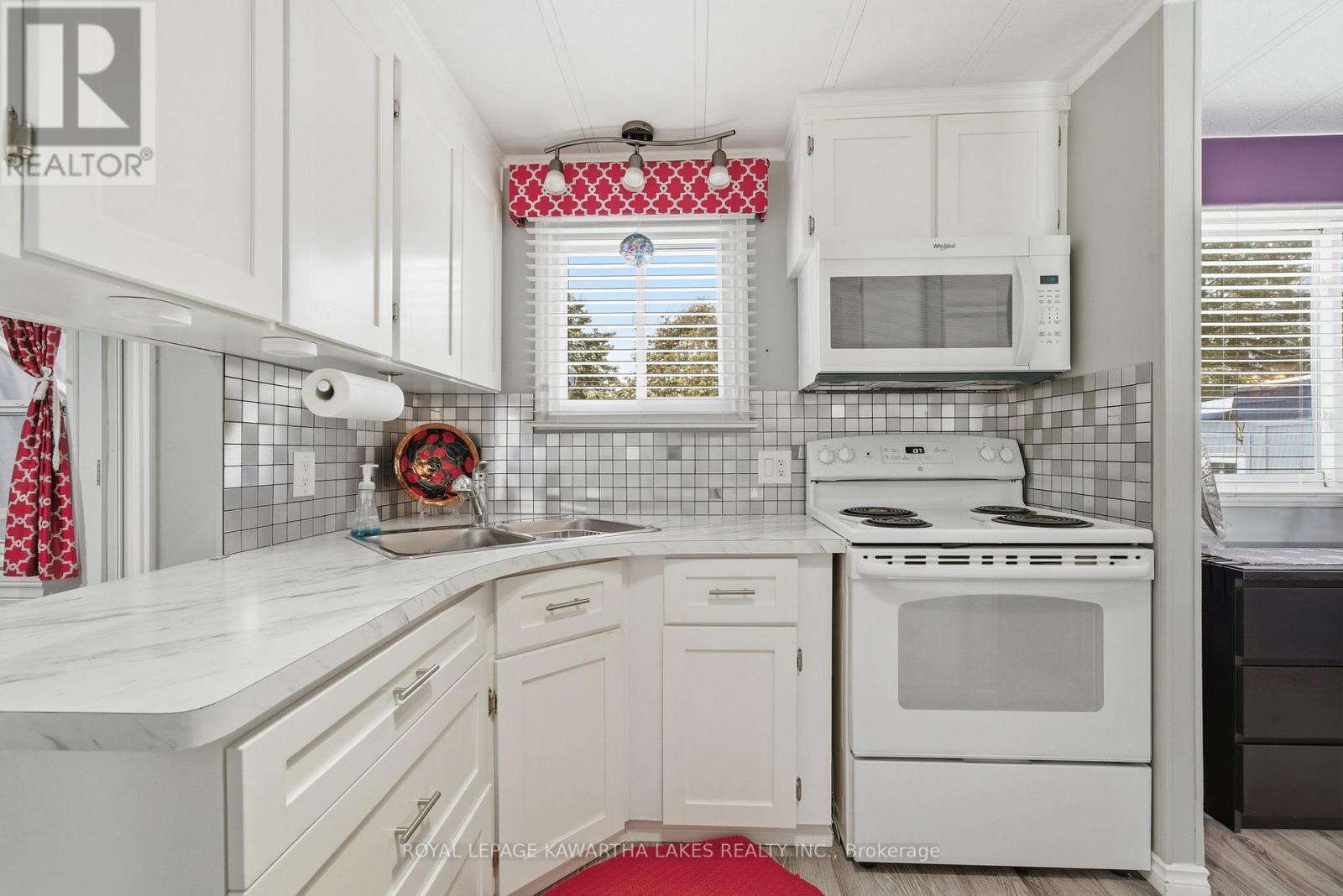 Welcome to Joy Vista Estates-a peaceful, friendly, and affordable adult lifestyle community in beautiful Kawartha Lakes, just 10 minutes from Lindsay. This well-maintained home truly shows pride of ownership and offers 2 bedrooms and 2 bathrooms, thoughtfully updated throughout. Enjoy new flooring, upgraded bathrooms, and a refreshed kitchen featuring new countertops and backsplash, with convenient laundry and pantry space just off the kitchen. The spacious primary bedroom includes a walk-in closet and a 3-piece ensuite. Outside, you'll find a single-car garage, paved laneway, and a garden shed for extra storage. Recent exterior upgrades include 2021 fiberglass shingles with a 20-year transferable warranty, new siding with added 1.5" foam board for improved R-value, new exterior doors, and most windows replaced. Relax and unwind on the maintenance-free deck with a screened gazebo-perfect for enjoying the outdoors. Embrace a low-maintenance lifestyle in this vibrant community. Lease fees to a New Owner $746.76/month (covering land lease fee, applicable taxes, water & water testing, sewers, garbage/recycling pickup) & access to community amenities. (id:51158)