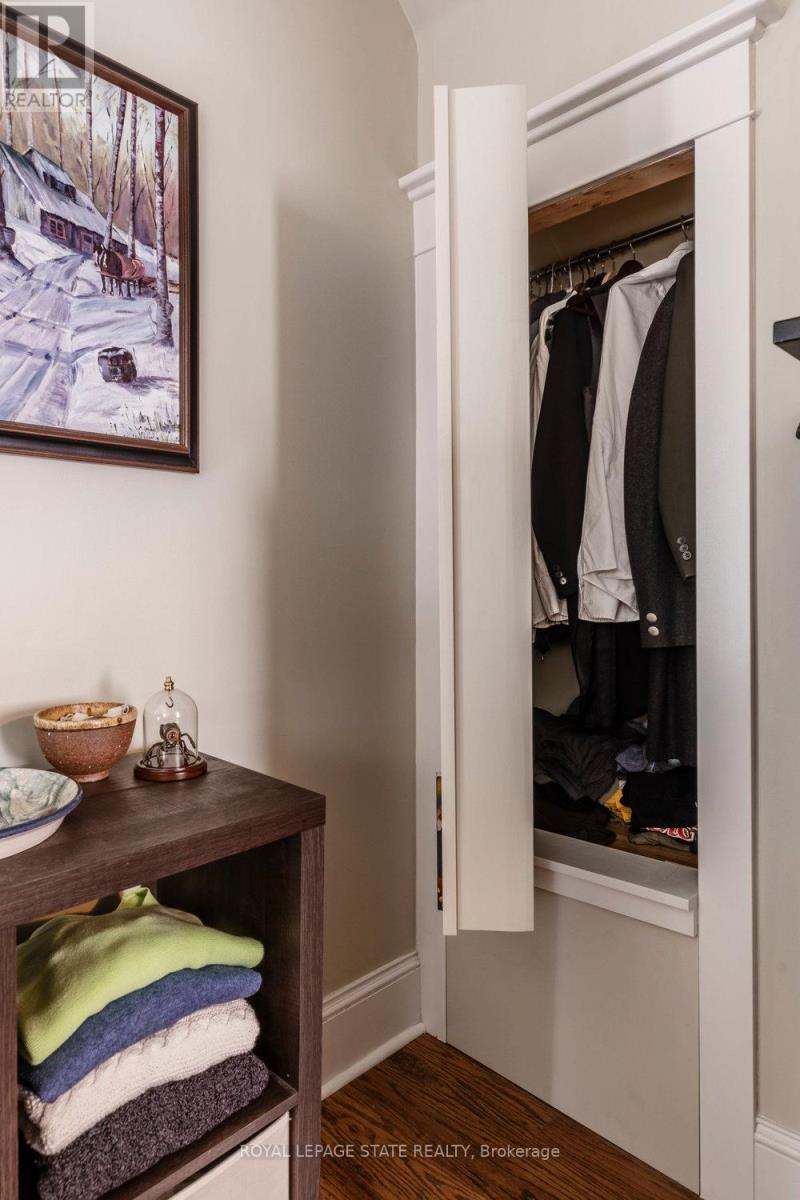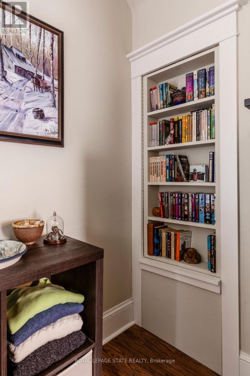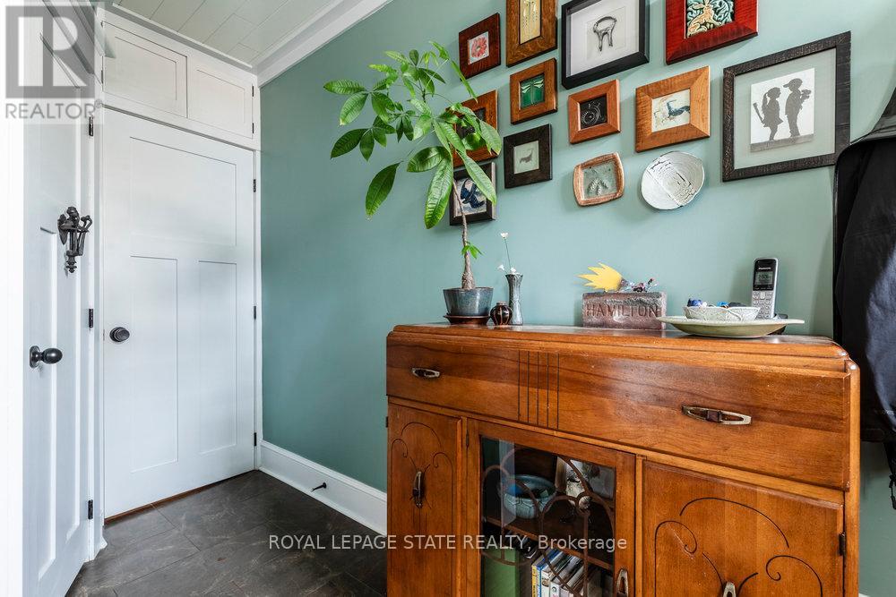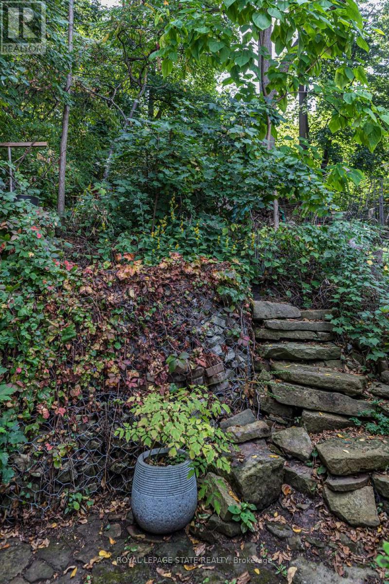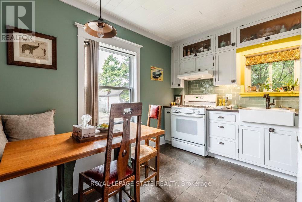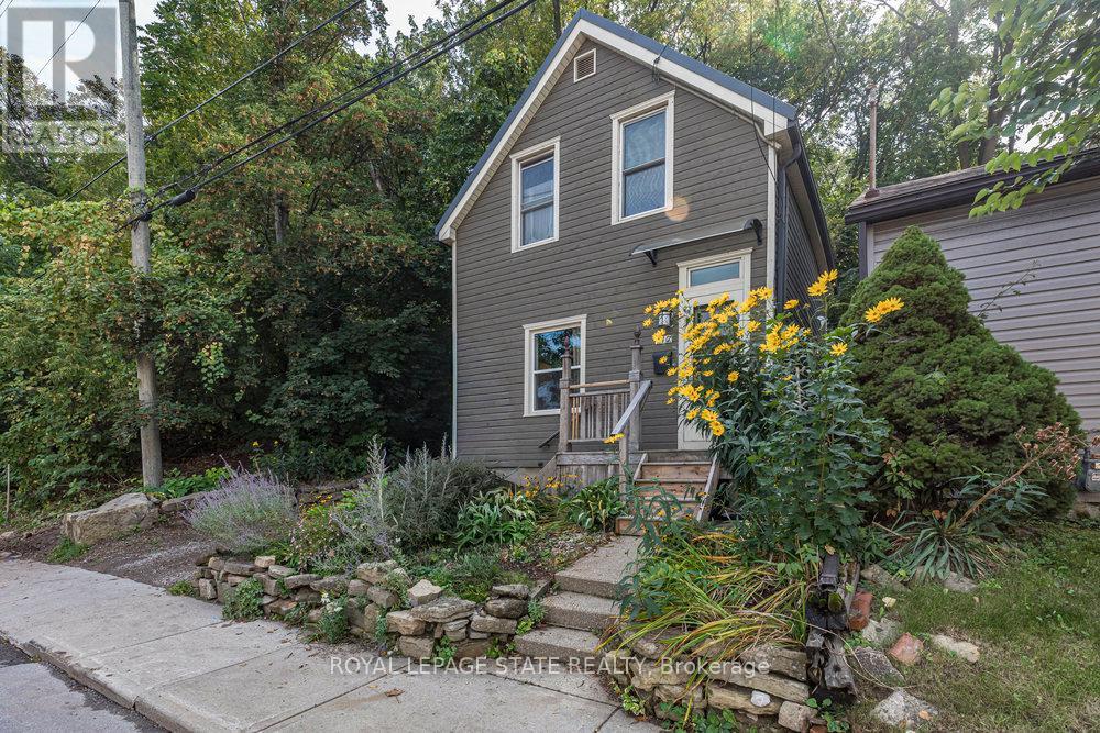 Outstanding transformation inside & out with no stone left unturned! Tucked away at the base of the escarpment, this thoughtfully renovated 2-storey, 2-bedroom, 1-bath home is full of character, creativity, and modern convenience. From its clever storage solutions to its private secret garden patio, every detail has been carefully designed to make the most of both space and style. Step inside to discover an updated kitchen thats as functional as it is beautiful, featuring built-in banquette seating with custom cushions (and hidden storage!), a pull-out butcher block for added prep space, subway tile backsplash, and generous cabinetry. The living room offers a walkout to a stunning interlock and flagstone patio a private oasis perfect for morning coffee or evening gatherings w/ built-ins & glass display shelves to add ambiance and charm. Upstairs, the primary bedroom delights with a hidden secret closet concealed behind a bookshelf, while the elegant 4-piece bathroom features a classic clawfoot tub and pedestal sink for a touch of vintage luxury. Additional highlights include two-car private parking a rare and valuable find and a unique sense of privacy and tranquility. This one-of-a-kind home offers the perfect blend of historic charm, smart updates, and whimsical details. This Corktown gem is steps to St. Jos, the GO & amenities. A must-see for those seeking something truly special. (id:51158)