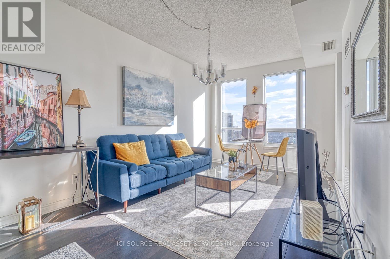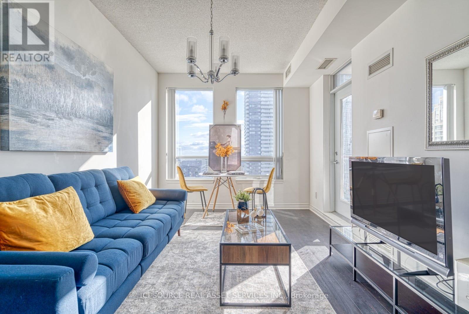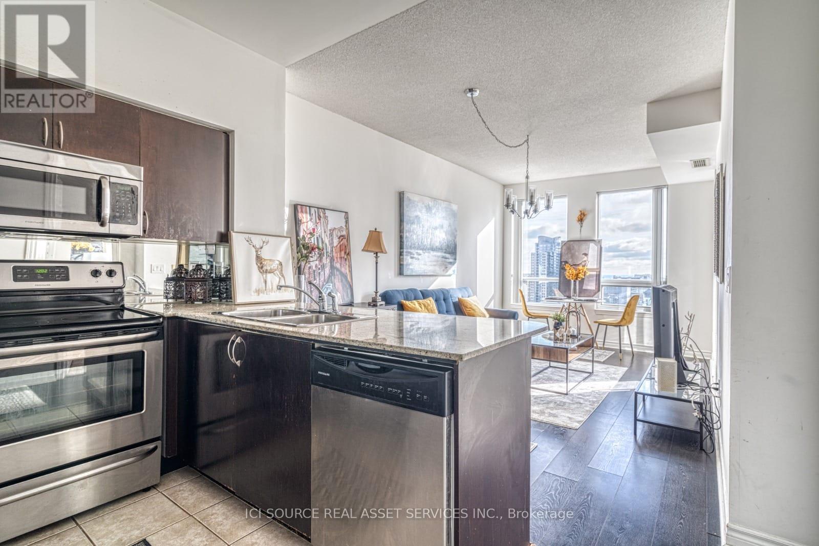 A bright and Furnished 1 bedroom + den condo in the heart of downtown Mississauga. Situated on a high floor with stunning panoramic views, this beautifully maintained unit is fully furnished and move-in ready. Property Features:* 1 spacious bedroom + functional den (can be used as 2nd sleeping area or office)* 2 full bathrooms for added comfort* Open-concept kitchen with stainless steel appliances & granite countertop* Modern living & dining space with floor-to-ceiling windows* Private balcony with unobstructed city views* In-suite laundry* Includes 1 underground parking spot. Extras:* Fully furnished (bedding, kitchenware, décor, TV & more)* Bright and elegant interior with tasteful finishes* Well-equipped kitchen and stylish furnishings. Location Highlights:* Steps to Square One Shopping Centre, Celebration Square, Sheridan College* Minutes from public transit, GO Station, Highway 403 & 401* Surrounded by dining, entertainment, and parks* Utilities: Tenants pay* First & last month required. Ready for immediate occupancy. Just bring your suitcase! *For Additional Property Details Click The Brochure Icon Below* (id:51158)