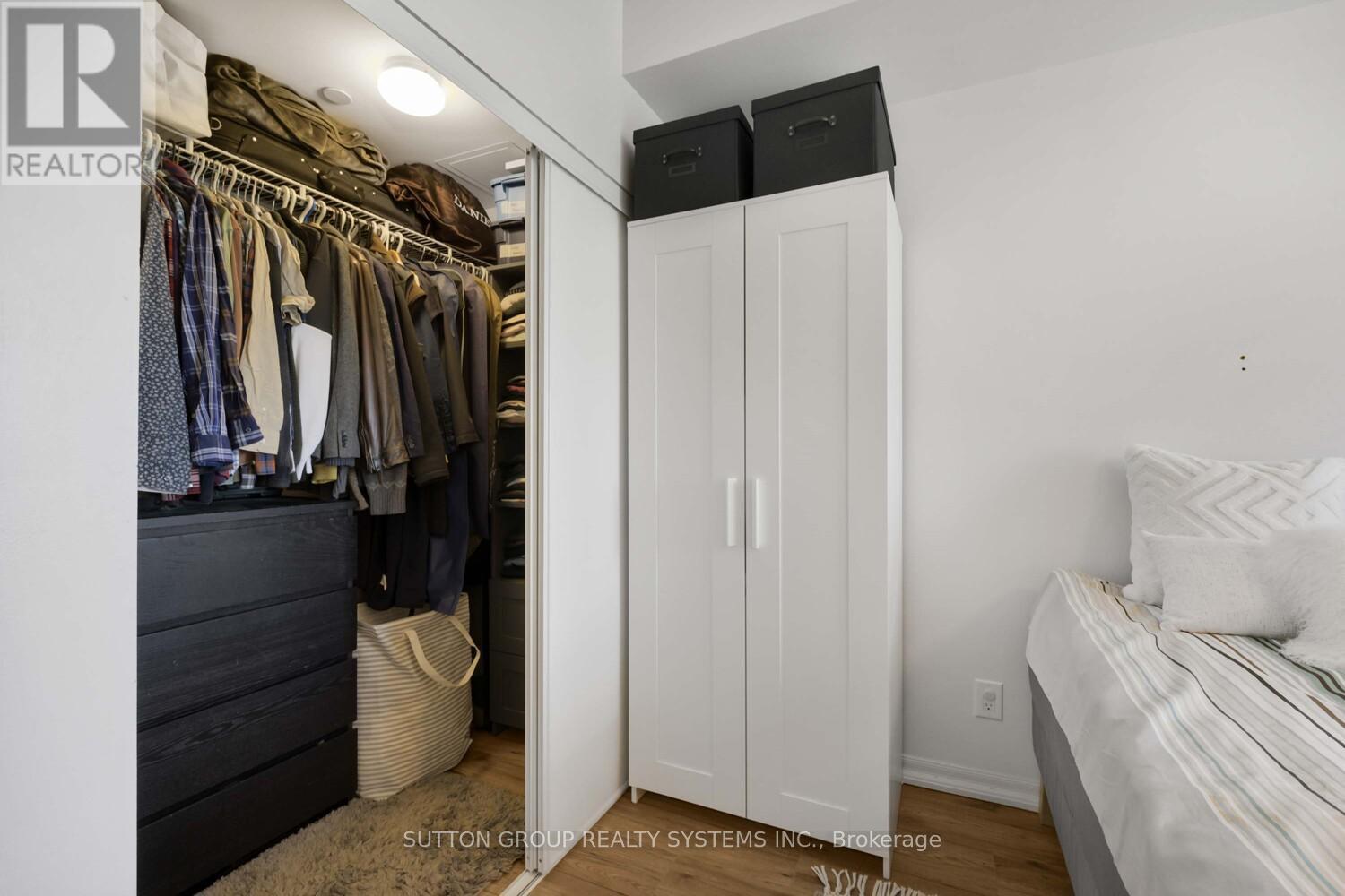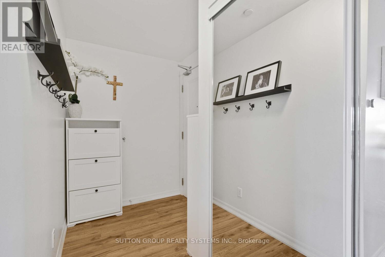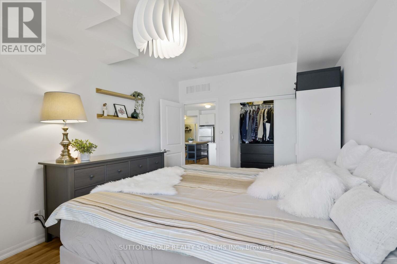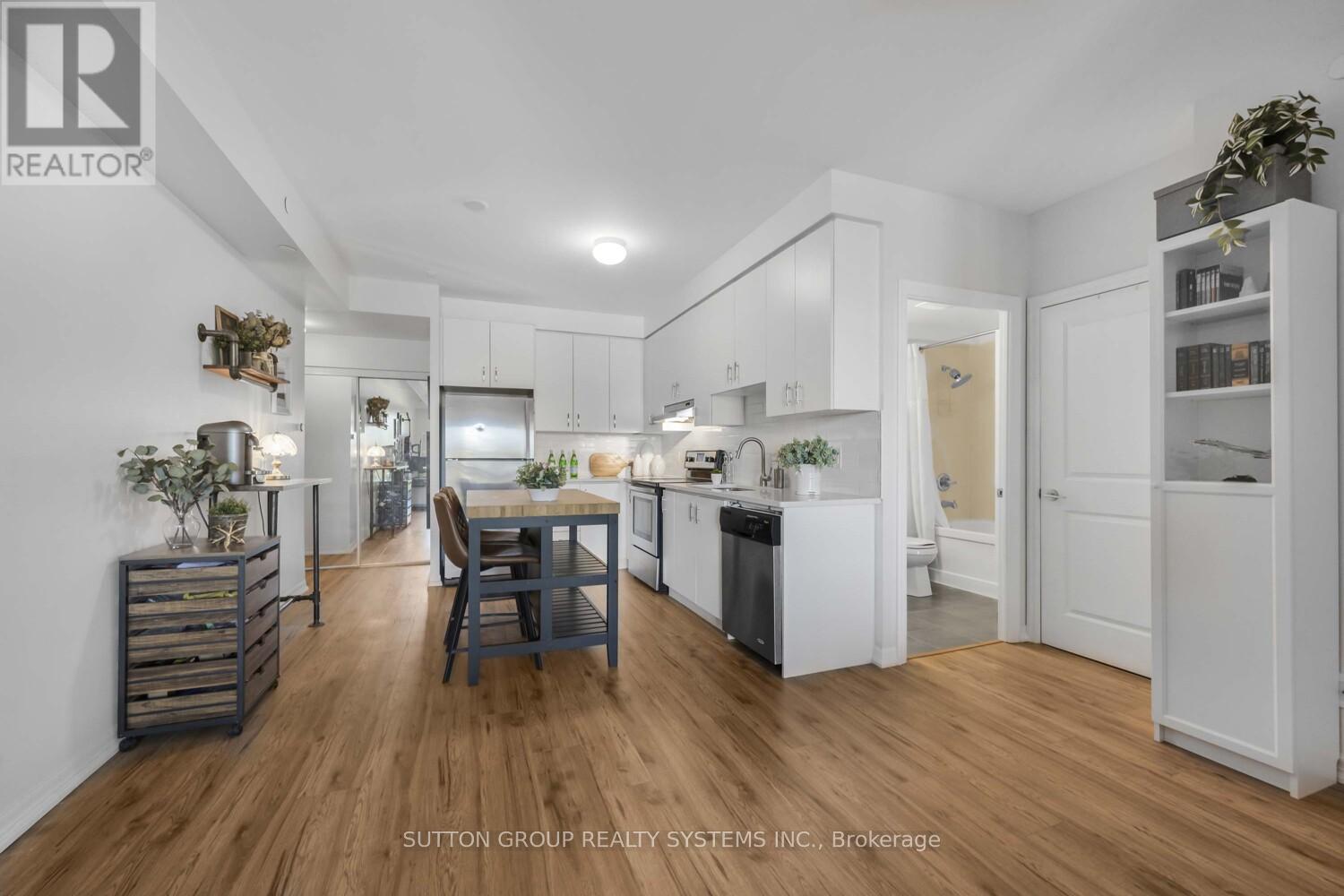 $702.45 MonthlyBoutique Watermark Residence! Bright and spacious 1-bedroom unit offering nearly 700 sq. ft. of functional living space. Features include 9' ceilings, laminate floors throughout in '2024, floor-to-ceiling windows, and open-concept living with a walk-out to a private balcony. The modern white kitchen is complete with quartz countertops and stainless steel appliances. The generous primary bedroom showcases a custom walk-in closet and a luxurious spa-inspired bathroom.. Originally designed as a 1+Den and converted by the builder into a larger 1-bedroom with a walk-in closet (can easily be reverted). Exceptional location just steps to the Lake, major transit hub (GO, TTC, MiWay), and only minutes to highways, the airport, and premier shopping. Amenities include a fitness room, rooftop deck with BBQ area, and party/meeting room. Conveniently attached to a street-front TD Bank. (id:51158)