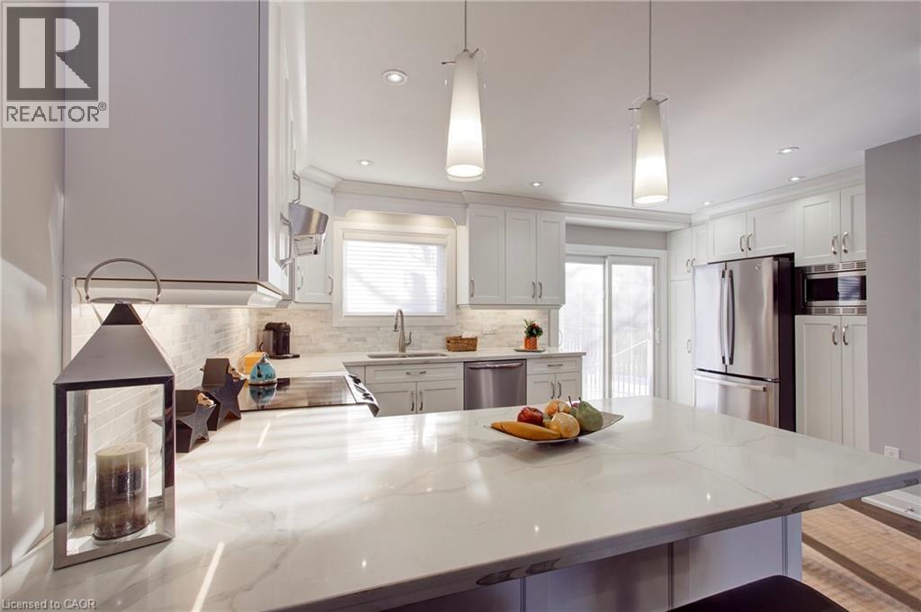 Sought after River Oaks- Open Concept Semi Detached Home backs onto Crosstown Trail just steps to Munn’s Creek on a quiet Cul-de-Sac-Updated Main Level offers Oak Floors, pot lights, Neutral Decor, Upgraded European White Kitchen with Quartz Counters, Breakfast Bar, Pendant & Undermount Lighting, Stainless Steel Appliances, Backsplash & Sliders to the Fenced Backyard- 2 Piece Powder Room- Spacious Bedrooms, Updated 4 piece Bathroom- Finished Rec Room, Workshop with Potential to be a 4th Bedroom- bonus Coldroom/ cantina- Oversized Driveway fits 4 Cars- River Oaks offers the luxury of being walking distance to all amenities, shopping, parks, Sixteen Mile Sports Complex, River Oaks Community Centre, nature trails & Top Rated Schools. Embrace urban living while enjoying peaceful walking trails and Munn’s Creek in your backyard! (id:51158)