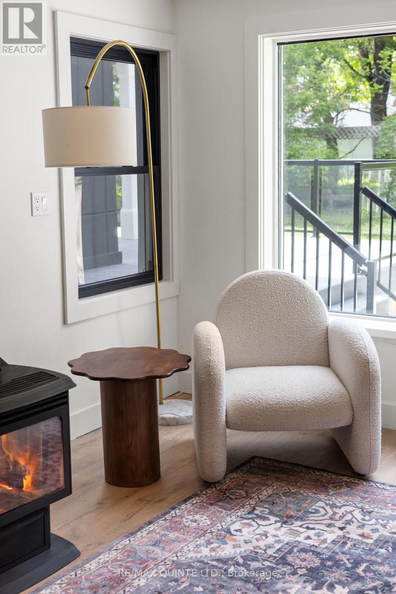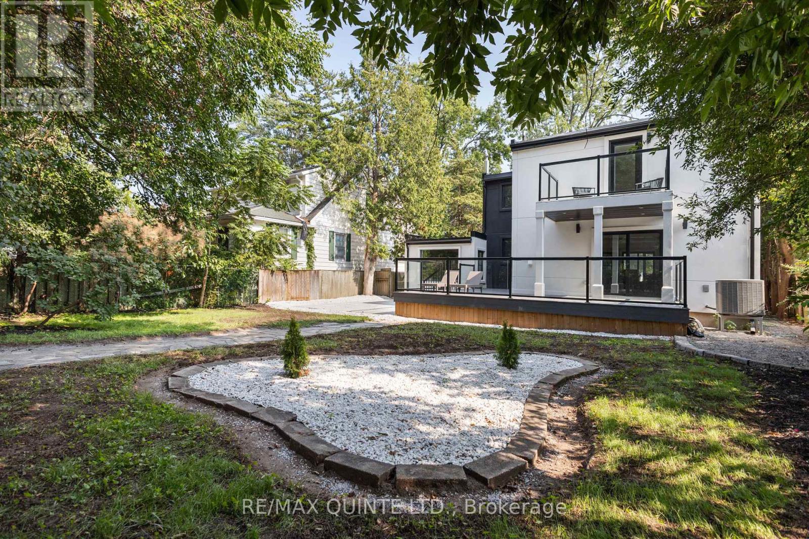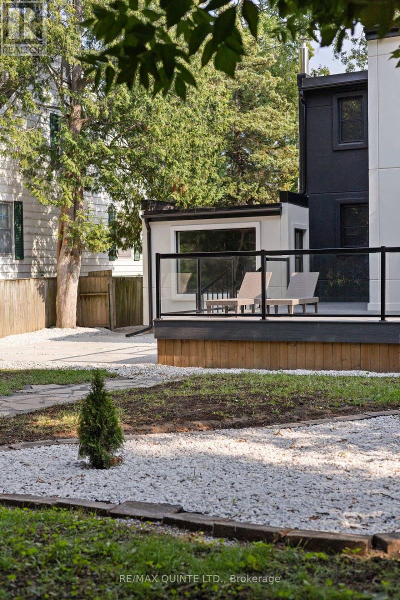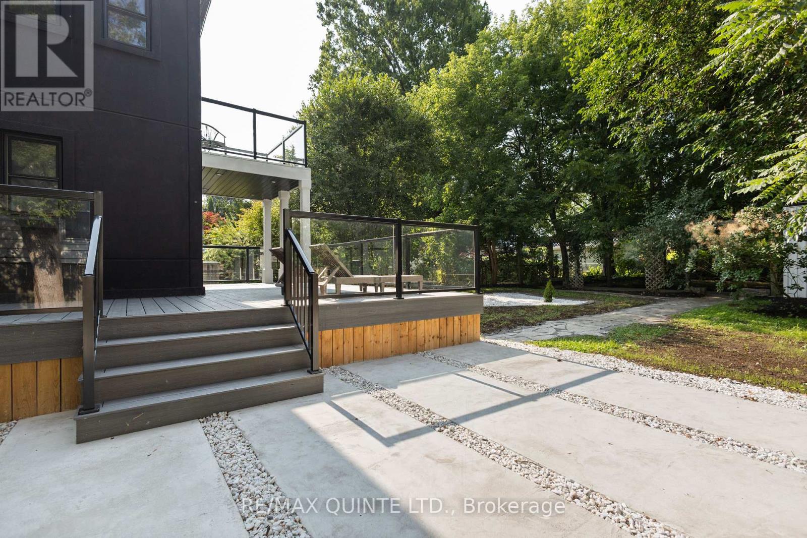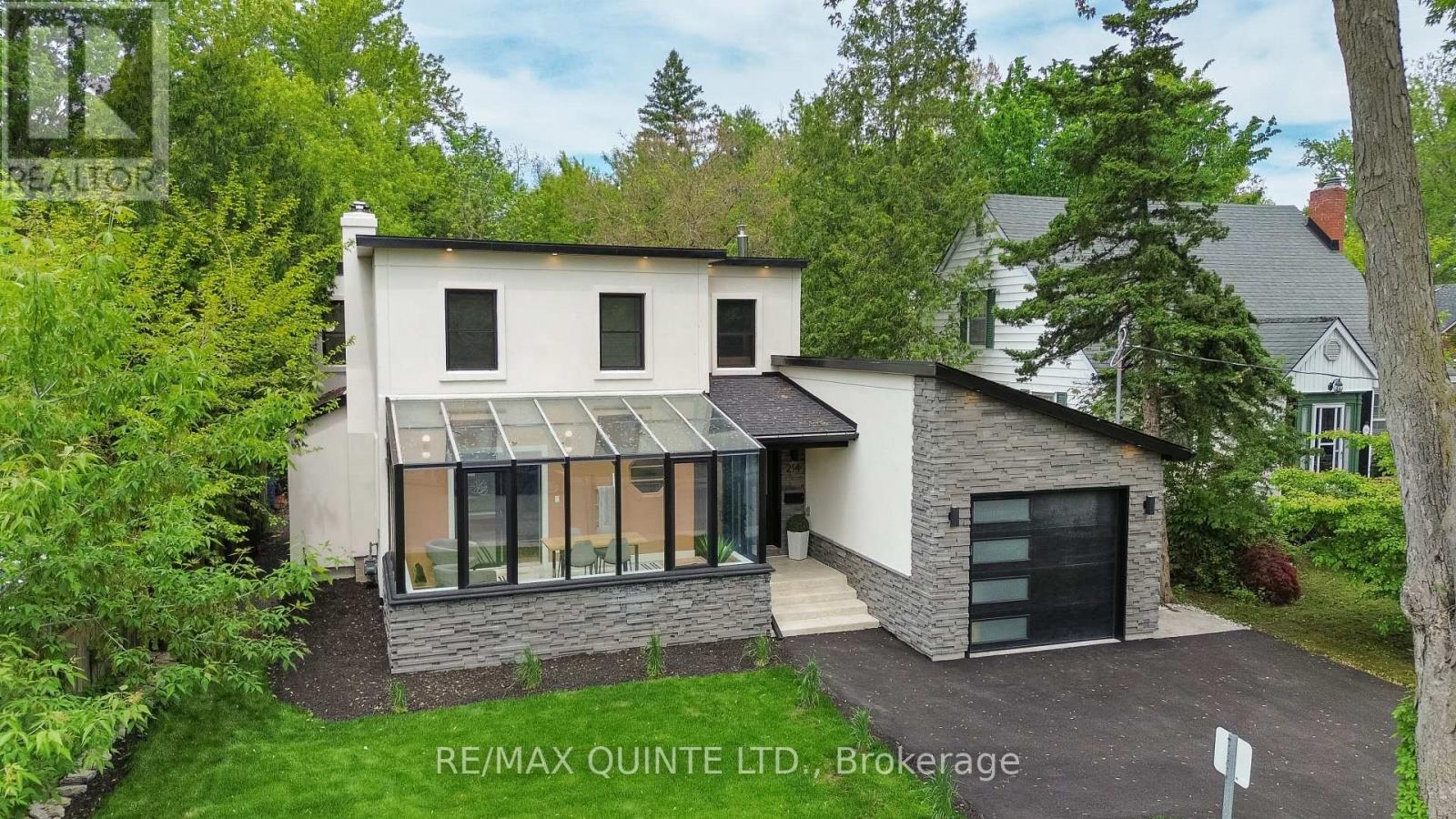 Stunning modern architectural home in the heart of Old East Hill, set on a private 175+ ft lot. Completely reimagined and thoughtfully renovated, this one-of-a-kind residence offers 3 bedrooms, 3.5 bathrooms, and multiple spaces designed for everyday living and entertaining. The striking stone and stucco exterior, attached garage, covered porch, and solarium create a bold first impression. Inside, the spacious kitchen steps down to a sunken living room with exposed beams, a gas fireplace, and oversized rear-facing windows that bring the outdoors in. A 2-piece bath and convenient laundry area are tucked away enroute to the open-concept living and dining area featuring modern lighting, a second gas fireplace, a wet bar, and access to the expansive composite deck with glass railings. Upstairs, all three bedrooms are paired with full bathrooms for ultimate convenience. The primary suite includes a walk-in closet, feature wall with sconce lighting, and a walkout to a private terrace overlooking the park-like backyard. Additional outdoor highlights include a lower-level concrete patio and steps wrapping around the eastside. Situated in one of Belleville's most sought-after neighbourhoods, this home stands out for its design, finishes, and exceptional setting. (id:51158)
