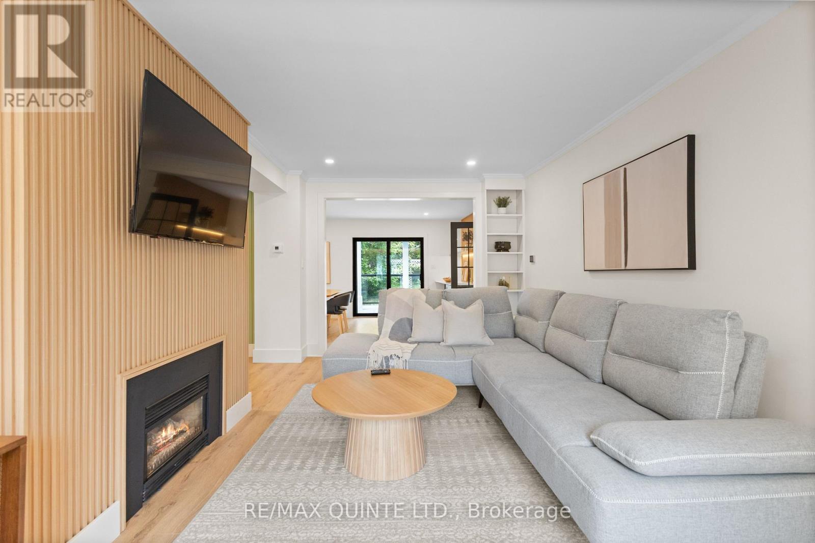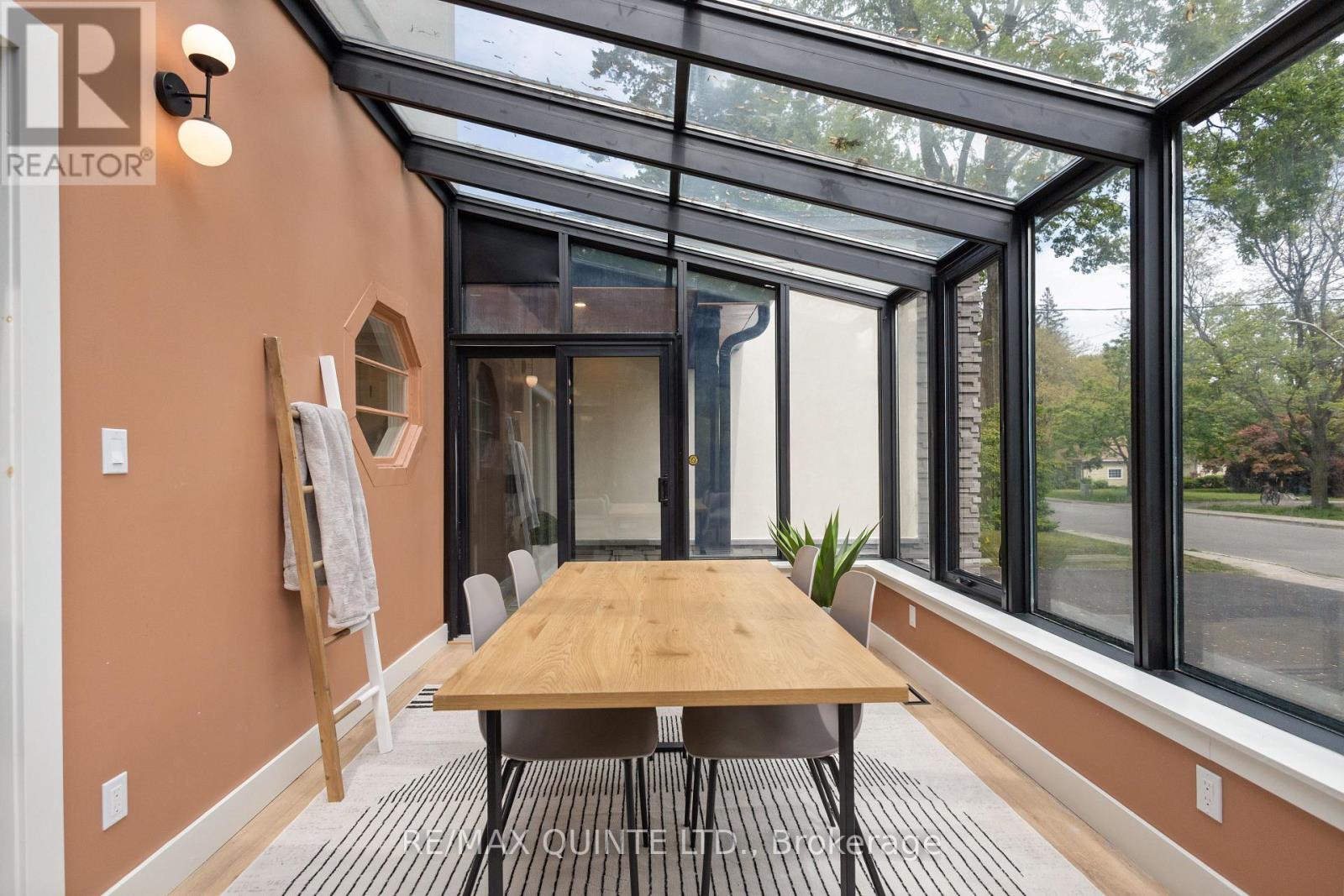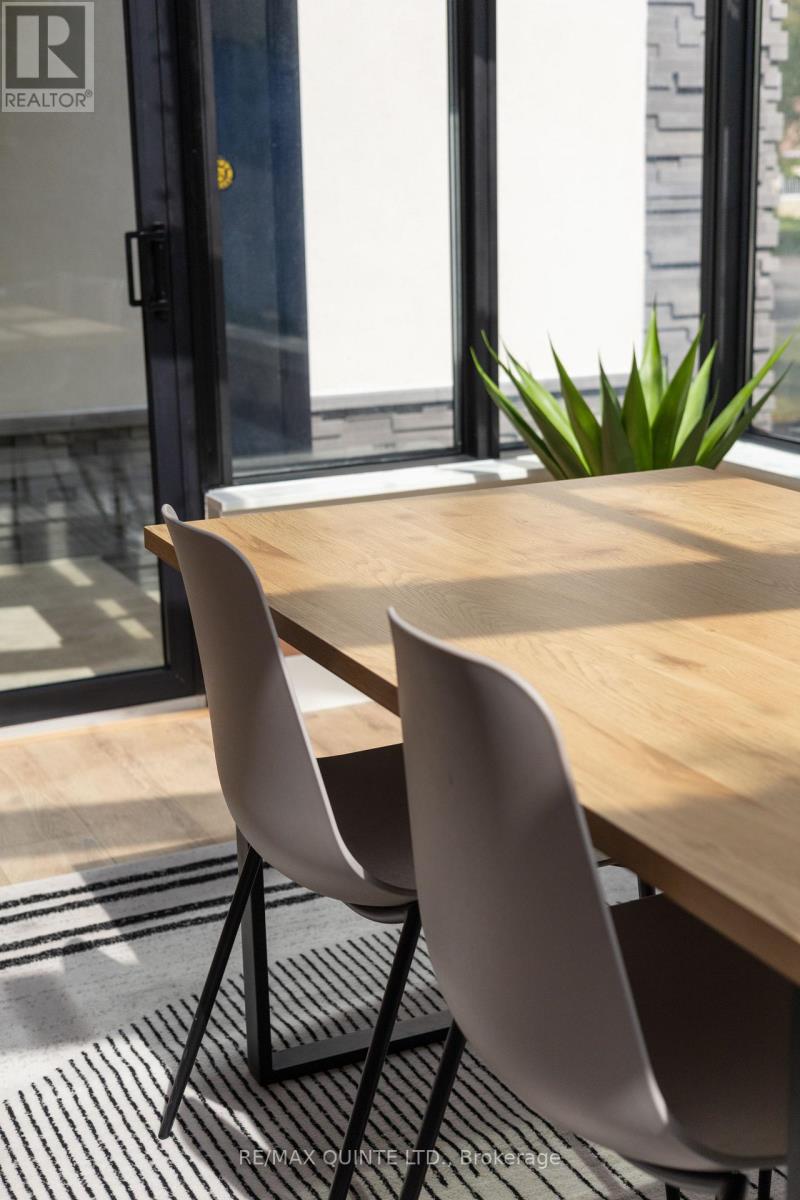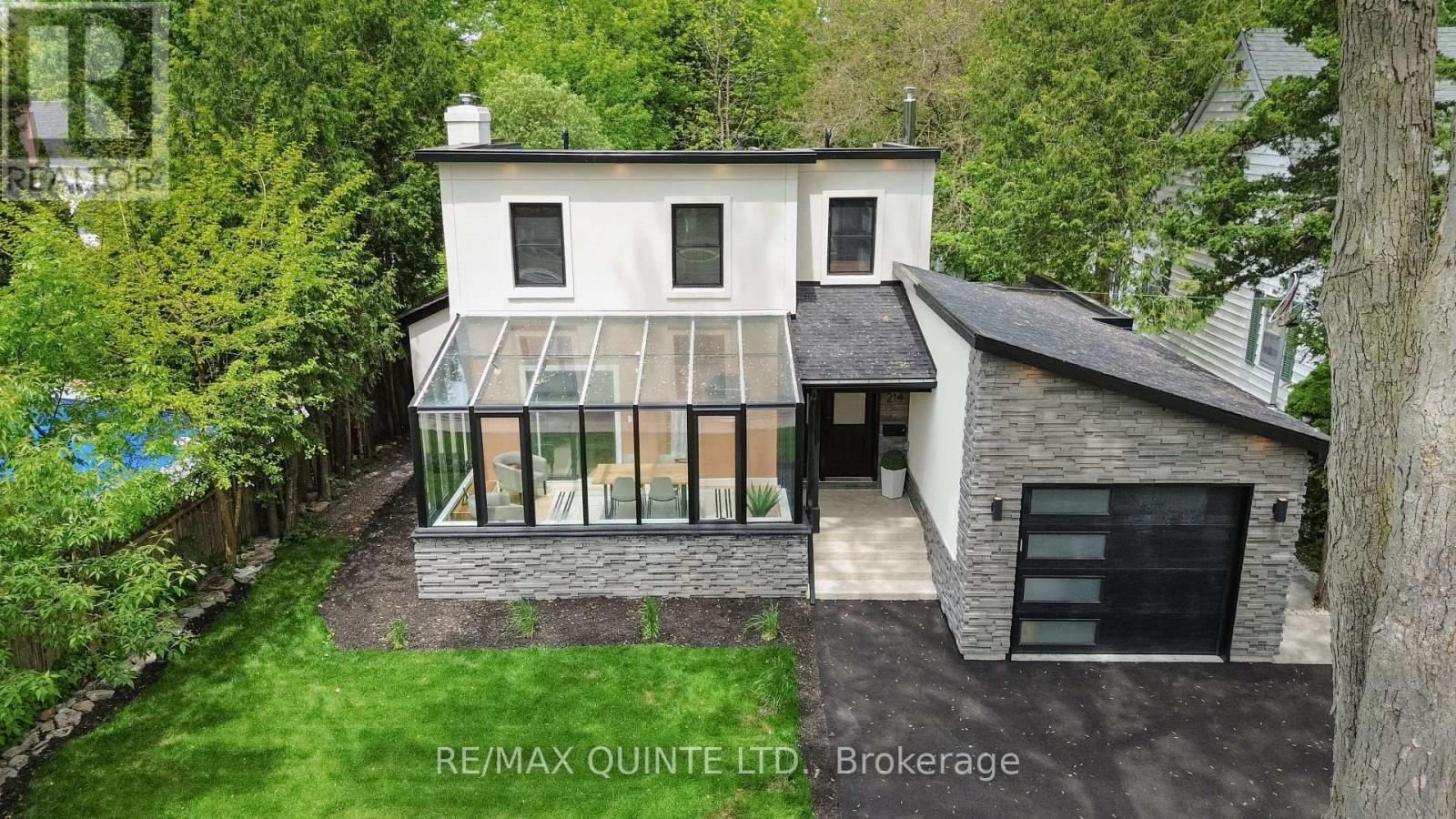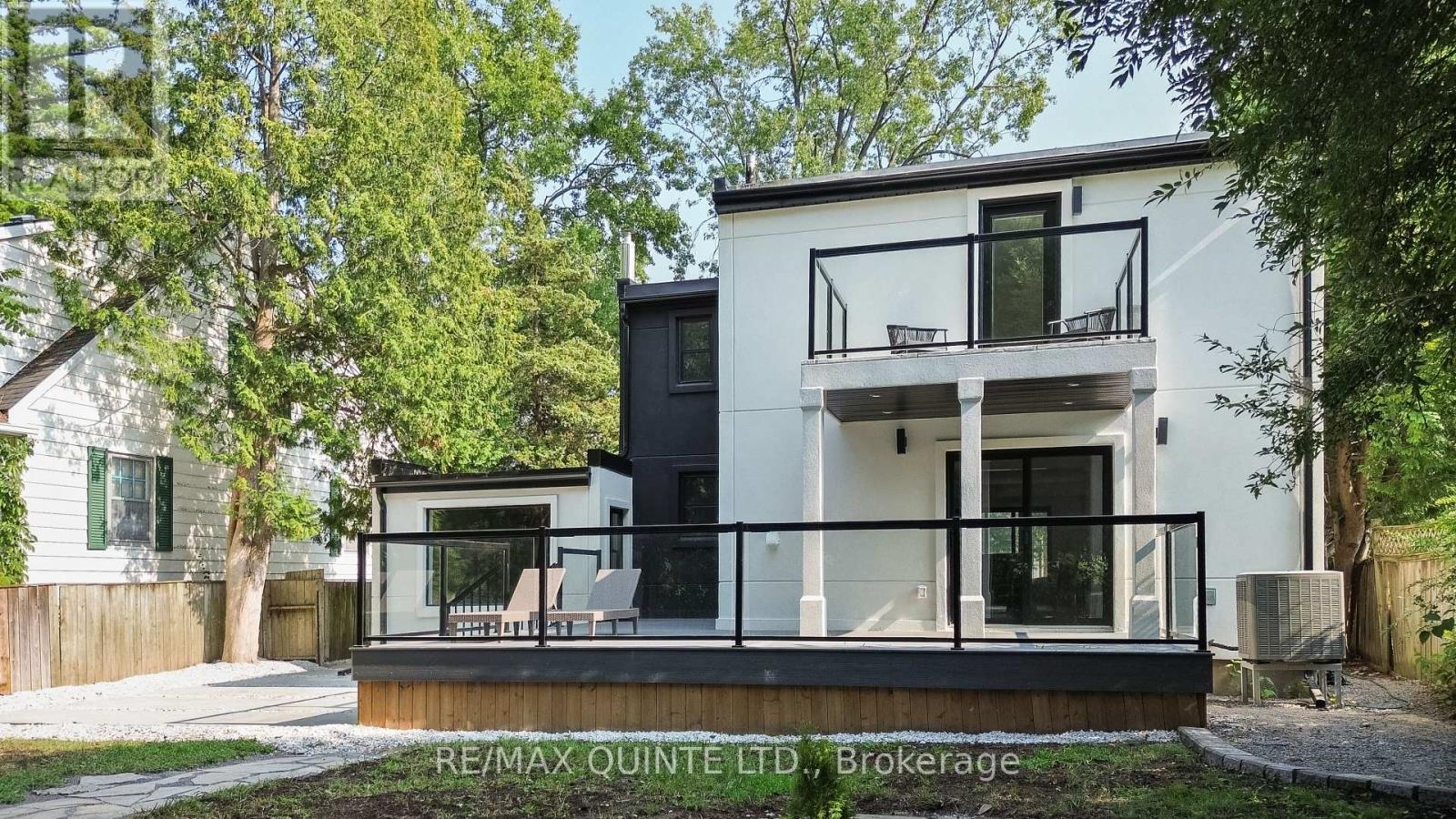 Stunning modern architectural home in the heart of Old East Hill, set on a private 175+ ft lot. Completely reimagined and thoughtfully renovated, this one-of-a-kind residence offers 3 bedrooms, 3.5 bathrooms, and multiple spaces designed for everyday living and entertaining. The striking stone and stucco exterior, attached garage, covered porch, and solarium create a bold first impression. Inside, the spacious kitchen steps down to a sunken living room with exposed beams, a gas fireplace, and oversized rear-facing windows that bring the outdoors in. A 2-piece bath and convenient laundry area are tucked away enroute to the open-concept living and dining area featuring modern lighting, a second gas fireplace, a wet bar, and access to the expansive composite deck with glass railings. Upstairs, all three bedrooms are paired with full bathrooms for ultimate convenience. The primary suite includes a walk-in closet, feature wall with sconce lighting, and a walkout to a private terrace overlooking the park-like backyard. Additional outdoor highlights include a lower-level concrete patio and steps wrapping around the eastside. Situated in one of Belleville's most sought-after neighbourhoods, this home stands out for its design, finishes, and exceptional setting. (id:51158)