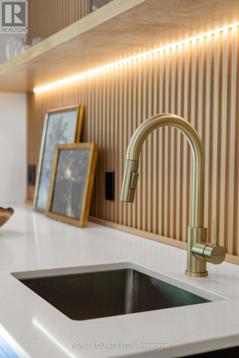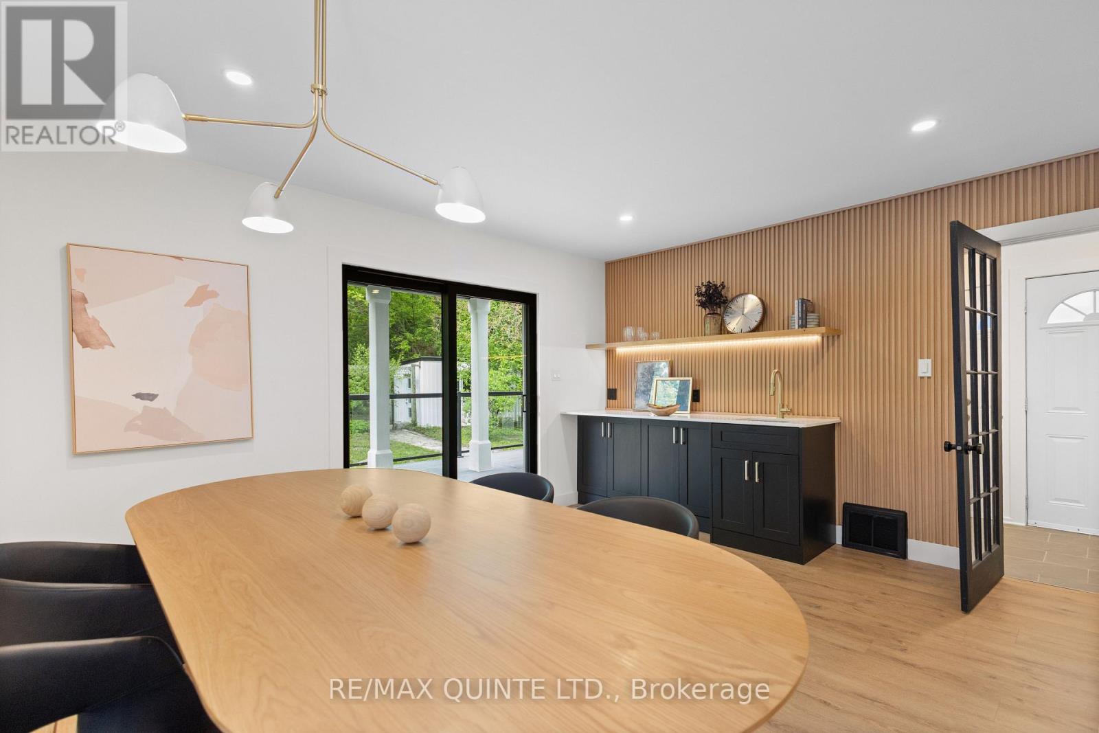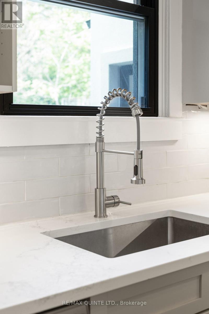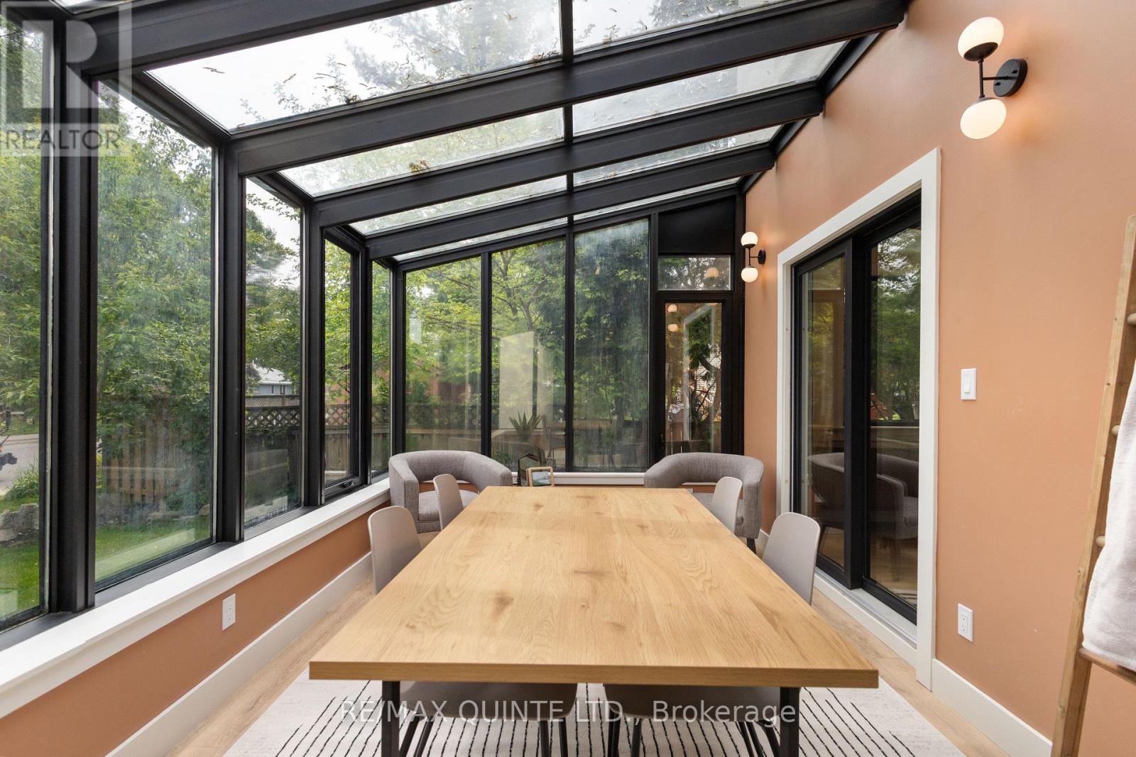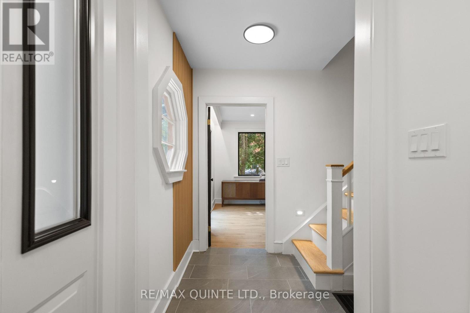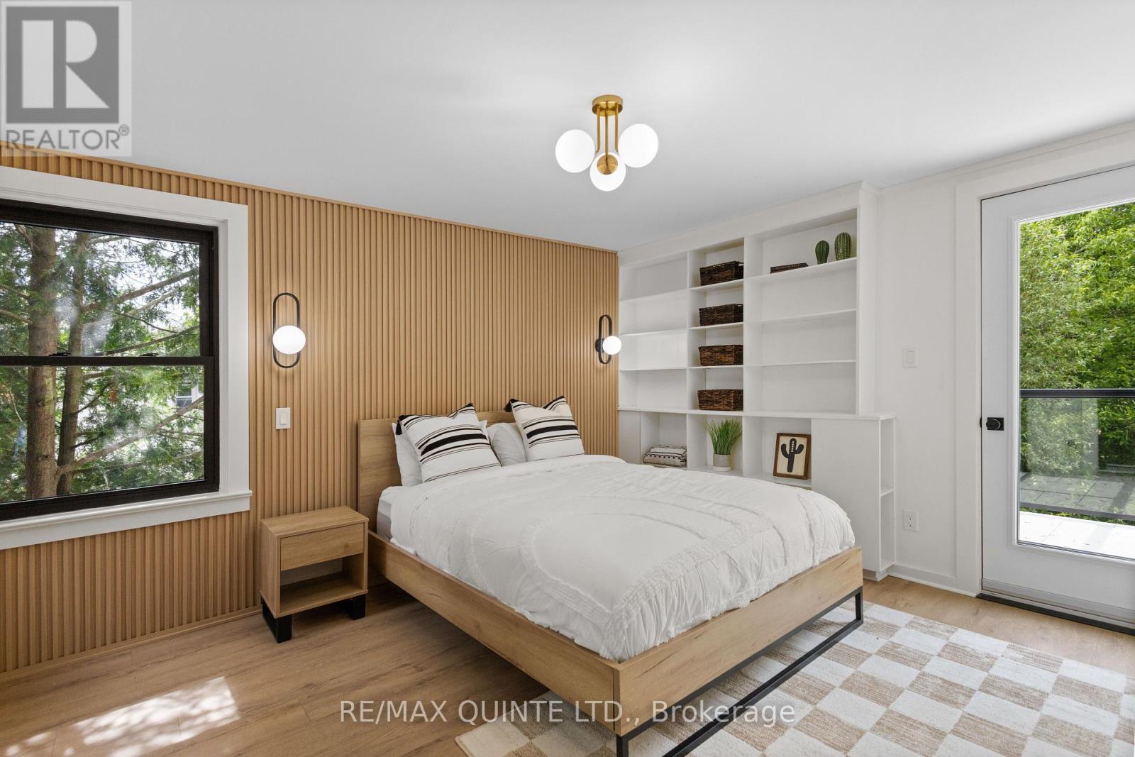 Stunning modern architectural home in the heart of Old East Hill, set on a private 175+ ft lot. Completely reimagined and thoughtfully renovated, this one-of-a-kind residence offers 3 bedrooms, 3.5 bathrooms, and multiple spaces designed for everyday living and entertaining. The striking stone and stucco exterior, attached garage, covered porch, and solarium create a bold first impression. Inside, the spacious kitchen steps down to a sunken living room with exposed beams, a gas fireplace, and oversized rear-facing windows that bring the outdoors in. A 2-piece bath and convenient laundry area are tucked away enroute to the open-concept living and dining area featuring modern lighting, a second gas fireplace, a wet bar, and access to the expansive composite deck with glass railings. Upstairs, all three bedrooms are paired with full bathrooms for ultimate convenience. The primary suite includes a walk-in closet, feature wall with sconce lighting, and a walkout to a private terrace overlooking the park-like backyard. Additional outdoor highlights include a lower-level concrete patio and steps wrapping around the eastside. Situated in one of Belleville's most sought-after neighbourhoods, this home stands out for its design, finishes, and exceptional setting. (id:51158)